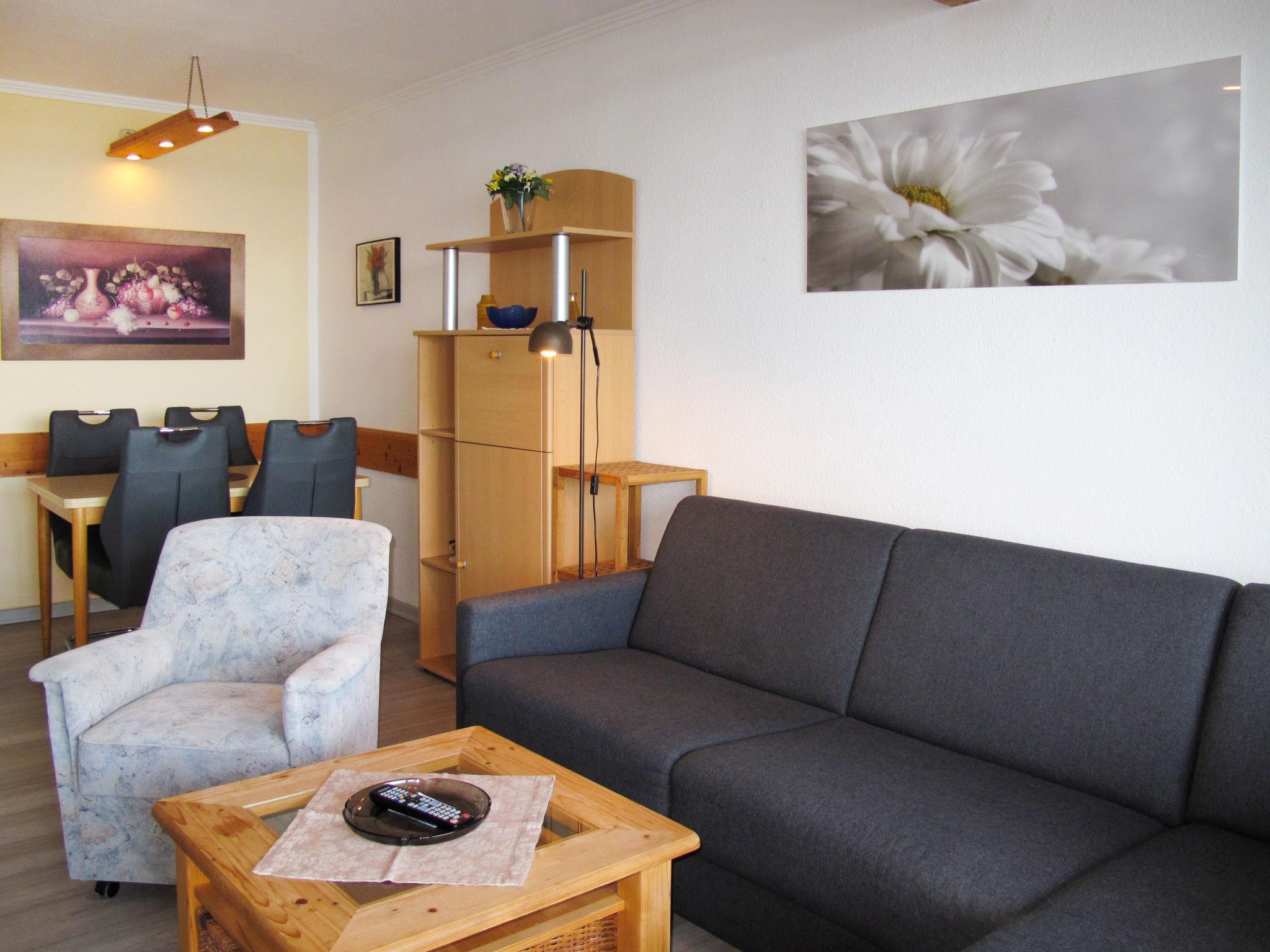 "Ostsee-Residenz (DMP153)", 2-room apartment 45 m2 on 7th floor. Cosy furnishings: living/sleeping room with 1 double sofabed (160 cm, length 200 cm), dining table, satellite TV, radio and CD-player. Exit to the balcony. 1 room with 2 beds and satellite TV. Open kitchen (oven, dishwasher, 4 ceramic glass hob hotplates, toaster, kettle, microwave, electric coffee machine). Shower/WC. Balcony furniture, box-room. Very beautiful view of the sea and the port. Facilities: children's high chair, baby cot. Internet (WiFi, free). Please note: non-smokers only. Maximum 1 pet/ dog allowed. Smoke alarm, fire extinguisher.