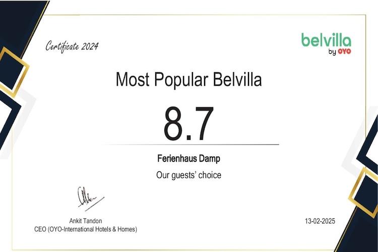 Kærligt indrettet ikke-ryger telt taghus med plads til 6 personer i ferieområdet i det populære feriested Damp ved Kielerbugten. Udover et fuldt udstyret køkken - inklusiv vaskemaskine - og et brusebadeværelse er huset udstyret med pejs og hyggelig opholdsstue. Interiøret var monteret med ægte træparket og klinker. På trappen er der fastgjort en børnesikring, som er lavet skridsikker med tæppefliser. Derudover indeholder huset børnevenligt udstyr, herunder rejseseng og højstol. Huset har en stor have, der byder på masser af plads at lege. En lille overdækket terrasse direkte ved huset og en ekstra terrasse, som er særdeles velegnet til at grille, fuldender tilbuddet af dette indbydende feriehus. Stranden og havnen ligger kun 600 meter fra den nydesignede Damp-feriepark, der ligger på en af de smukkeste strande i Østersøen. Der er en parkeringsplads til en bil foran huset og cykler kan også parkeres der. Mod et tillæg kan du benytte de mangfoldige og spændende faciliteter, såsom havvandspoolen og wellness-området i det nærliggende feriecenter. Der er også en indendørs legeplads, en bowlingbane, et vandskianlæg og en minigolfbane mod betaling. Ostseebad Damp ligger 16 km nordøst for Eckernfoerde på Schwansen-halvøen, mellem Eckernfoerder-bugten og Schlei. Damp ligger direkte på den smukke, 4 km lange sandstrand. Der er også en actionstrand med spil, en hundestrand og en nudiststrand. Strandstole kan lejes på stedet. Der er cirka 50 km til Slesvig-Holstens delstatshovedstad, Kiel. Aktiviteter i nærheden: Sjov for hele familien er garanteret ved et besøg i den fugtige opdagelsespool, hvor børn er velkomne gæster, med udsigt over Østersøen. Fra et kæmpe arrangementsrutsjebane med lysprojektion over saunalandskabet, Sa