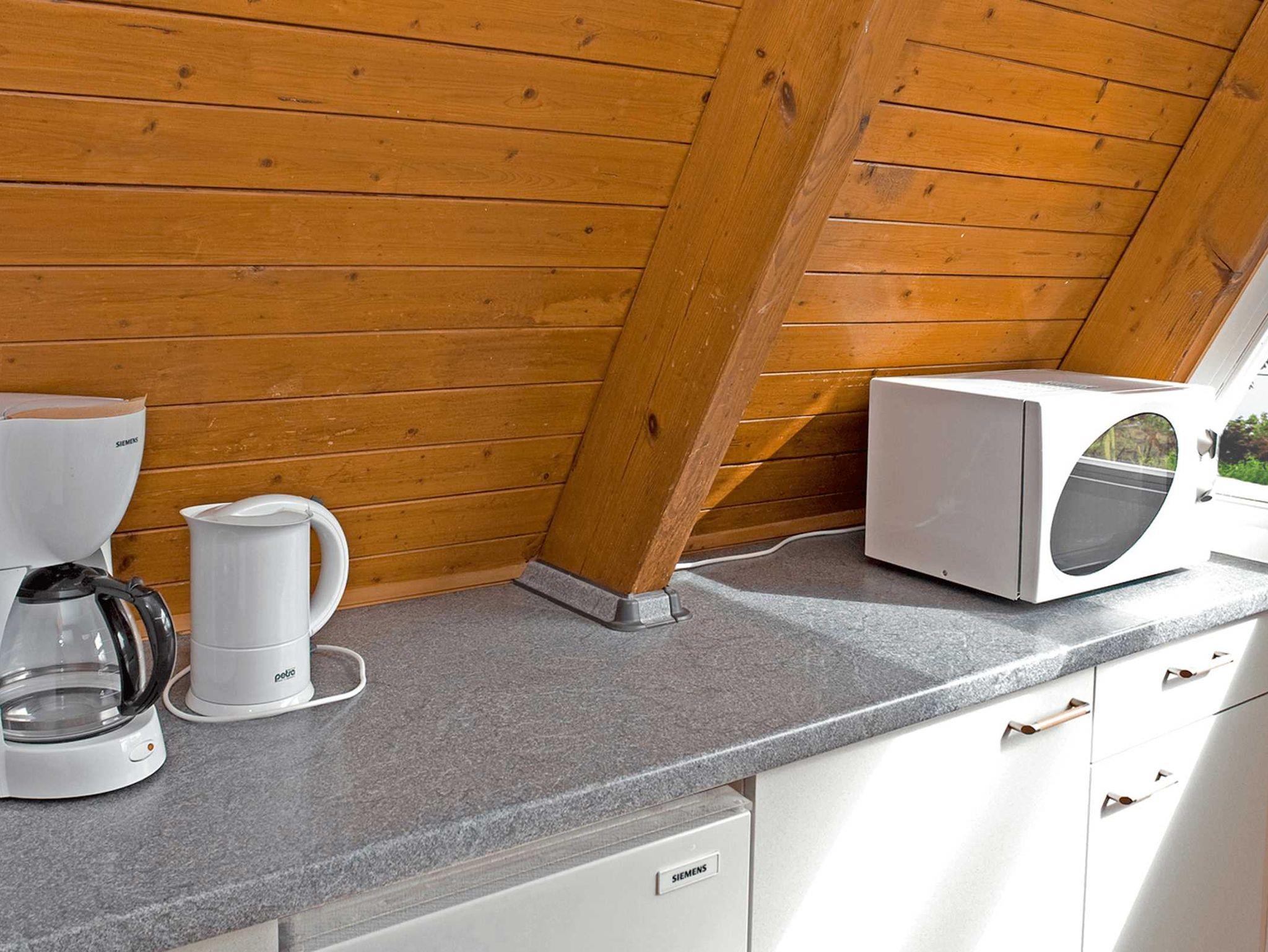? Küche mit Kühlschrank, Herd, Backofen, Mikrowelle, Geschirrspüler und Kaffeemaschine