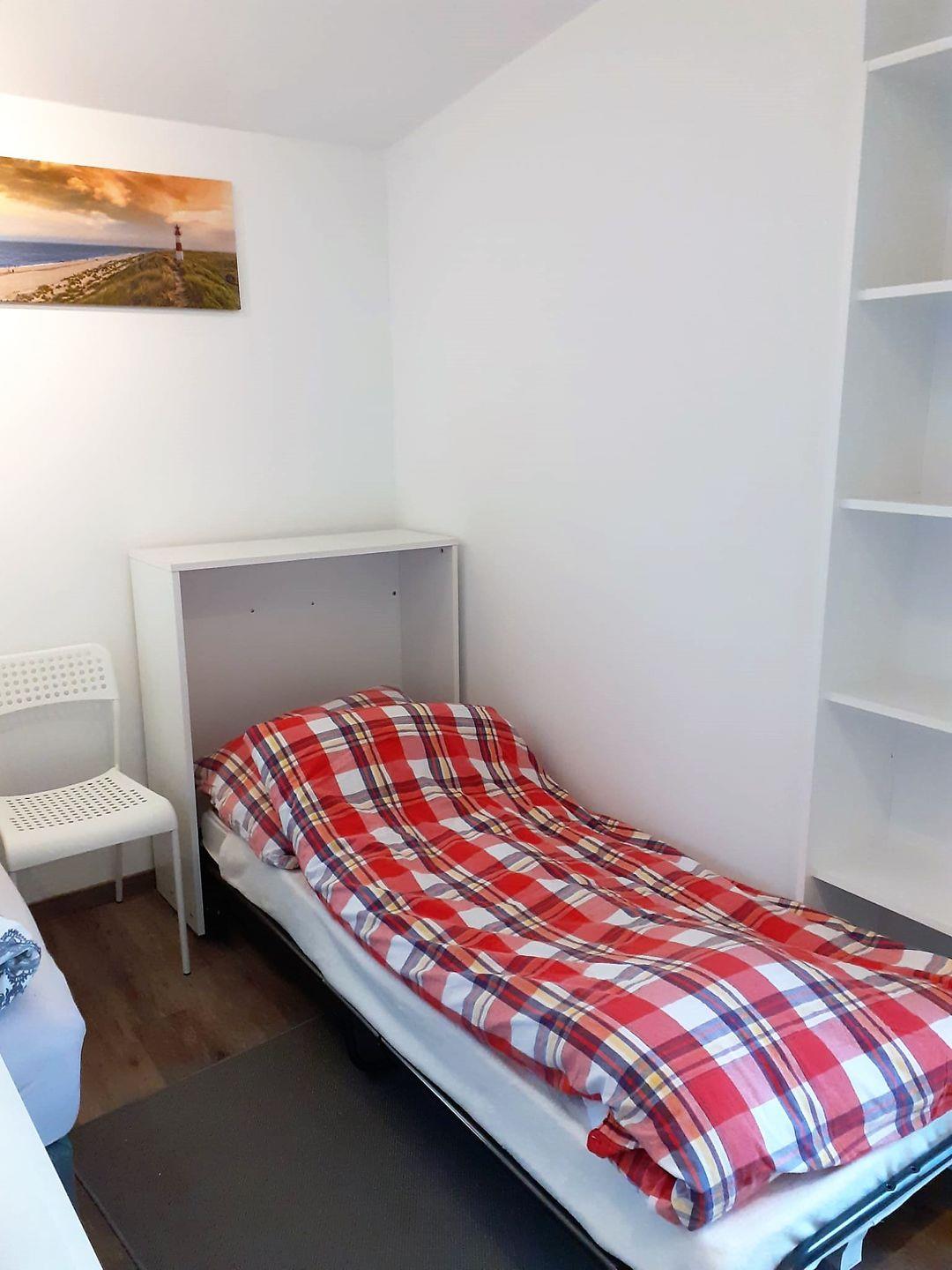 Die beiden Schlafzimmer,eines mit Doppelbett(140x200) und eines mit zwei Einzelbetten, die bei Bedarf zum Doppelbett zusammengestellt werden können, sowie das Bad mit Dusche befinden sich im hinteren Teil des Hauses und können durch eine Tür vom Wohnbereich getrennt werden, sodass Sie hier Ihren Rückzugsort für absolute Ruhe finden.