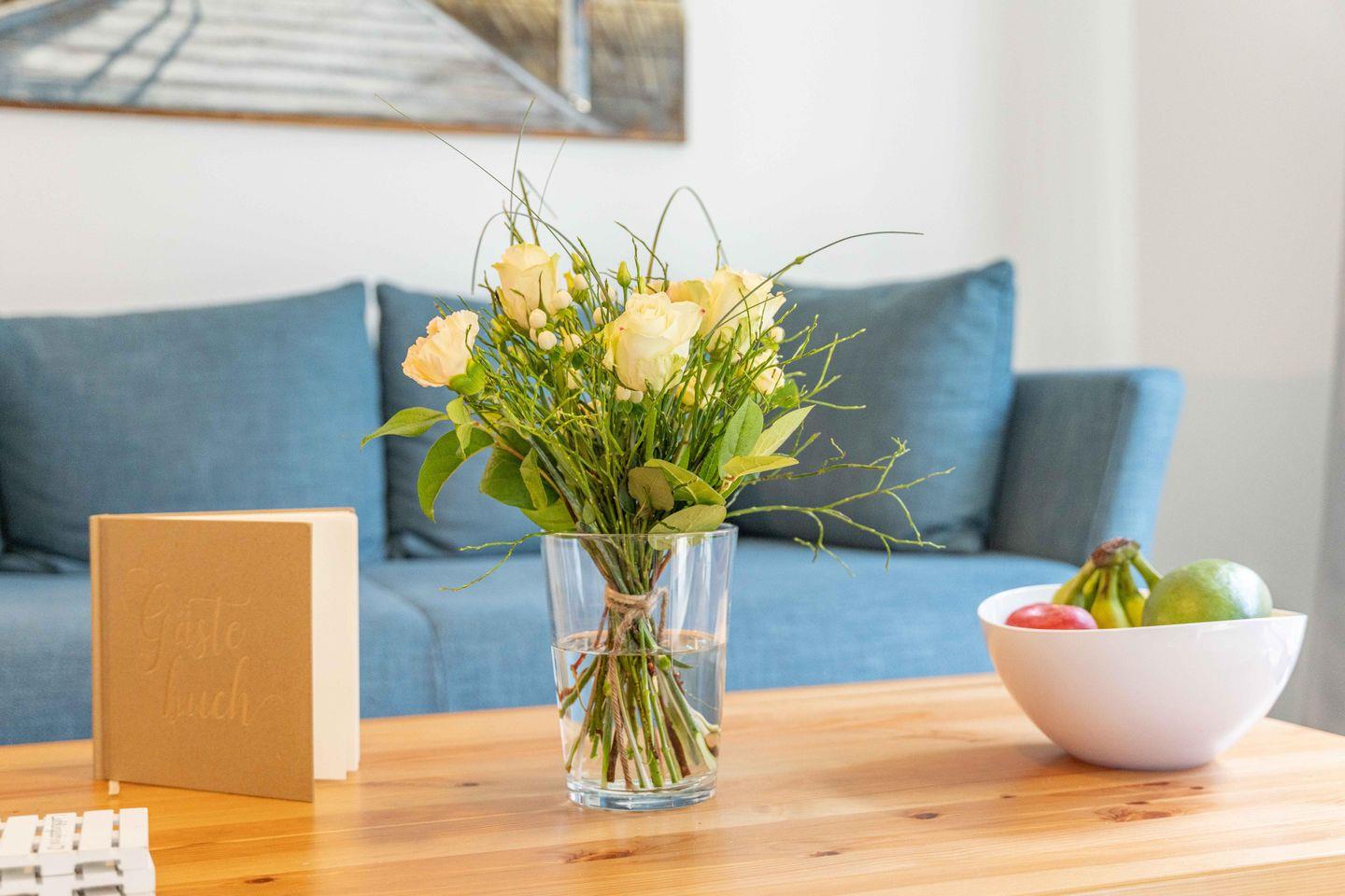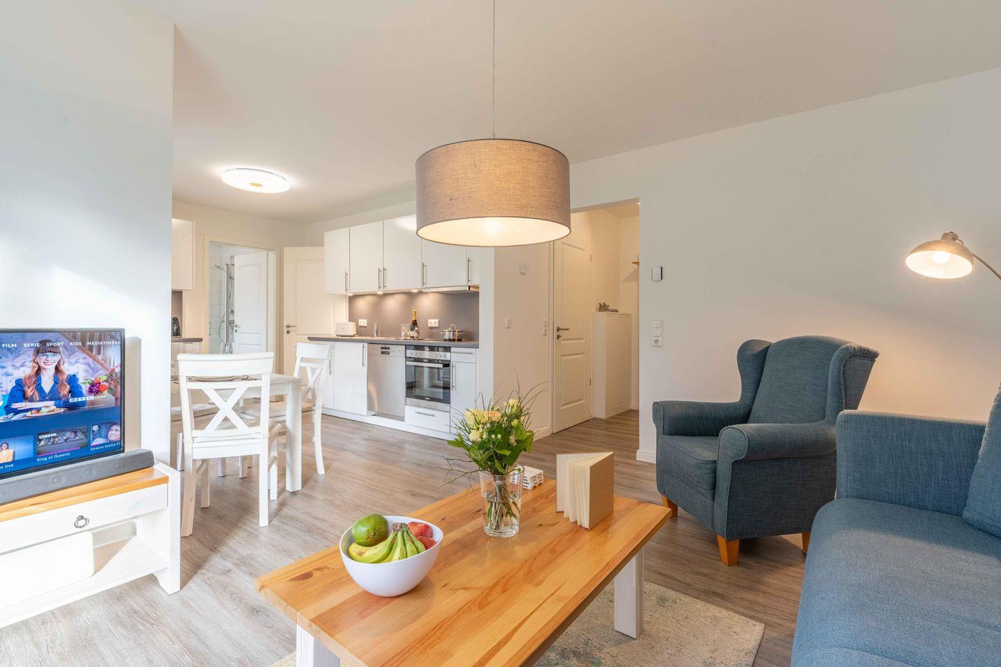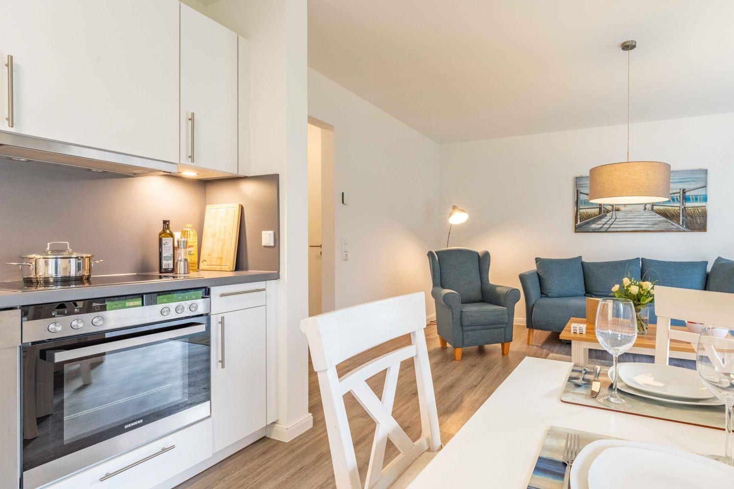 Die hochwertige Ausstattung der Ferienwohnung lässt keine Wünsche offen. Eine vollständig eingerichtete, offene Küche, die direkt in den Wohnbereich übergeht, verfügt unter anderem über einen Backofen, Geschirrspüler, einen Kühlschrank mit Gefrierfach sowie zahlreiche Küchengeräte wie eine Kaffeemaschine, einen Wasserkocher, einen Toaster und eine Espressomaschine. Hier kannst Du hervorragend selbst für Dein leibliches Wohl sorgen, während Du Dich im gemütlichen Essbereich zusammenfindest.