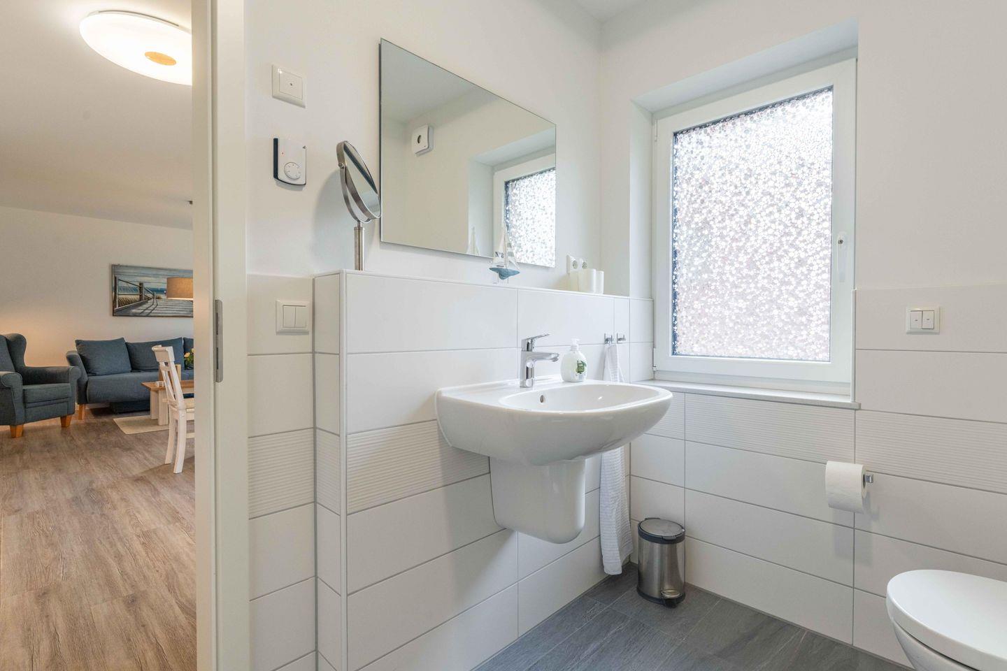 Das Badezimmer der Wohnung ist mit einer bodengleichen Dusche, einem Waschbecken und einem WC ausgestattet. Ein Haartrockner sowie ein Kosmetikspiegel runden den Komfort ab. Zur weiteren Ausstattung gehören eine Waschmaschine, eine Fußbodenheizung und WLAN, die Dir zusätzlichen Komfort bieten. Ein Highlight der Wohnung ist die überdachte, nach Westen ausgerichtete Terrasse, die Dir den perfekten Platz bietet, um es Dir gemütlich zu machen und die Sonne zu genießen. Ein privater Parkplatz, der zur Wohnung gehört, ermöglicht Dir, Dein Fahrzeug sicher abzustellen.