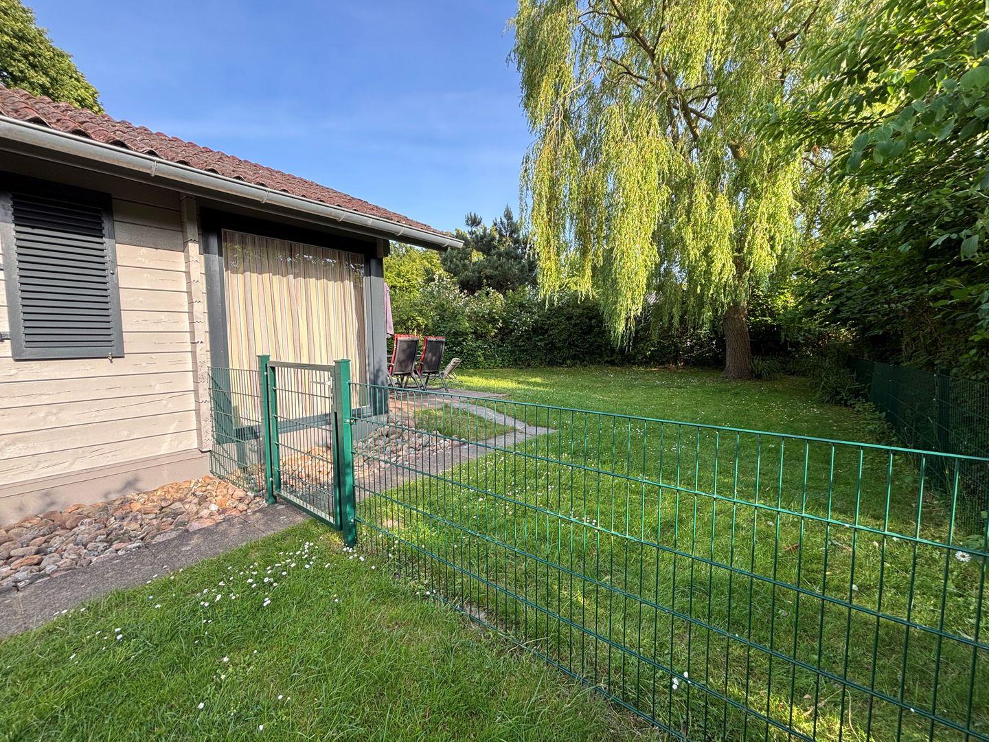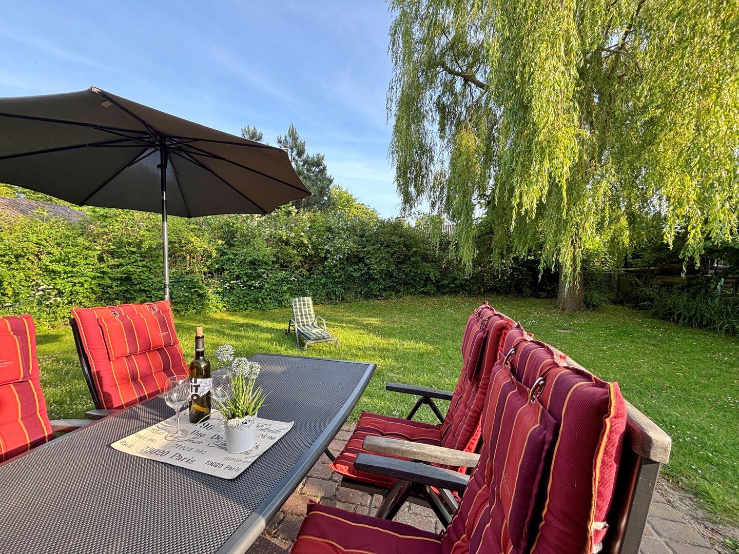 Ein Highlight ist der große, eingezäunte Garten mit sonniger Terrasse – ideal zum Spielen, Toben und Entspannen. Bis zu zwei Hunde sind willkommen. Der Hundestrand am Südstrand ist nur wenige Minuten entfernt.