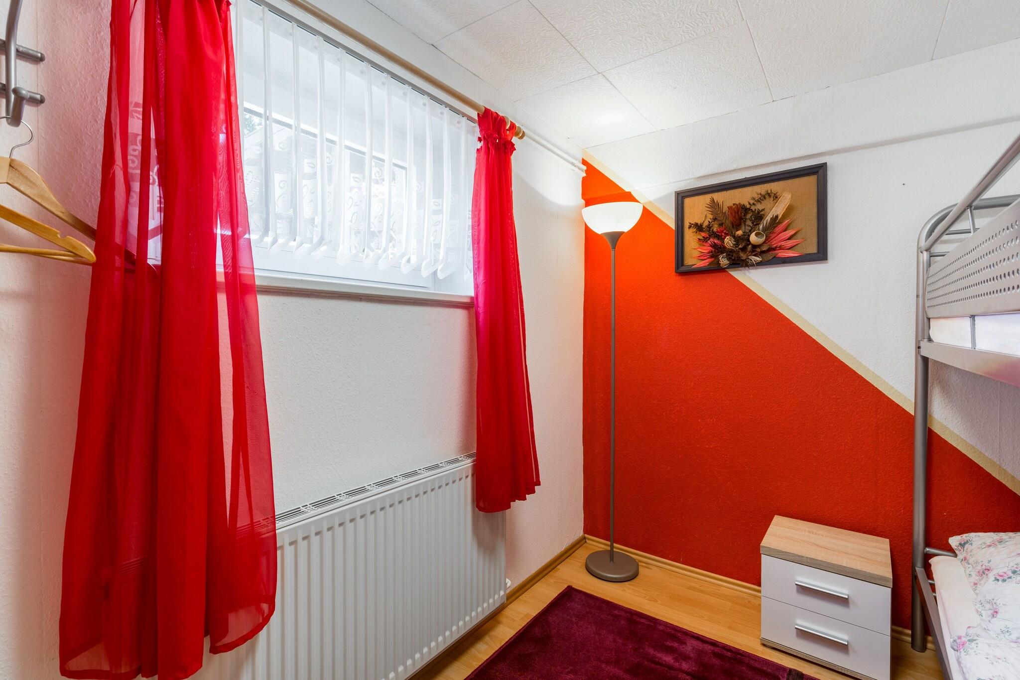 Kælderetage: (Indgang (adgang udefra), åbent køkken(spisebord, elkedel, brødrister, komfur(Komfur med to kogeplader), kaffemaskine, ovn, køleskab(+ fryser)), Stue/soveværelse(dobbeltseng, Fjernsyn, sofahjørne, radio), soveværelse(køjeseng), badeværelse(bruser, håndvask, toilet), varme, barneseng) terrasse(indhegnet), cykelopbevaring, havemøbler, grill, parkering