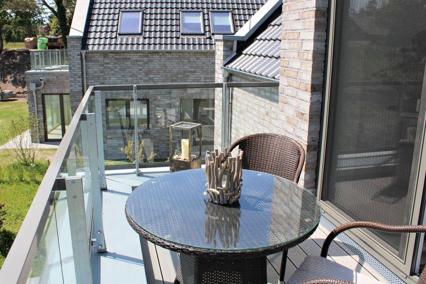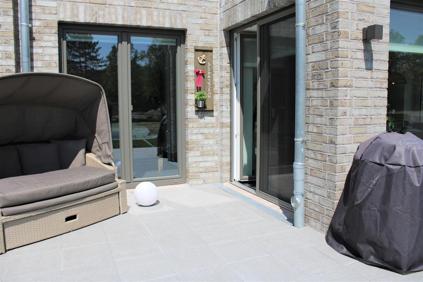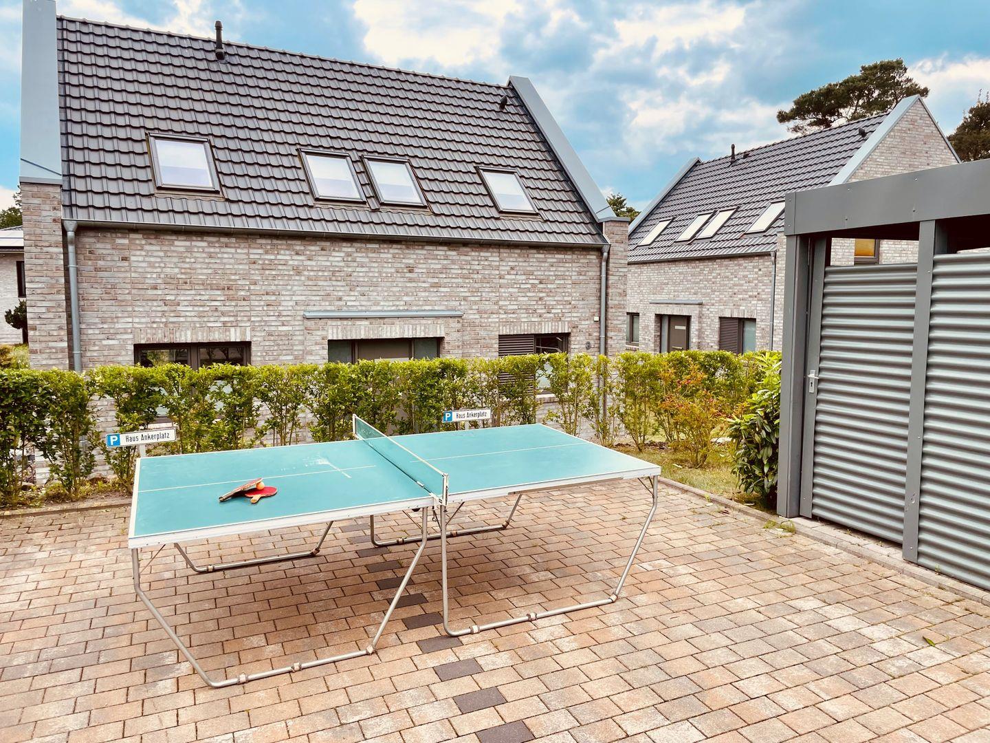 (Süd-)Terrasse mit Tisch und Stühlen für 6 Personen, Südbalkon mit Tisch und 2 Stühlen, Doppelsonnenliege, Lounge Sitzmöglichkeit, 1 Bollerwagen, Holzkohlegrill, elektrische Sonnenmarkise, Tischtennisplatte mit Zubehör