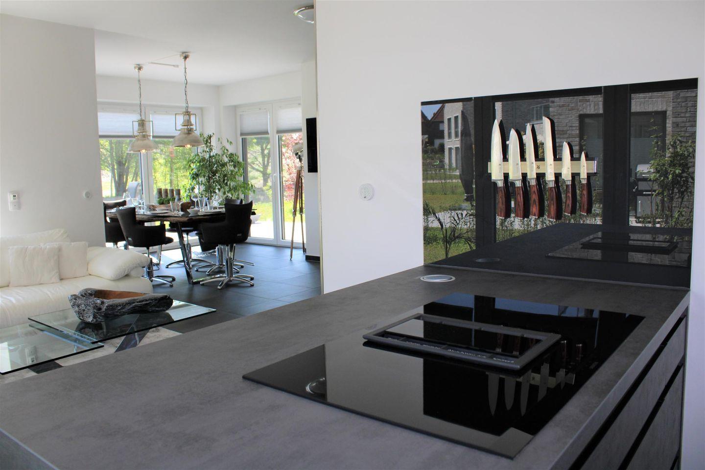 offene Einbauküche, Kühlschrank mit Gefrierfach, 4-Zonen Induktionskochfeld, Backofen, Dunstabzug, Mikrowelle, Geschirrspüler, Filterkaffeemaschine, Toaster, Wasserkocher, Töpfe, Pfannen, Geschirr, Besteck und Gläser