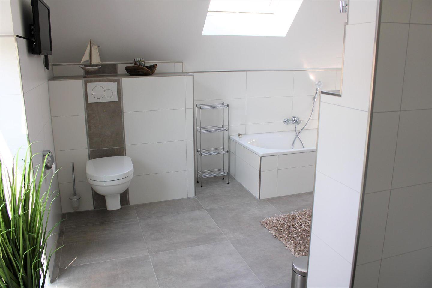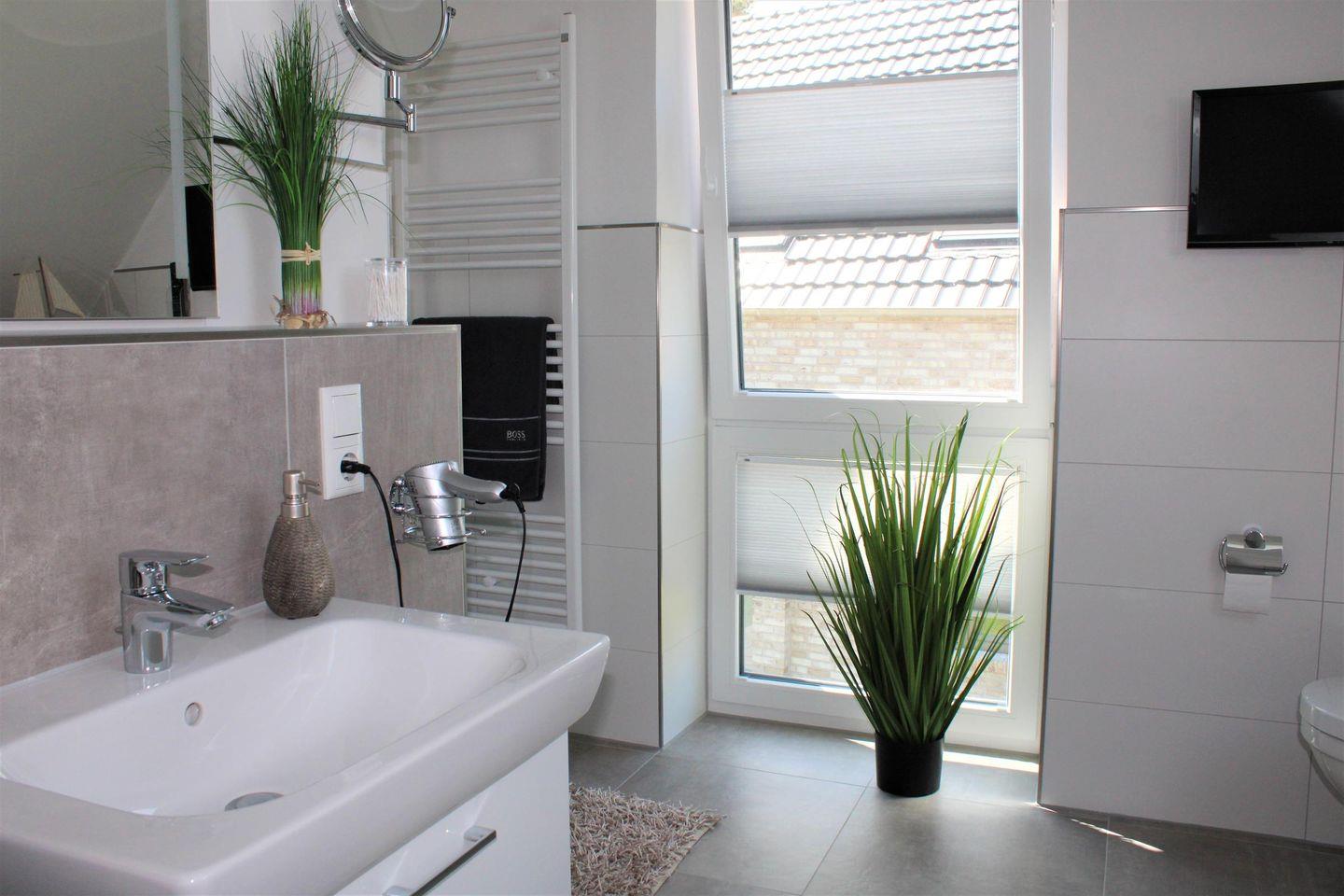 bodentiefe, barrierefreie Sommerregendusche mit großer Sitz-/Ablagemöglichkeit, Badewanne, Waschtischanlage mit Spiegel, WC, Handtuchheizung, Föhn, Abstellflächen, Handtuchhaken und Fernseher