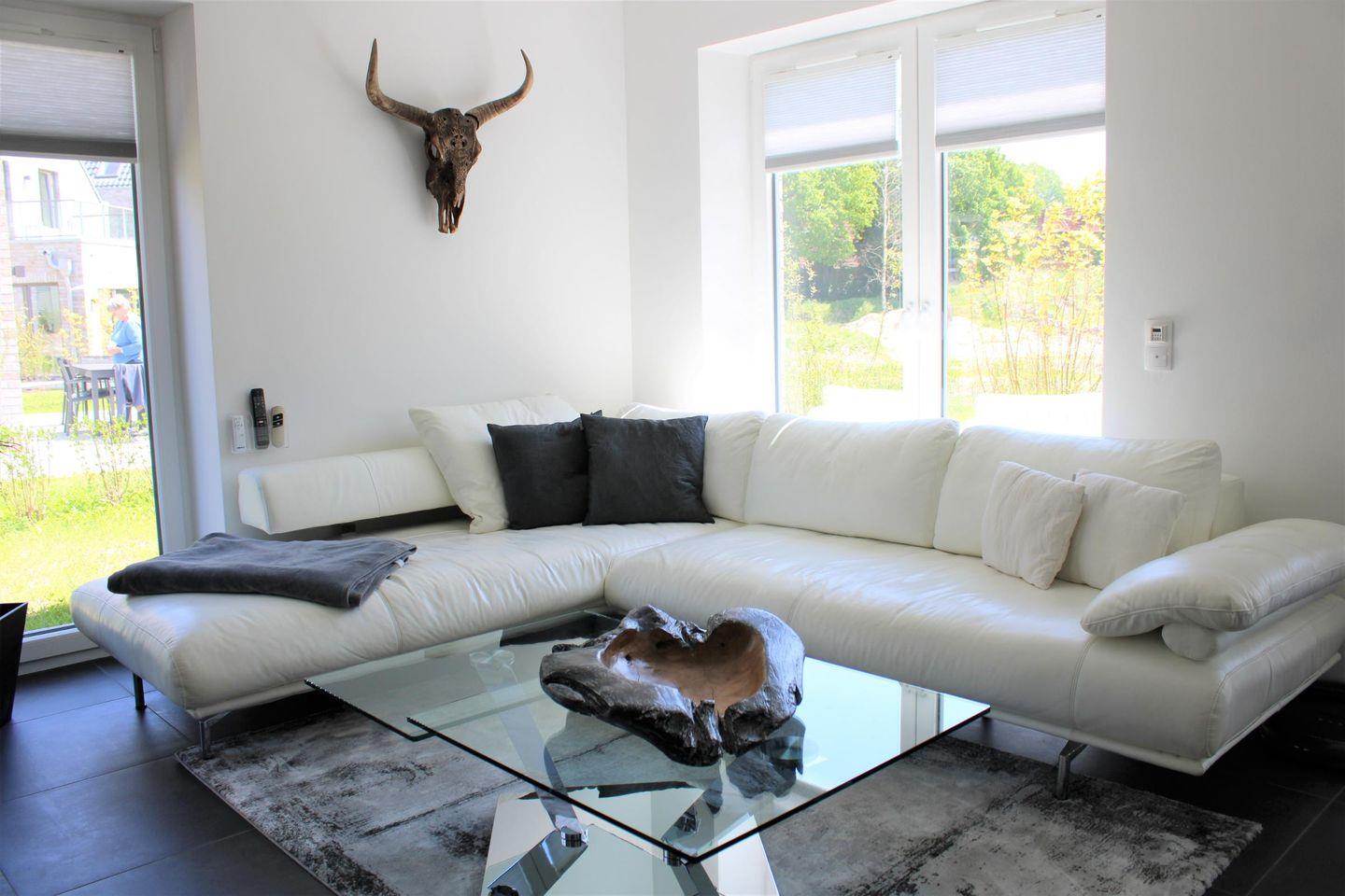 Ledersofa, Couchtisch, Flachbildfernseher, Smart- TV