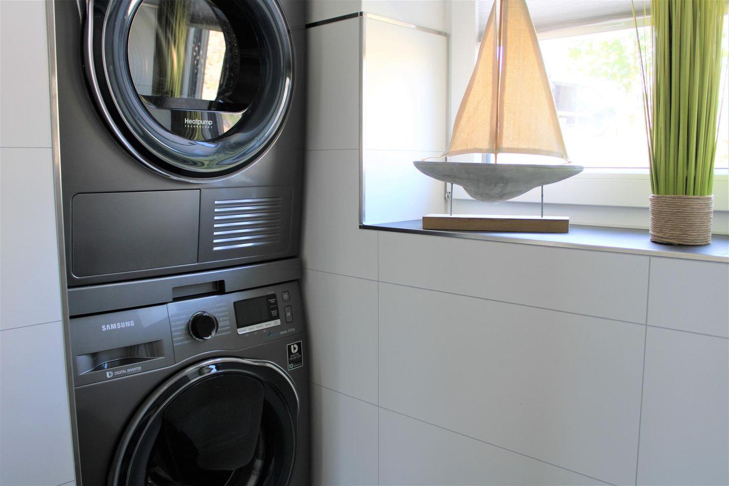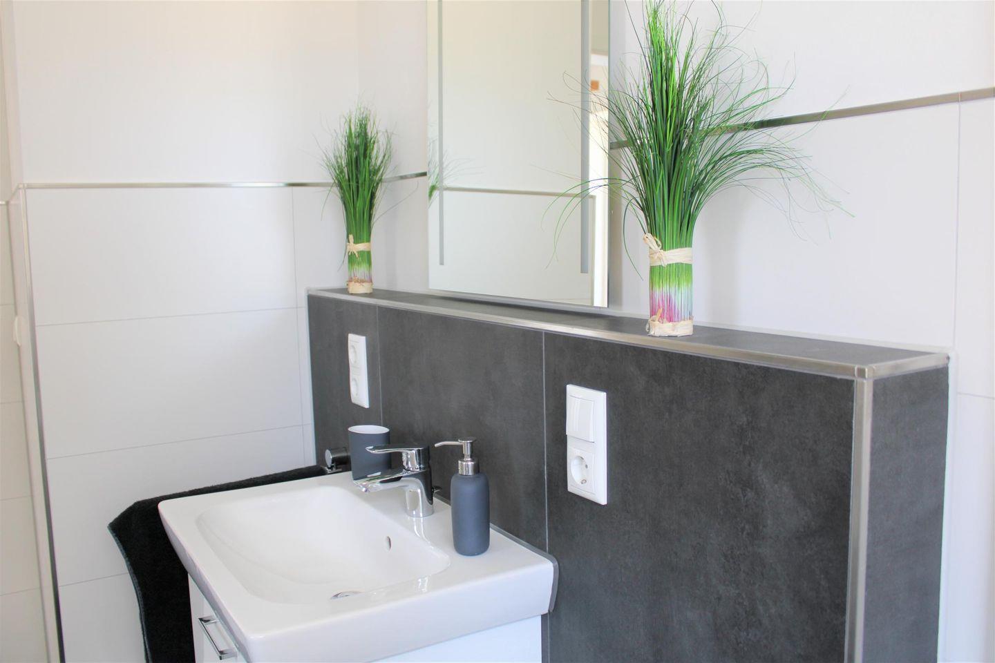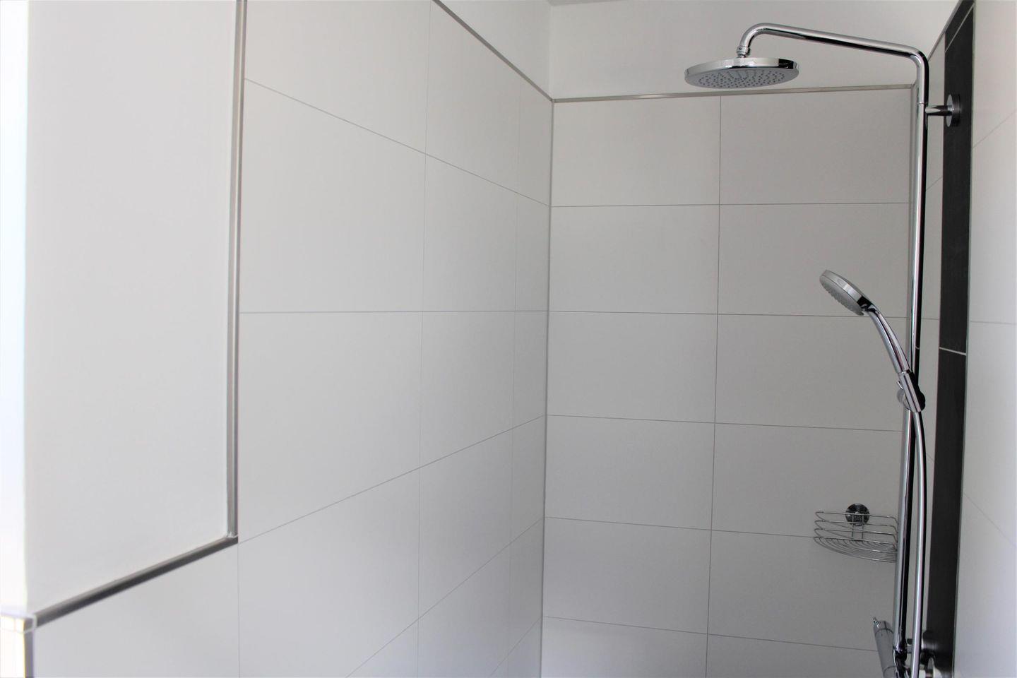 En Suite, bodentiefe , barrierefreie Sommerregendusche mit großer Sitz- und Ablagemöglichkeit, Handtuchheizung, Waschtischanlage mit Spiegel, WC, Waschmaschine, Trockner,