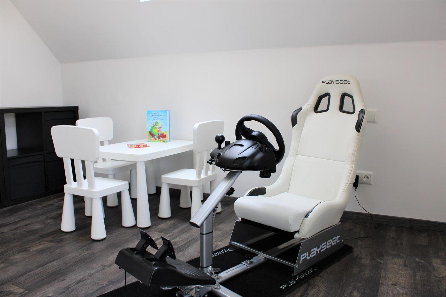 Regal mit verschiedenen Spielen, Büchern, Fernseher mit Spielekonsole inkl. Rennsitz, PS4 und verschiedene Spiele