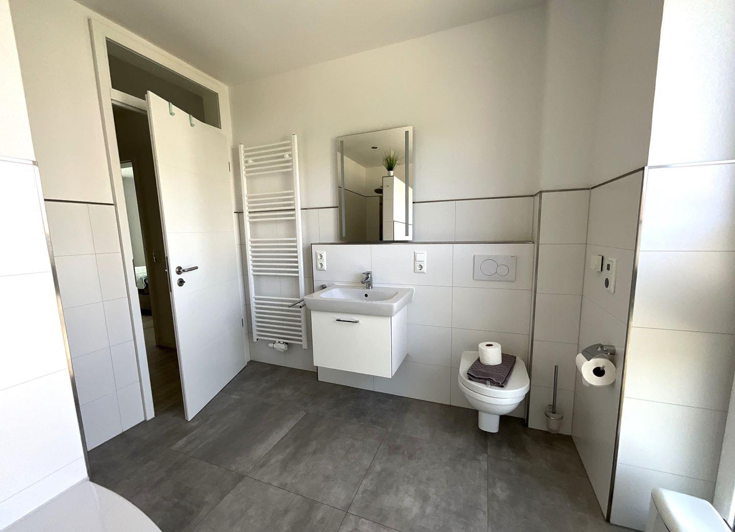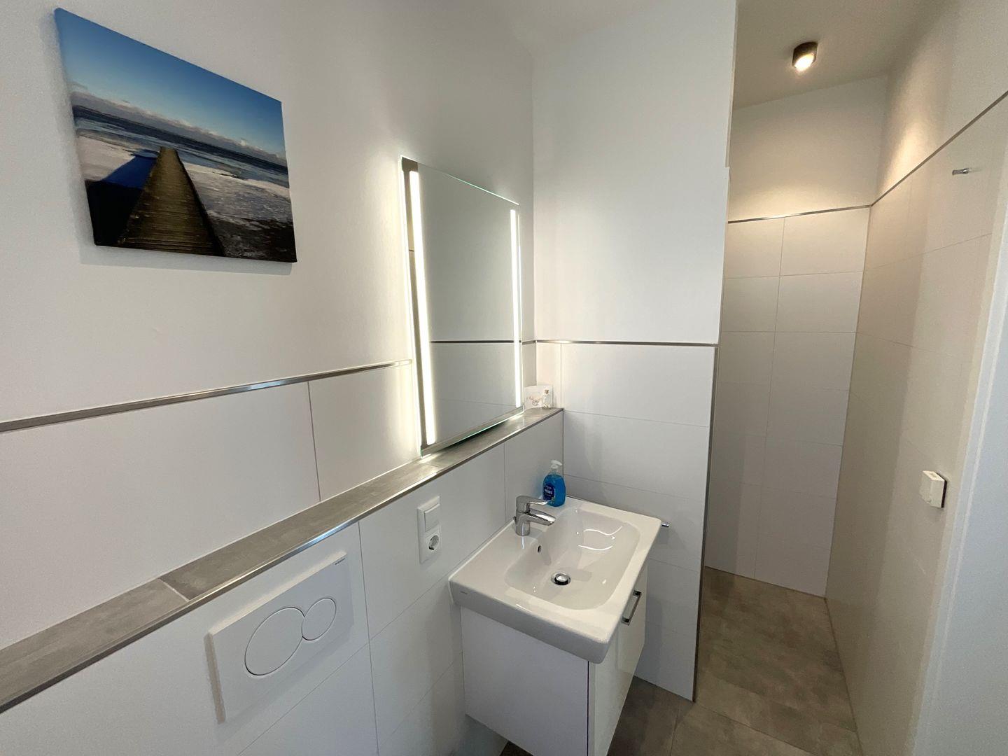 Bad und Sanitär im 1. OG: bodentiefe, barrierefreie Sommerregendusche, Badewanne, Waschtischanlage mit Spiegel, WC, Handtuchheizung, Föhn, Handtücher auf Anfrage