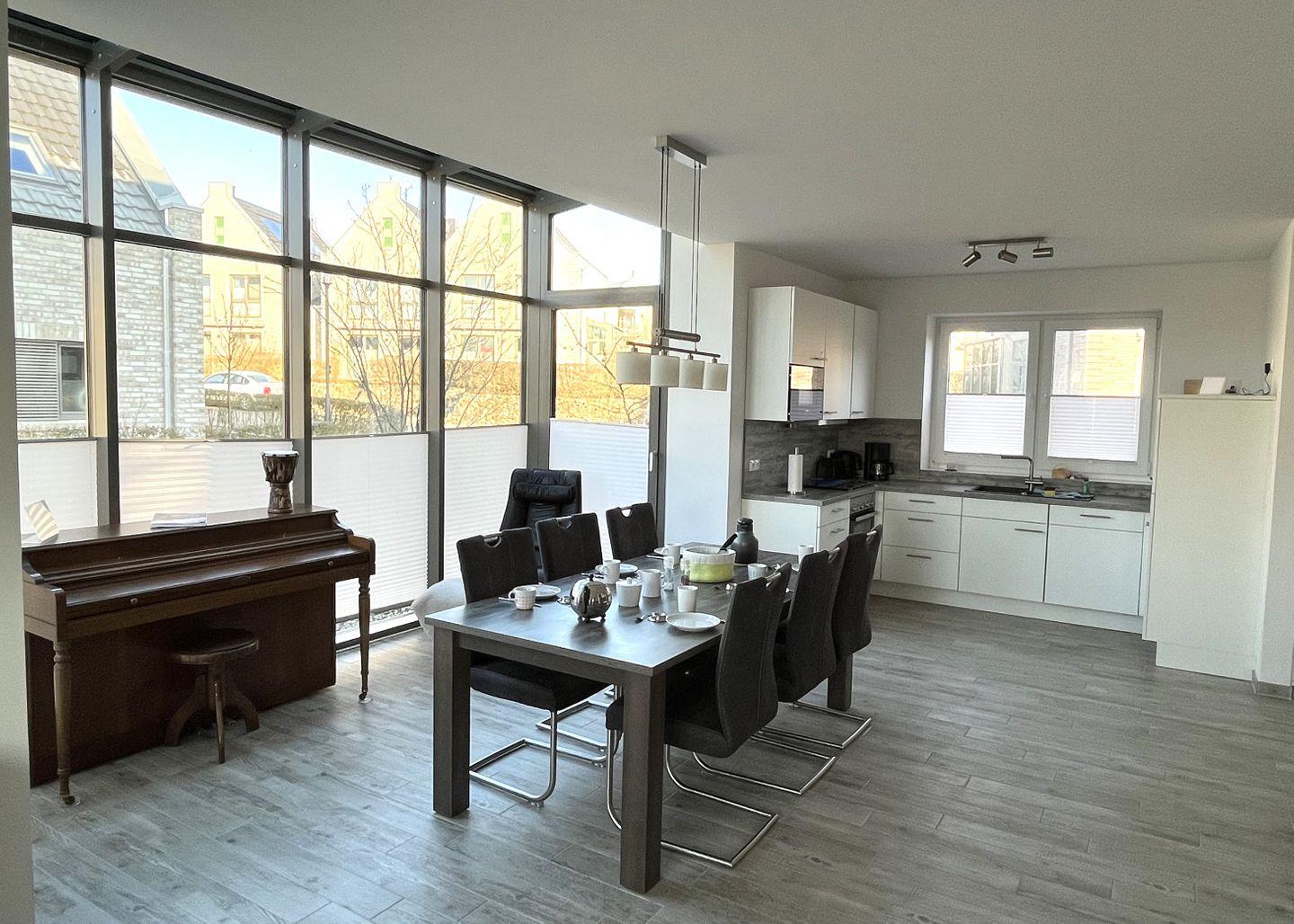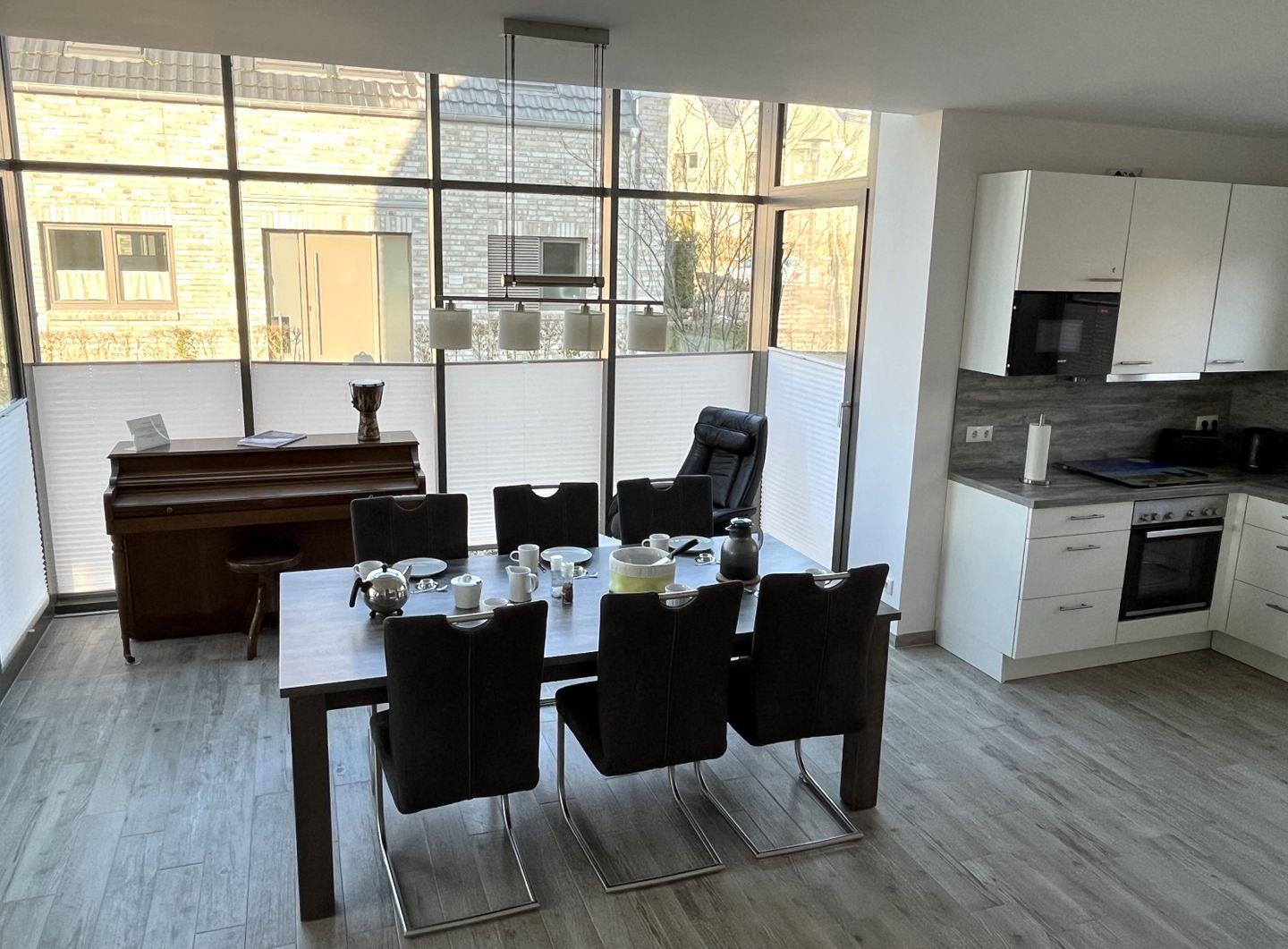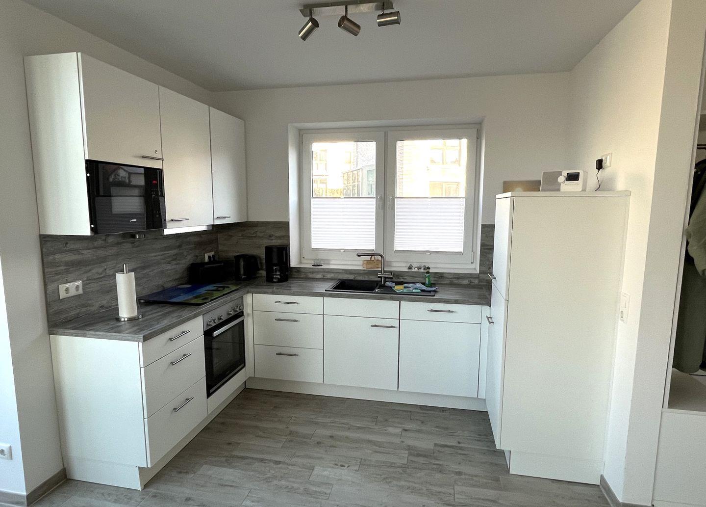 Küche und Haushalt: Einbauküche, Kühlschrank mit Gefrierfach, 4-Zonen Cerankochfeld, Backofen, Dunstabzugshaube, Mikrowelle, Geschirrspüler, Kaffeefiltermaschine, Toaster, Wasserkocher, hochwertiges Geschirr und Besteck
