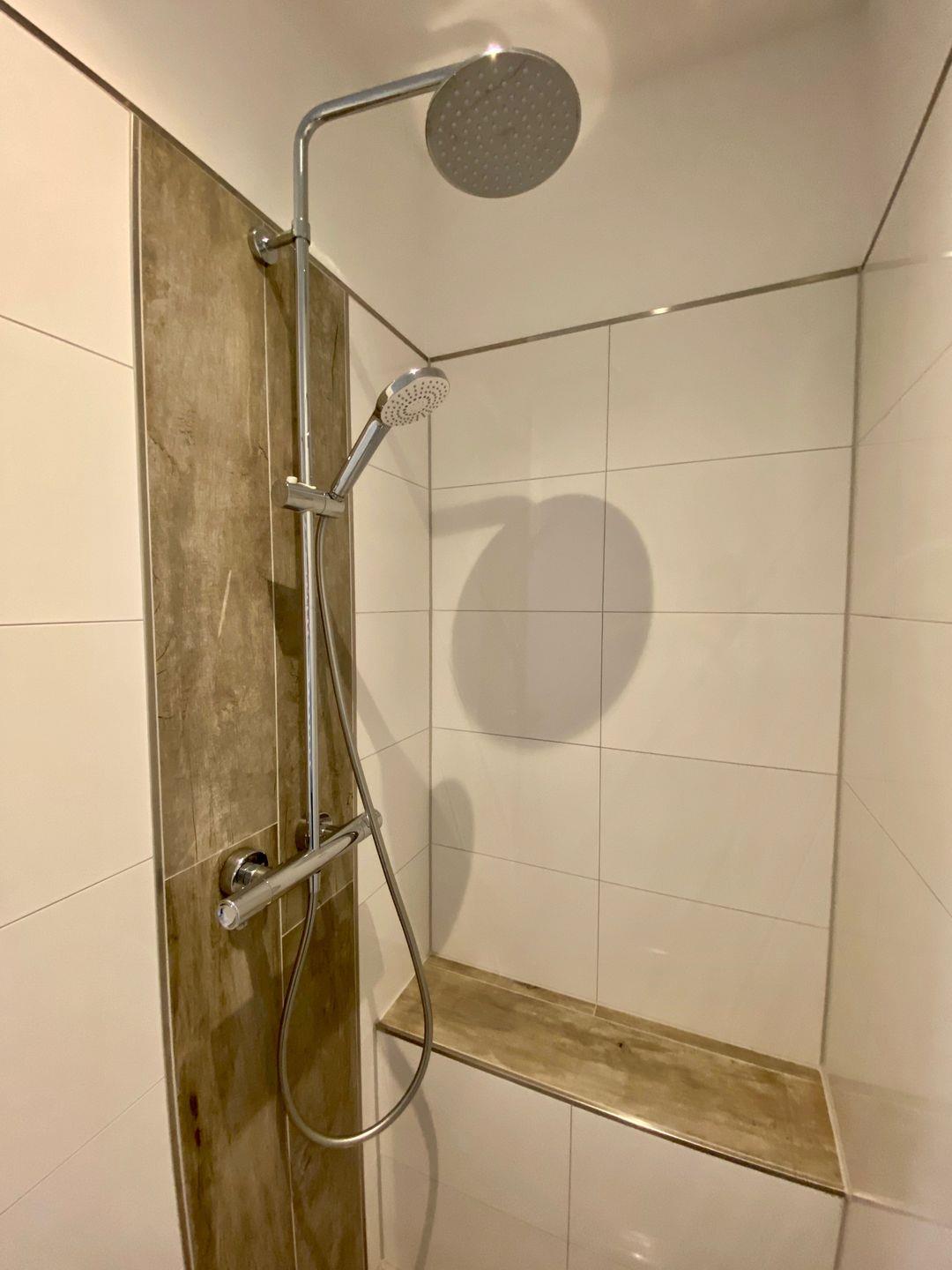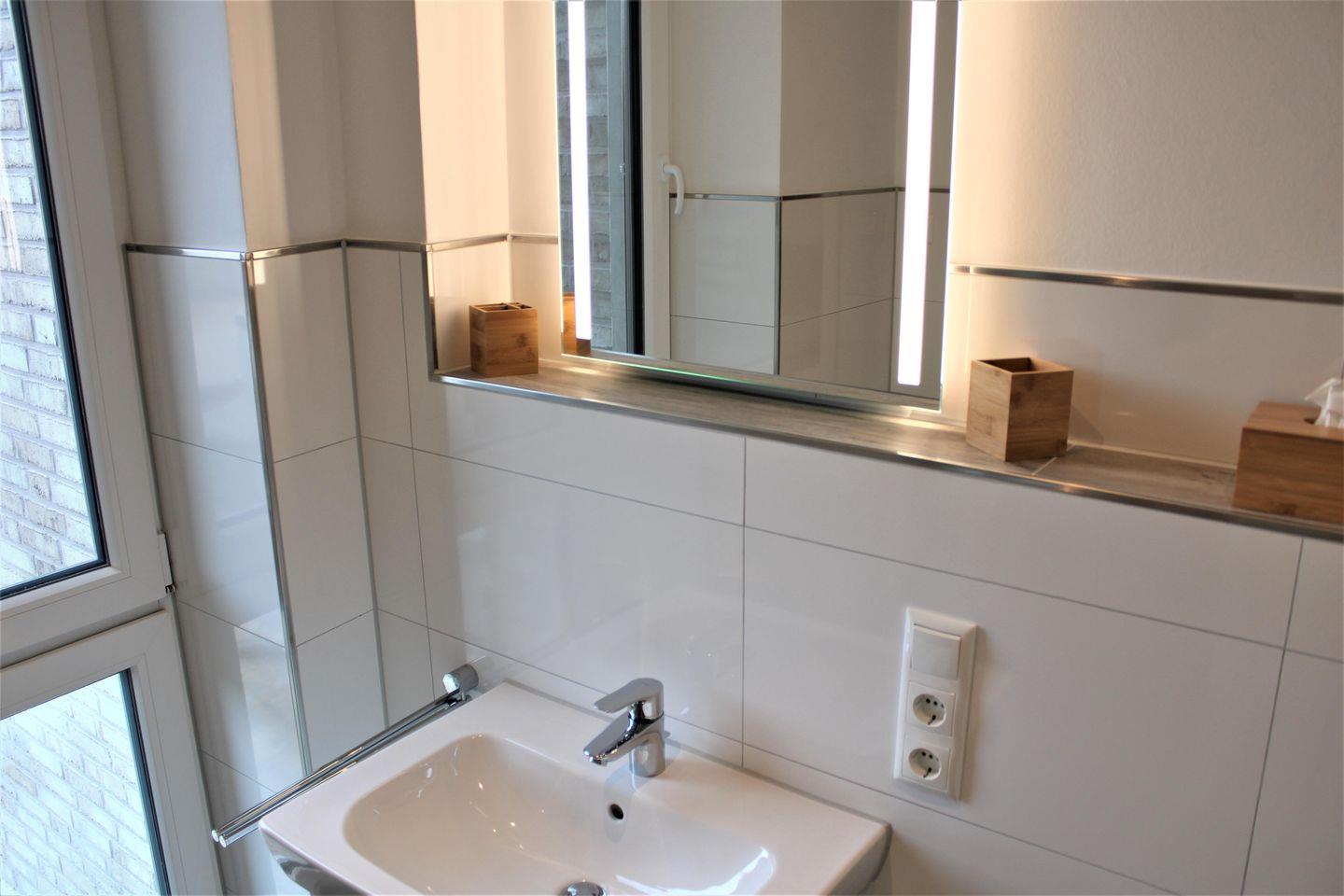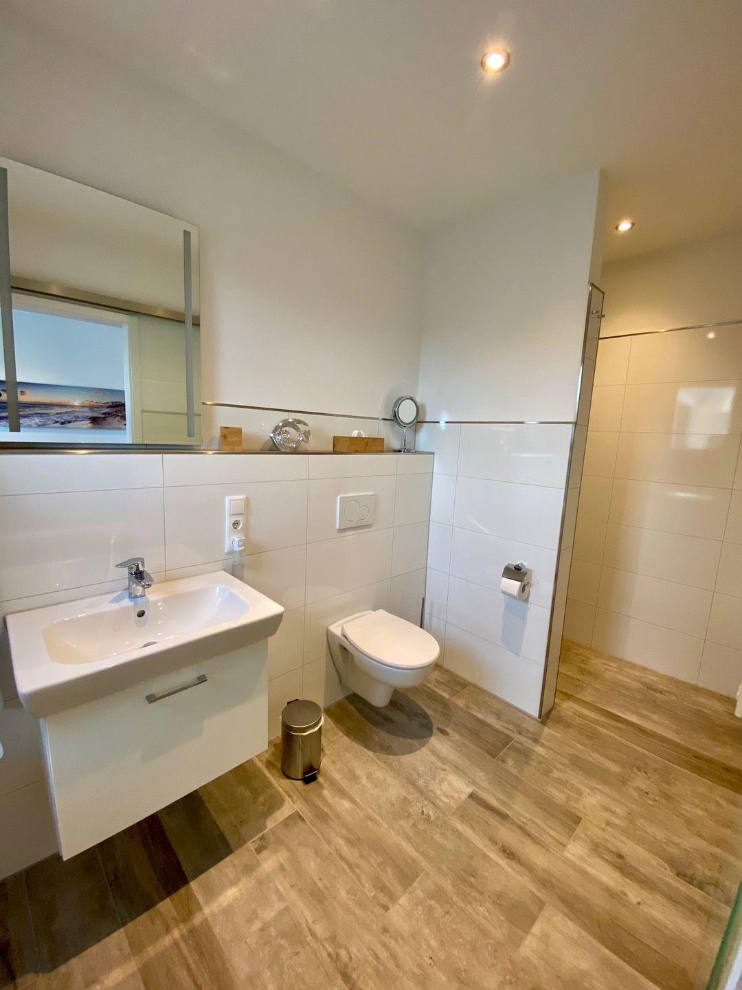 Bad und Sanitär: bodentiefe, barrierefreie Sommerregendusche, Waschtischanlage mit Spiegel, WC, Handtuchheizung, Handtücher (1 Duschtuch + 2 Handtücher) und Bettwäsche auf Anfrage