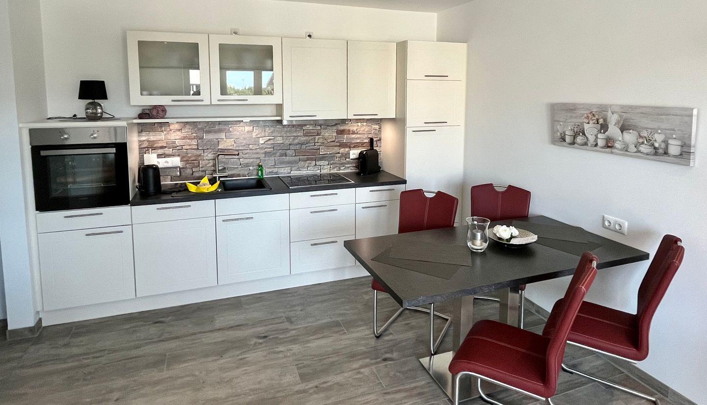 Beim Betreten der Wohnung werden Sie sofort von der hellen und einladenden Atmosphäre begeistert sein. Das offen gestaltete Wohn- und Esszimmer ist mit einem bequemen Sofa und einem Esstisch ausgestattet, an dem Sie gemütliche Abende verbringen können. Die hochwertige Ausstattung umfasst einen modernen Fernseher mit Satellitenanschluss sowie kostenloses WLAN, damit Sie auch während Ihres Aufenthalts stets verbunden sind.
