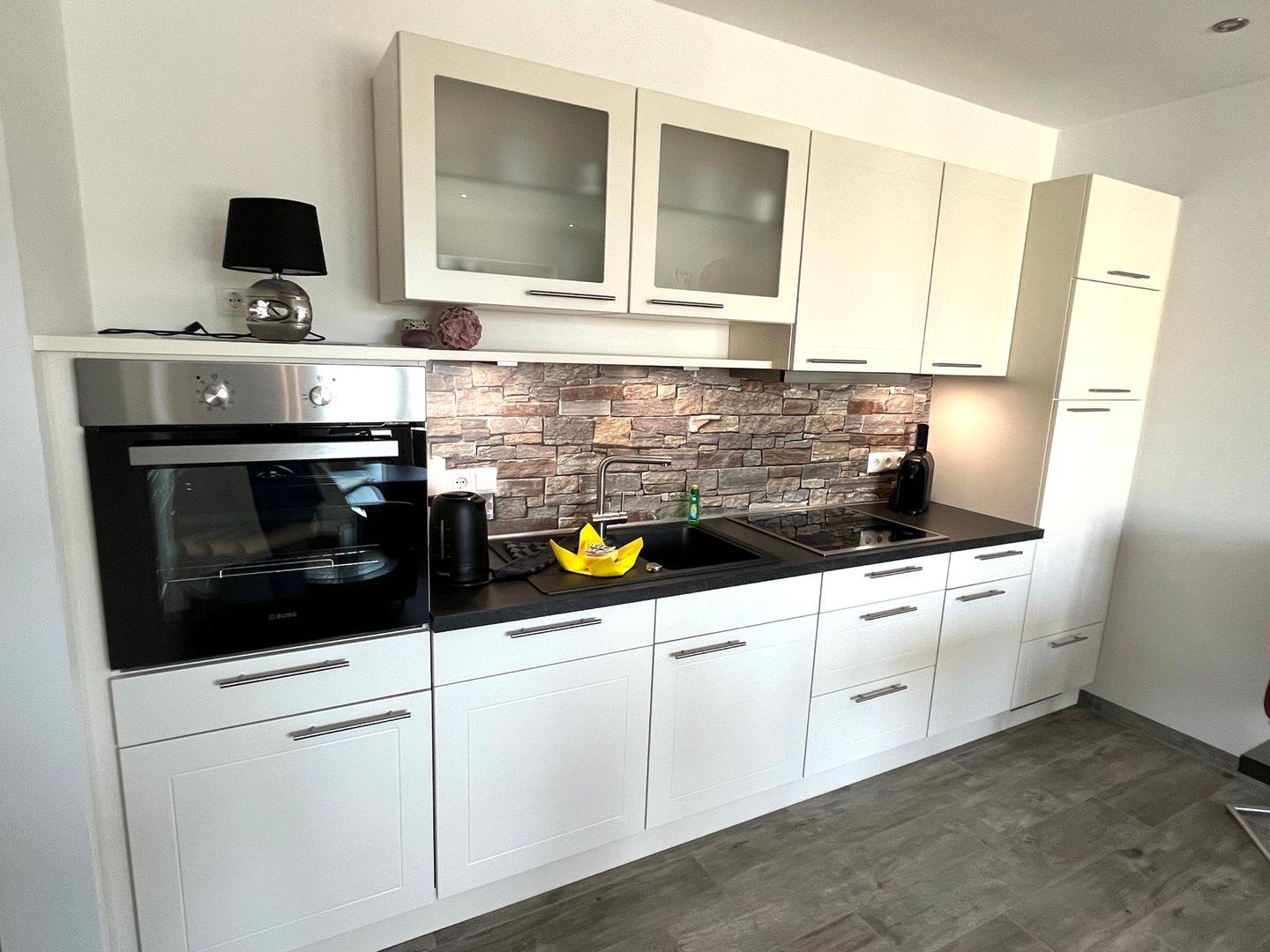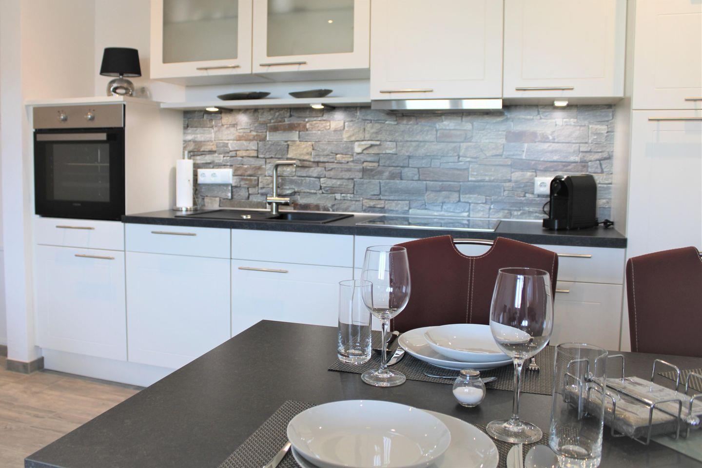Küche und Haushalt: Einbauküche, Kühlschrank mit Gefrierfach, 4-Zonen Cerankochfeld, Backofen, Dunstabzugshaube, Geschirrspüler, Kaffeefiltermaschine, Senseo- Kaffemaschine, Toaster, Wasserkocher, hochwertiges Geschirr und Besteck