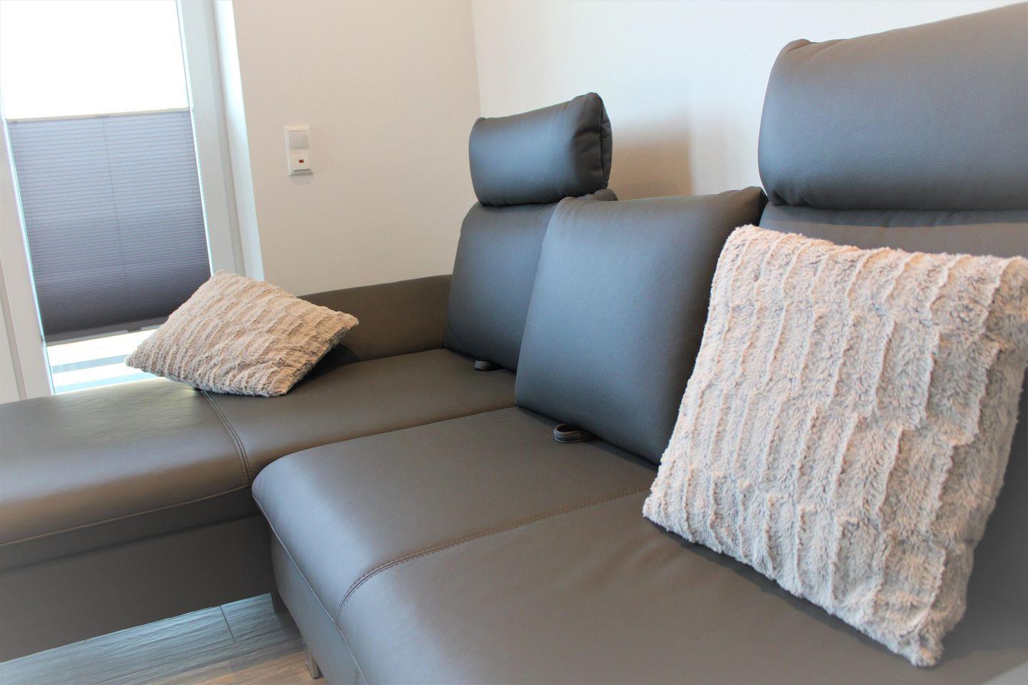 Wohnzimmer: Lederecksofa, Flachbildfernseher, Empfang deutschsprachiger TV-Programme (SAT-Anlage)