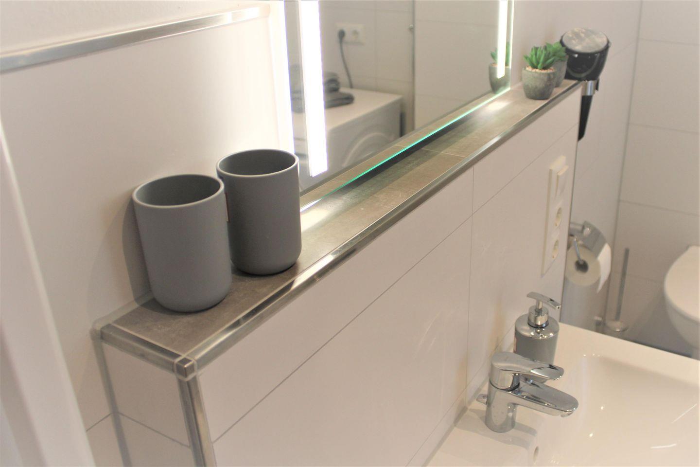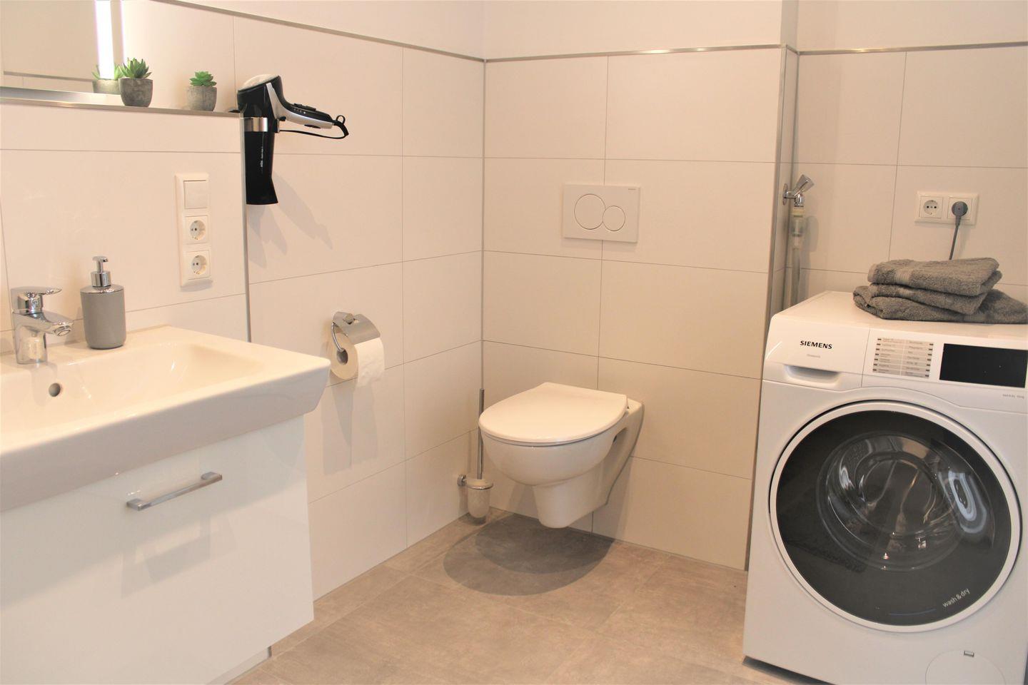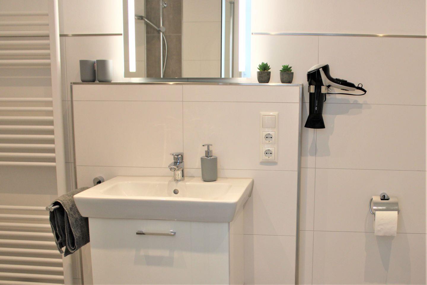 Vom Eingangsbereich links gehalten geht es in das schicke, behagliche Duschbad mit WC. Für allerhöchste Annehmlichkeit sorgt die große, bodengleiche Sommerregendusche, eine Handtuchheizung, sowie der beleuchtete Spiegel. Das Duschbad ist außerdem mit einer Waschmaschine mit integrierter Trockenfunktion ausgestattet.