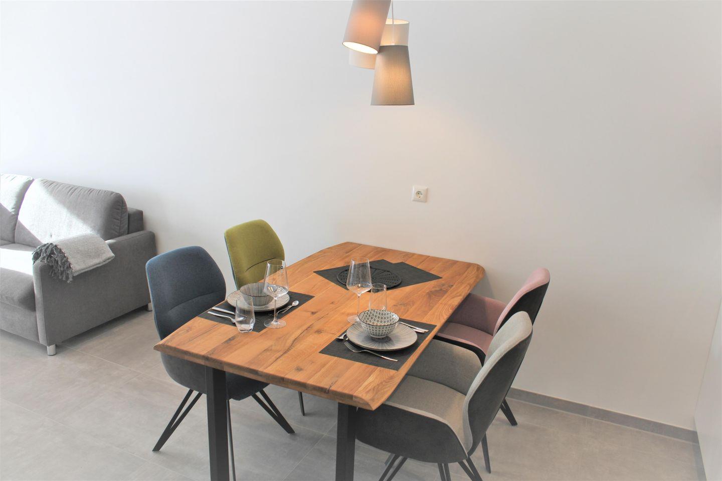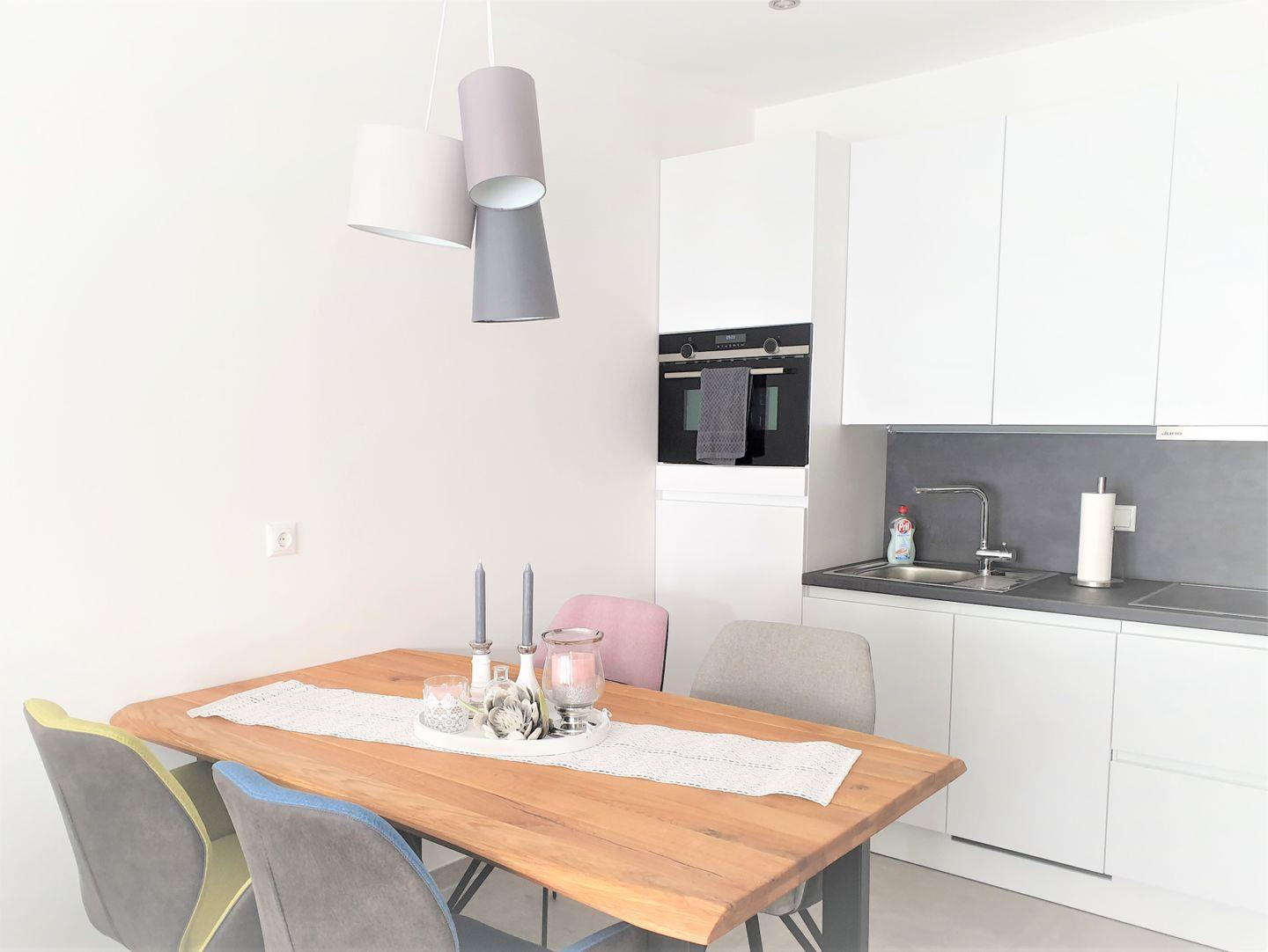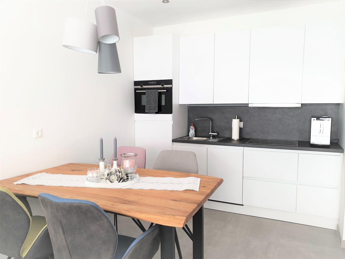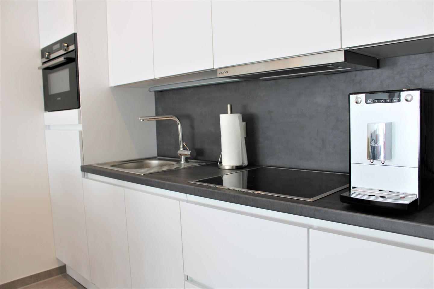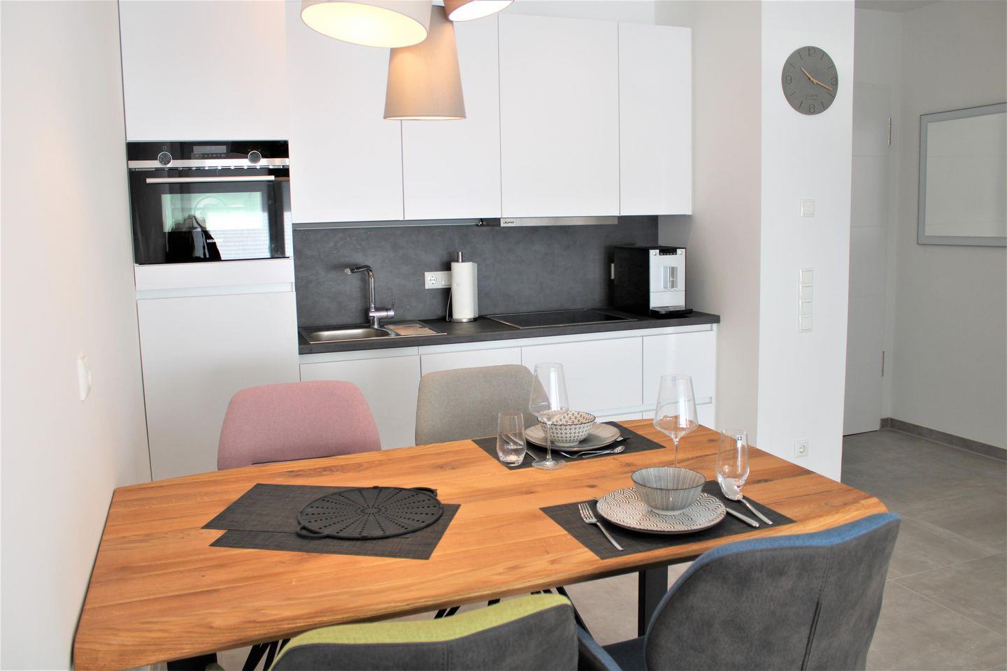 Die kleine, topmoderne Küche liegt offen zum Wohn-Essbereich und ist vollständig ausgestattet. Unter anderem verfügt sie über eine Mikrowellen-Backofenkombination sowie einer vollintegrierten Spülmaschine und einem Kaffeevollautomat.