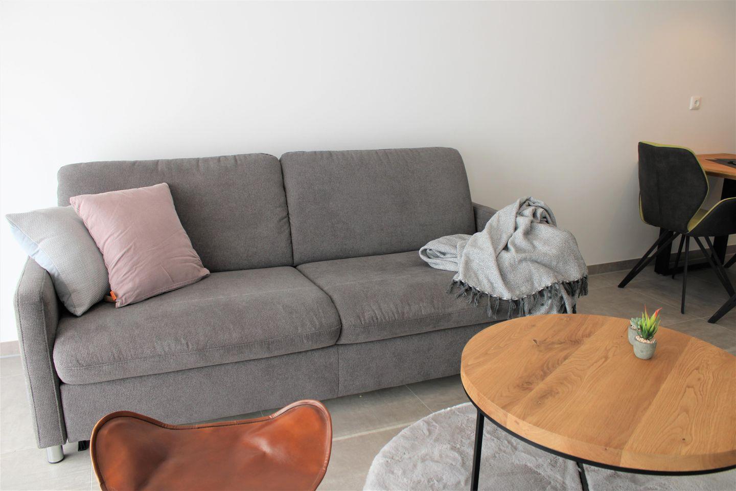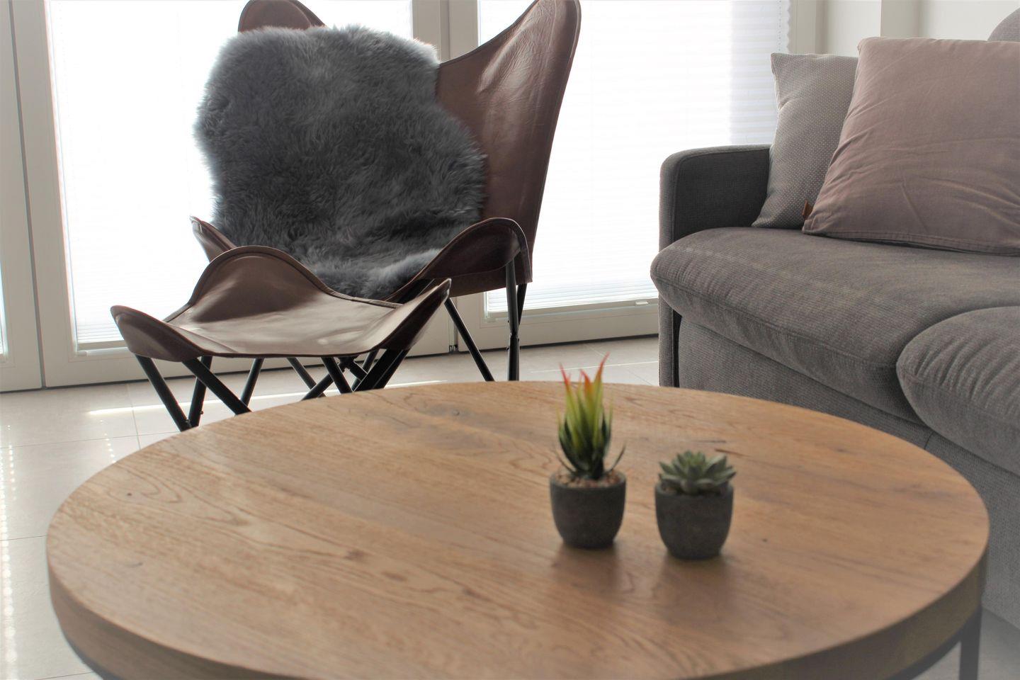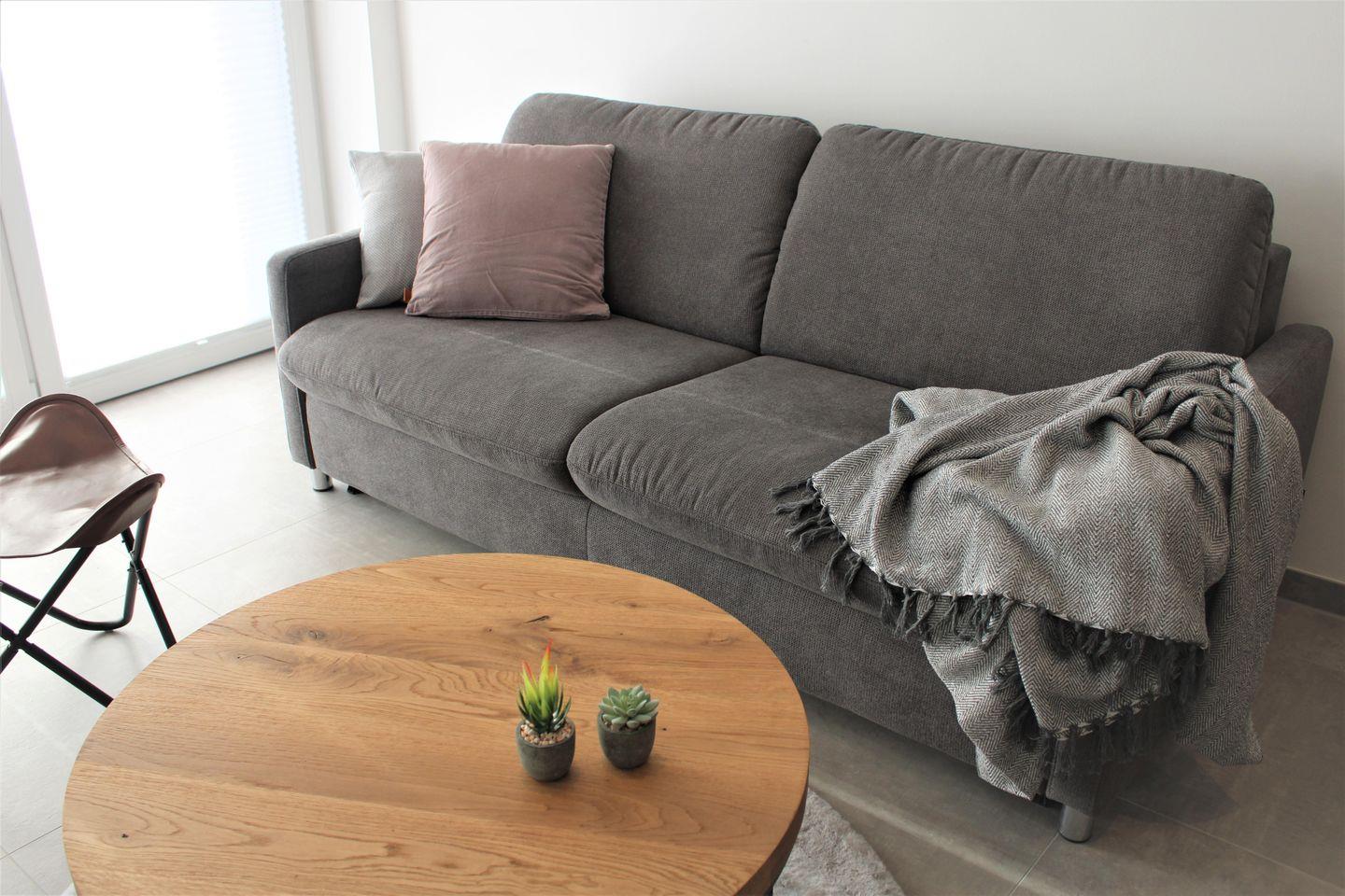 Im Wohnzimmer erwartet Sie ein gemütliches, wohnliches Sofa, das über eine Schlafbettfunktion verfügt und für zwei weitere Personen als Schlafmöglichkeit genutzt werden kann. Auch der gemütliche Sessel mit Hocker lädt zum Ausruhen, verweilen, Musik hören oder fernsehen ein.