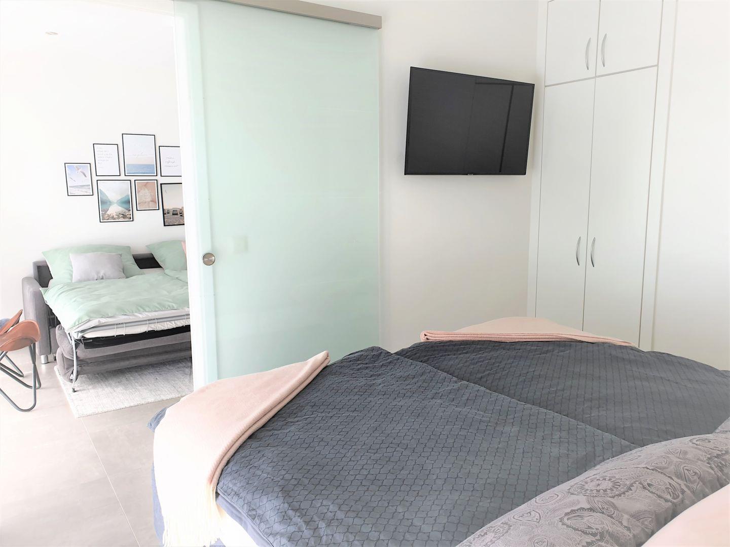 Über den Wohn-Essbereich gelangen Sie über eine elegante Glasschiebetüre ins Schlafzimmer mit eigenem Flachbildfernseher, einem komfortablem Doppel-Boxspringbett sowie einem eingebauten Kleiderschrank. Von hieraus können Sie ebenfalls direkt auf den großzügigen Balkon gelangen.