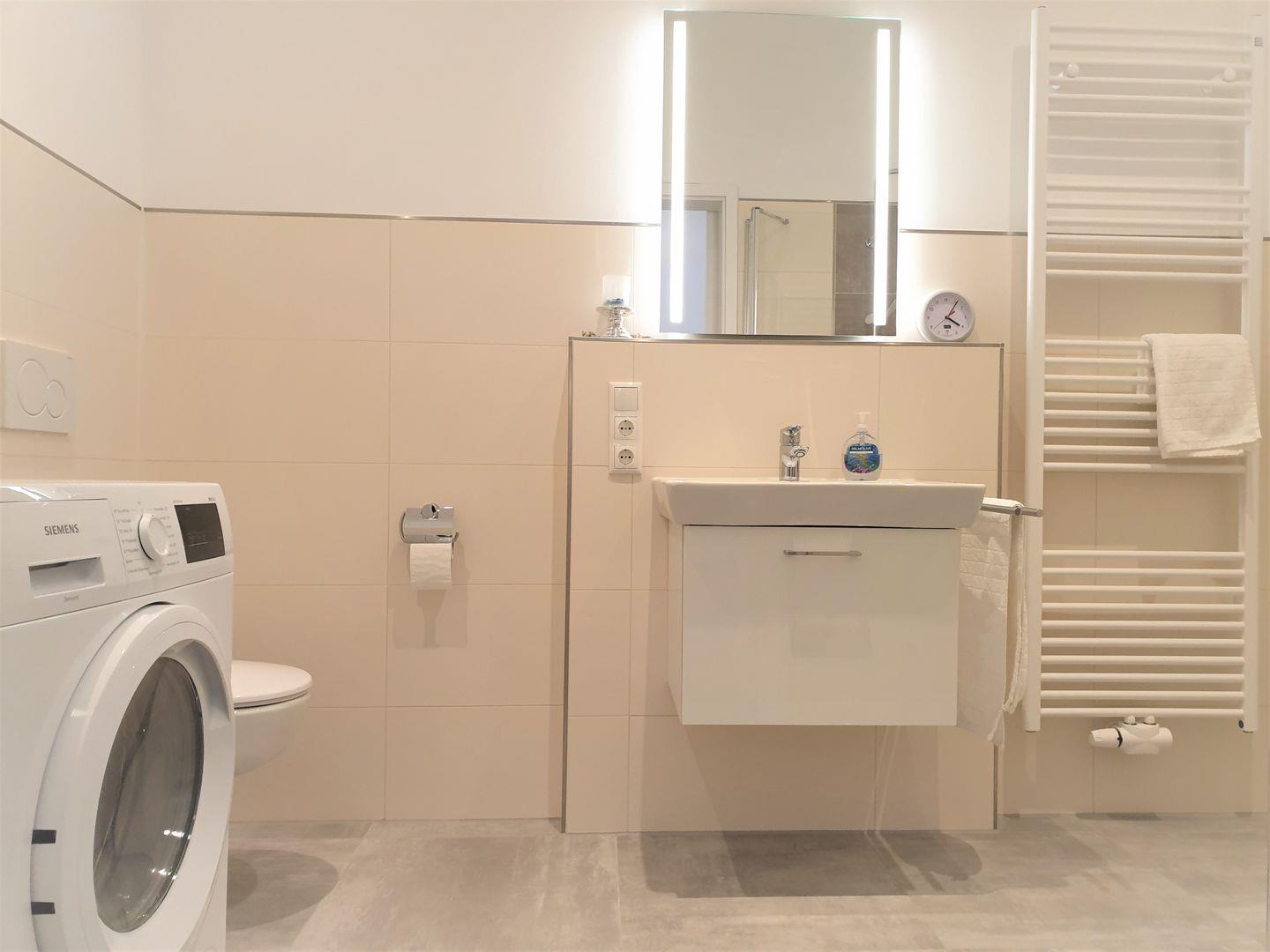Bad und Sanitär: bodentiefe, barrierefreie Sommerregendusche mit Handlauf und Hocker, Waschtischanlage mit Spiegel, WC, Handtuchheizung, Waschmaschine,