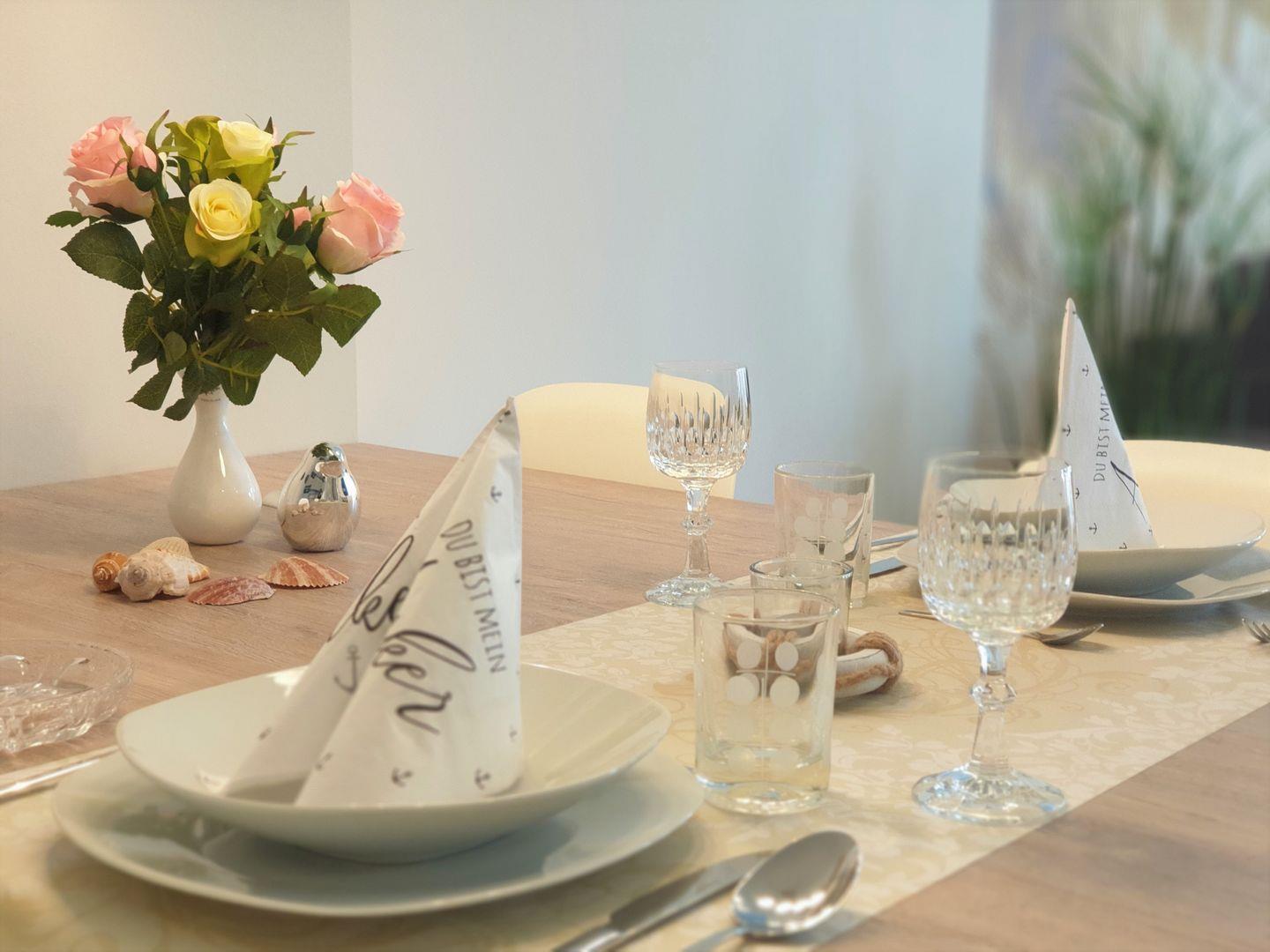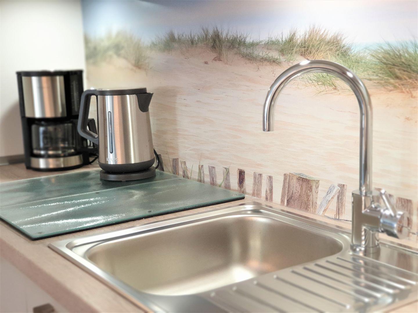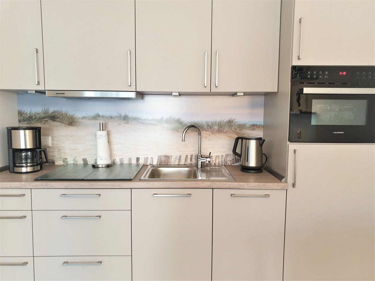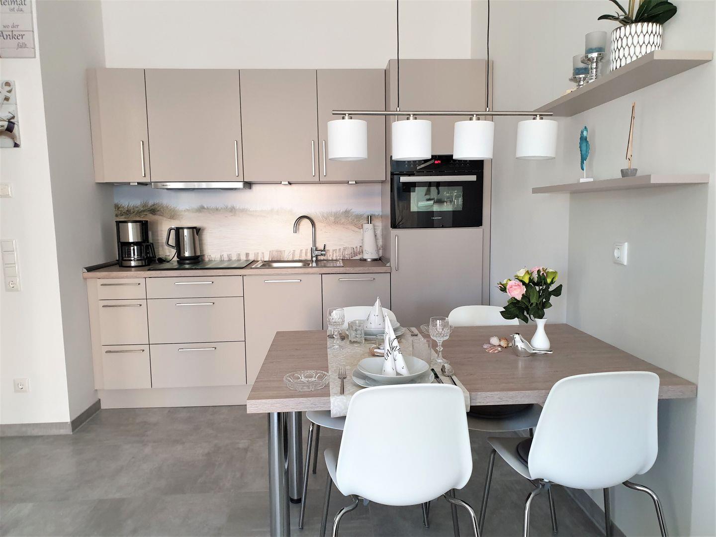 Über den kleinen Flur, der mit einer Garderobe ausgestattet ist, gelangen Sie in einen Licht durchfluteten idyllischen und im Küstenflair großzügig eingerichteten Wohn-Essbereich. Die gesamte Wohnung ist barrierefrei. Die topmoderne Küche liegt offen zum Wohn-Essbereich und ist vollständig mit Back- und Kochutensilien ausgestattet. Unter anderem verfügt sie über eine Mikrowellen-Backofenkombination, Spülmaschine und einen Kühlschrank mit Gefrierfach.