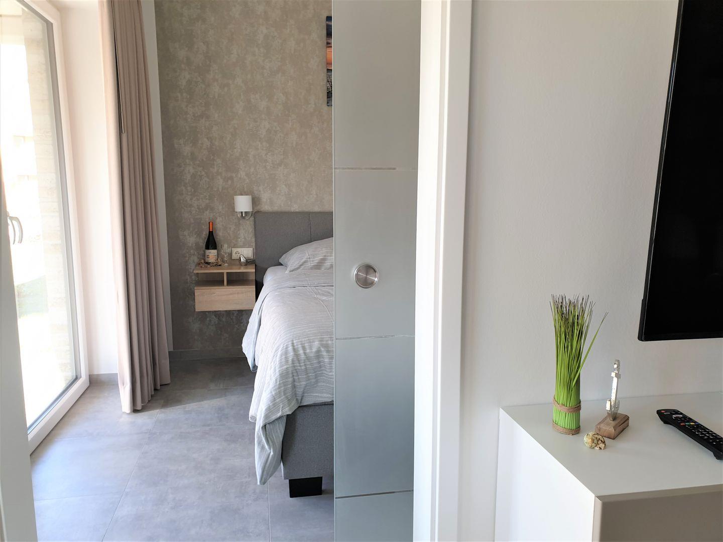 Zusätzlich gelangen Sie über den Wohnbereich durch eine elegante Glasschiebetür ins Schlafzimmer mit einem komfortablem Doppelboxspringbett sowie einem eingebauten Kleiderschrank und einem 43 Zoll Smart TV. Von hieraus können Sie ebenfalls direkt auf die Terrasse gelangen. Vom Eingangsbereich aus rechts geht es durch eine Schiebetür in das schicke, moderne Duschbad mit WC. Für höchste Annehmlichkeit sorgt die große, bodengleiche Sommerregendusche mit Handlauf und zustellbarem Hocker, sowie eine Handtuchheizung und ein beleuchteter Spiegel. Das Duschbad ist zusätzlich mit einer Waschmaschine ausgestattet.