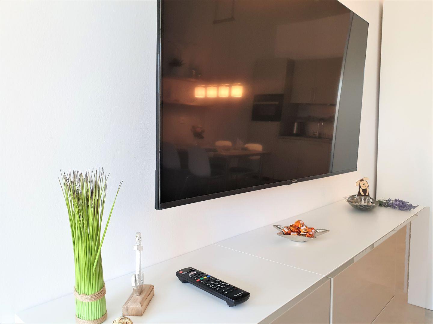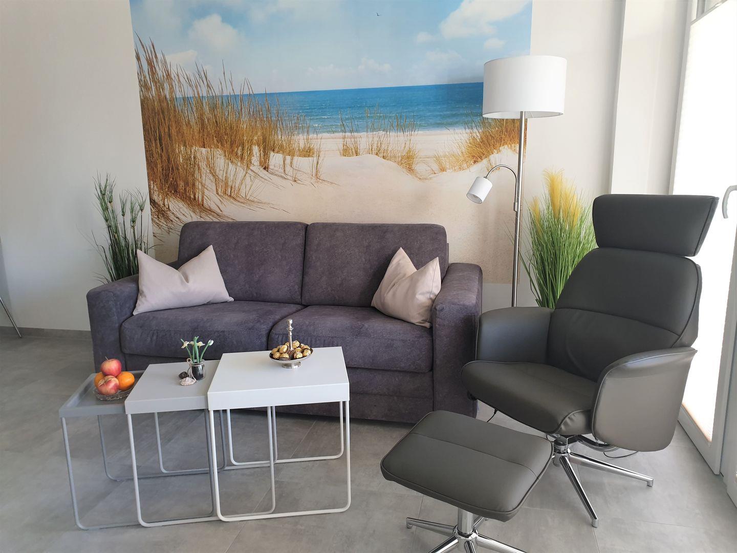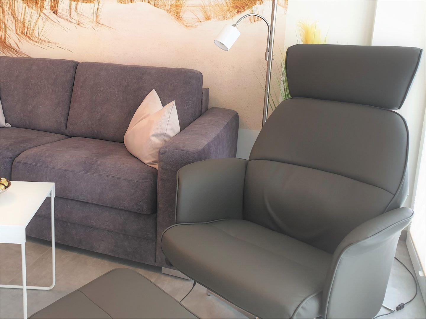 Wohnzimmer: Hochwertiges Schlafsofa, Ledersessel mit Wärme- und leichter Massagefunktion plus Hocker, Smart TV 55 Zoll, Empfang deutschsprachiger TV-Programme (SAT-Anlage)