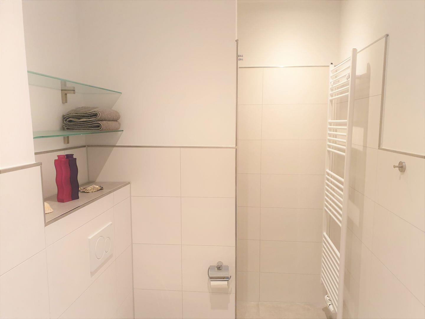 Erstmal angekommen werft Ihr den Anker im 1. OG am Ende des Flurs links. Die 2-Zimmerwohnung bietet ausreichend Platz für 2-4 Personen. Die Wohnung hat ein geräumiges Duschbad mit begehbarer Sommerregendusche, beleuchtetem Spiegel, eingebautem Bad-Radio, Bidet, sowie einen Handtuchwärmer. Utensilien wie Kosmetikspiegel, Fön, Haken sowie großzügige Ablageflächen inklusive.