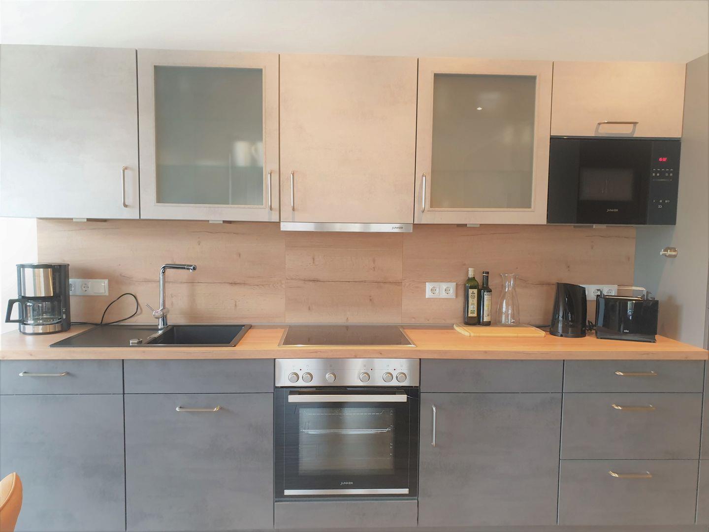 Küche und Haushalt: Einbauküche, Kühlschrank mit Gefrierfach, 4-Zonen Cerankochfeld, Backofen, Dunstabzugshaube, Geschirrspüler, Mikrowelle, Kaffeefiltermaschine, Toaster, Wasserkocher, hochwertiges Geschirr und Besteck