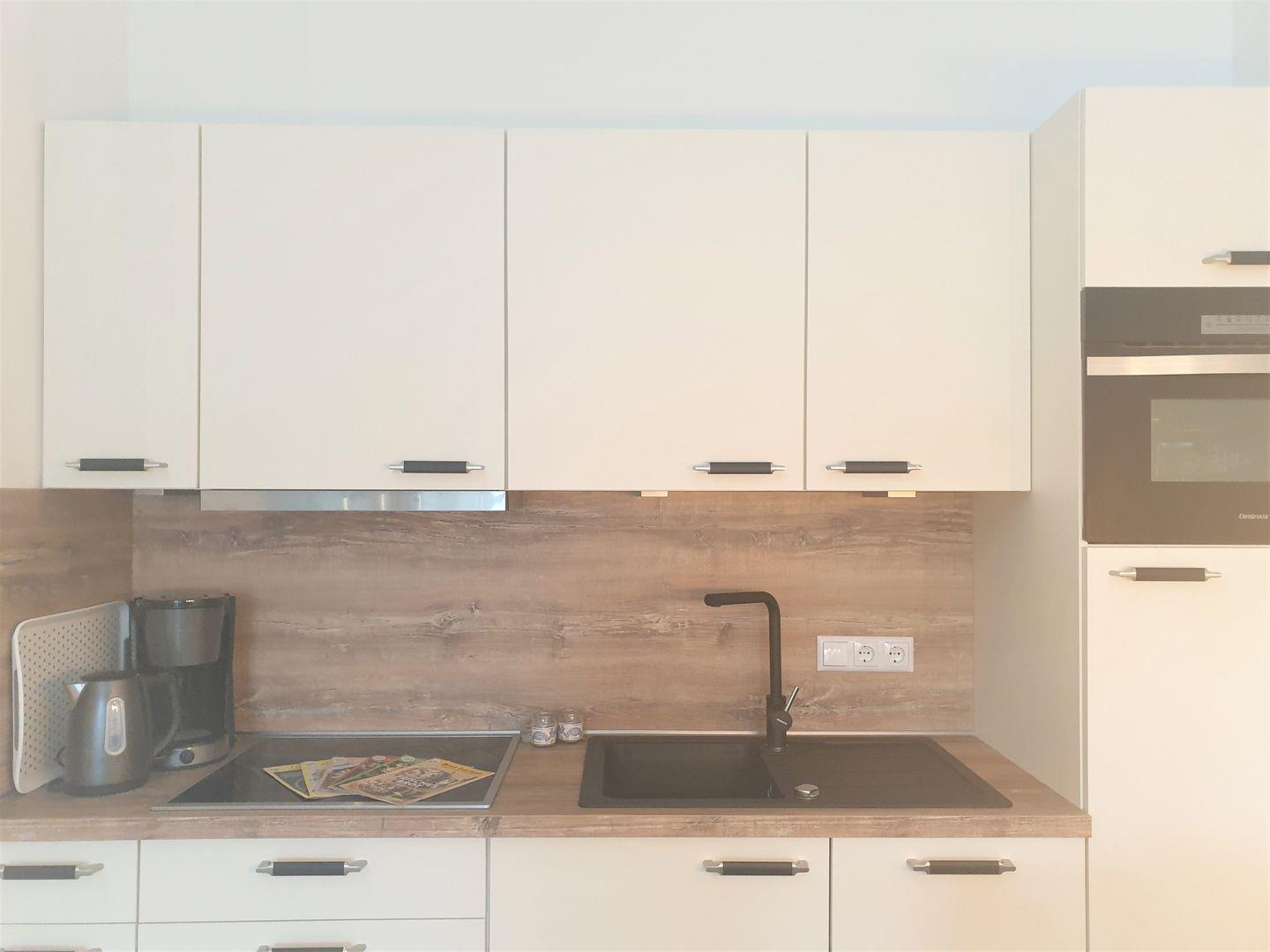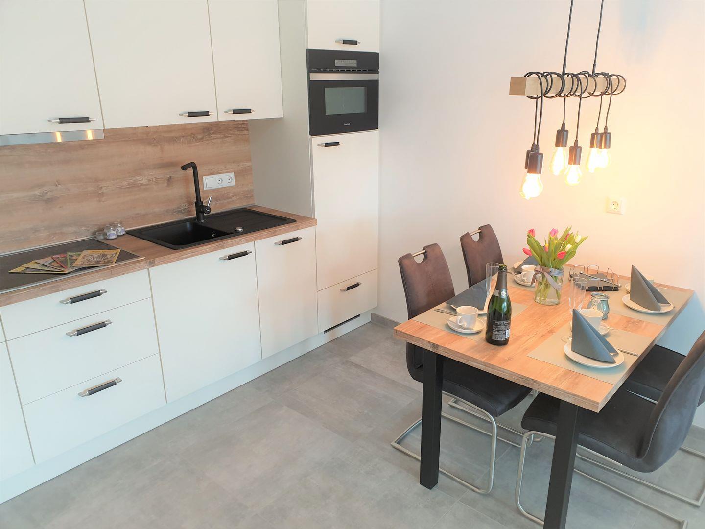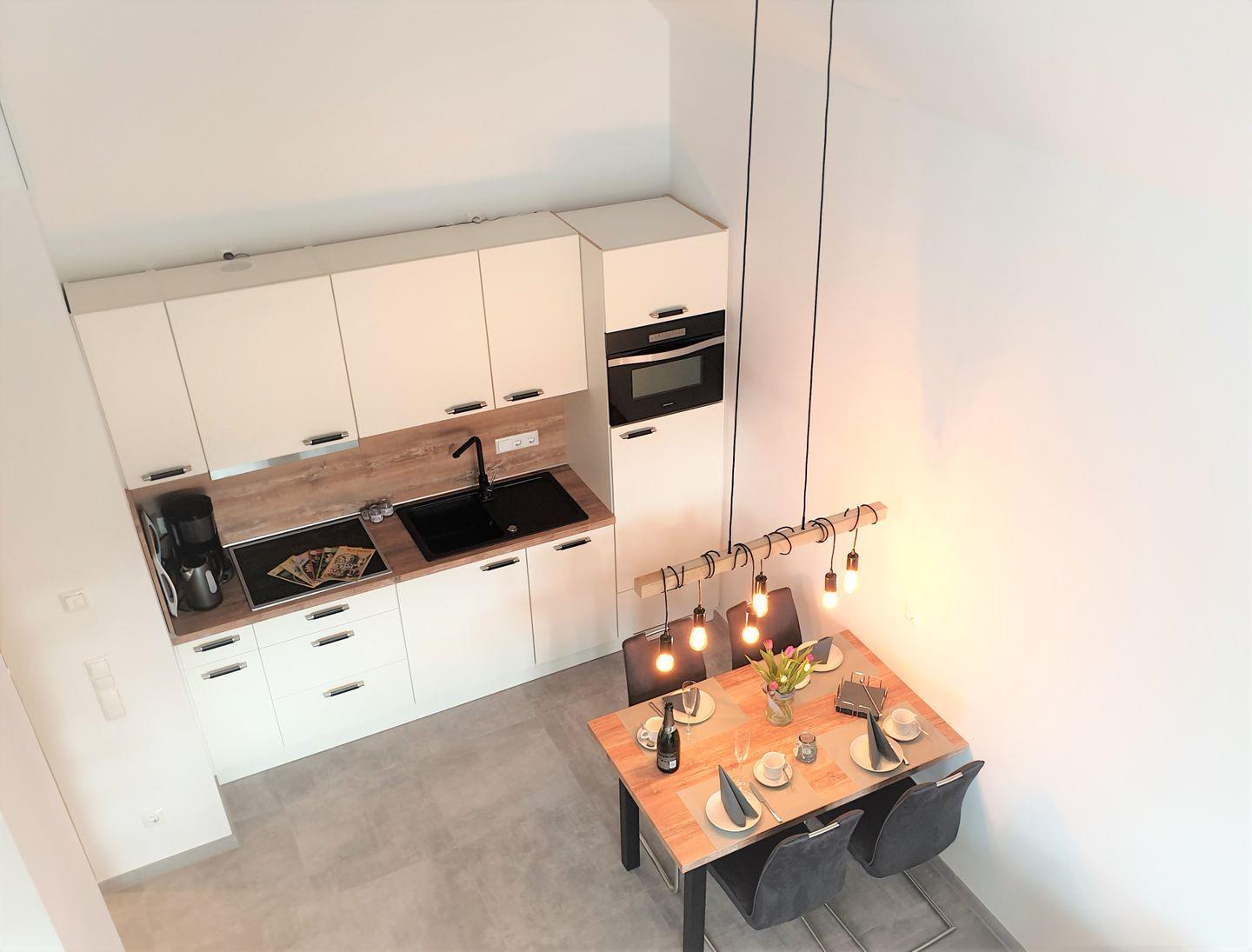 Küche und Haushalt: Einbauküche, Kühlschrank mit Gefrierfach, 4-Zonen Cerankochfeld, Mikrowellen-Backofen-Kombi, Dunstabzugshaube, Waschtrockner, Geschirrspüler, Filterkaffeemaschine, Toaster, Wasserkocher, hochwertiges Geschirr und Besteck