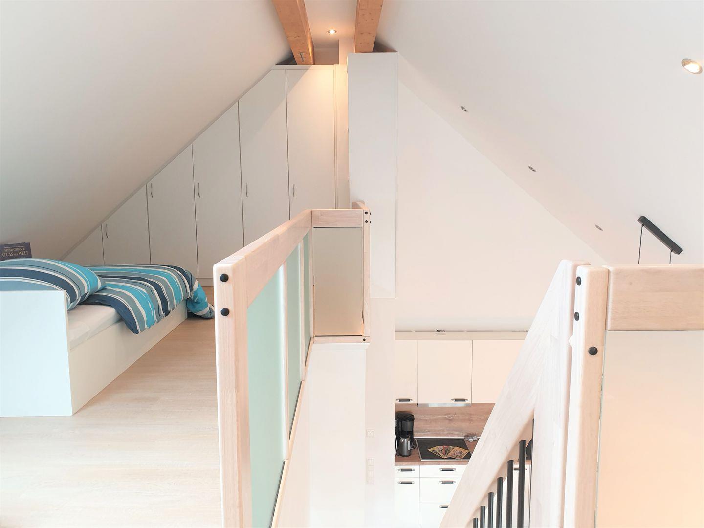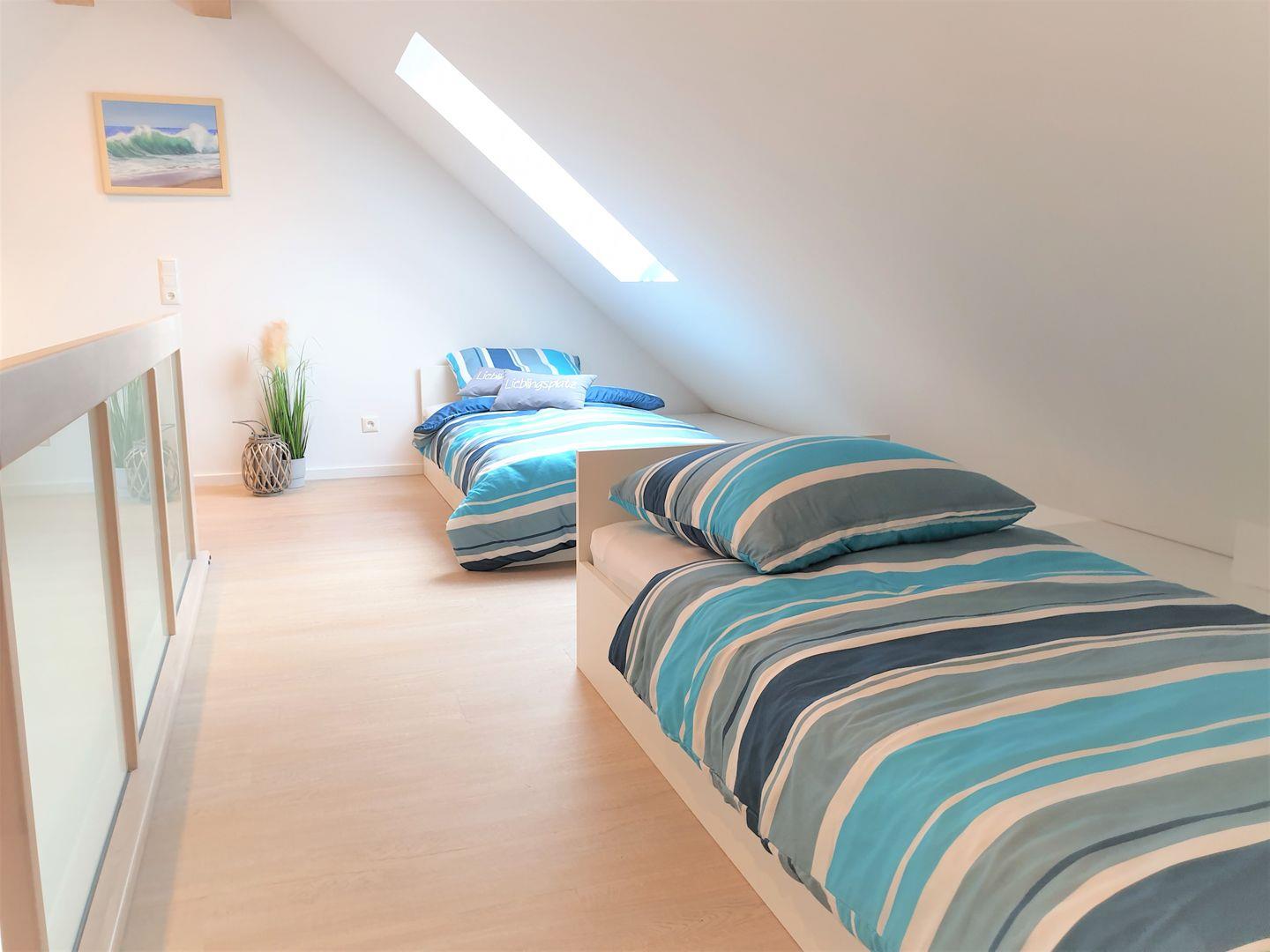 Offener Schlafbereich auf Empore: Einzelbetten (90 x 200 cm), Schrank, Nachttische, Leselampen