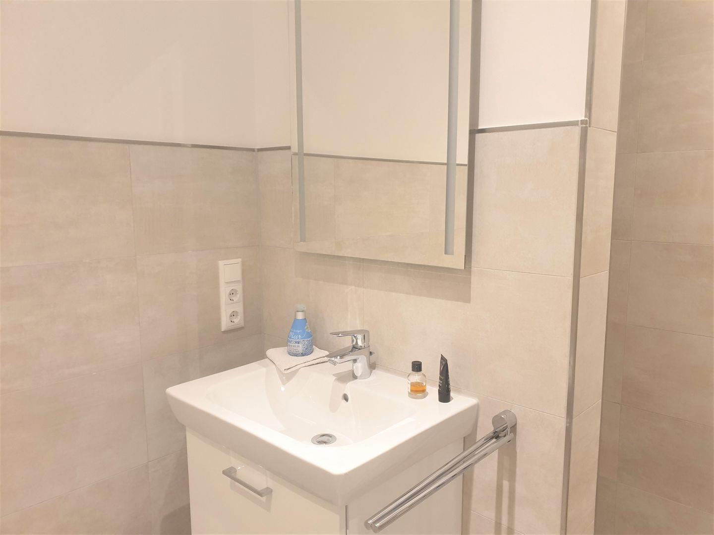 Das moderne Badezimmer ist mit einer bodengleichen Dusche, einem Waschbecken, WC, Spiegel und Haartrockner ausgestattet. Für zusätzlichen Komfort stehen eine Waschmaschine und ein Trockner, Bügeleisen, Staubsauger sowie ein Wäscheständer bereit – dadurch eignet sich das Apartment auch für längere Aufenthalte.