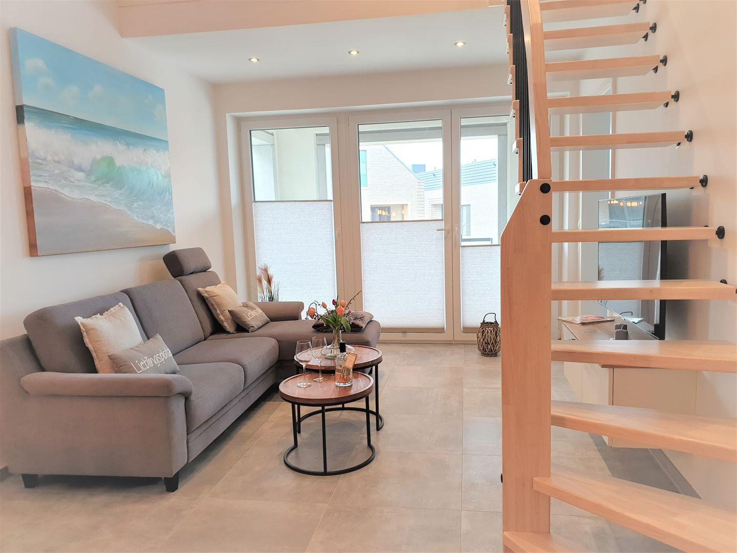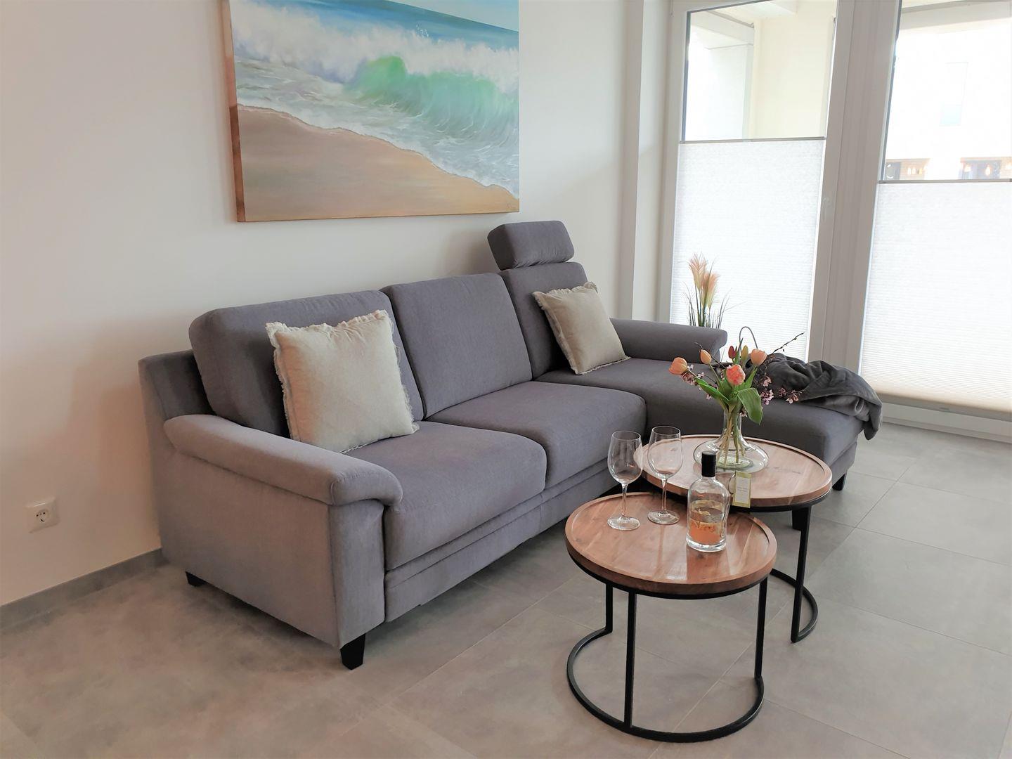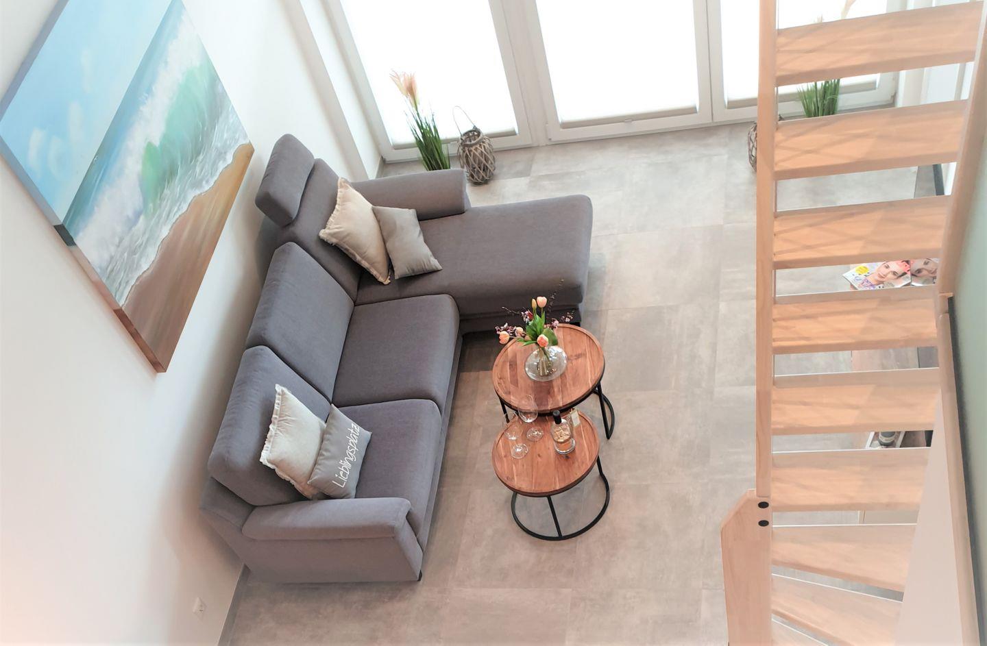 Das Apartment überzeugt durch seine offene, helle Raumgestaltung und bietet zwei separate Schlafzimmer (ein Schlafbereich befindet sich auf der offenen Galerie), wodurch ausreichend Privatsphäre sowohl für Familien als auch für kleinere Reisegruppen mit bis zu fünf Personen besteht. Ein Babybett und ein Hochstuhl sorgen für zusätzlichen Komfort für die jüngsten Gäste. Im behaglichen Wohnzimmer finden Sie eine Sofaecke sowie einen Sessel – ideal zum Entspannen oder für gesellige Stunden mit Spielen. Der Wohnbereich ist offen mit der hochwertig ausgestatteten Küche verbunden, die über Ceranherd, Backofen (elektrisch), Mikrowelle, Kühlschrank mit Gefrierfach, Spülmaschine, Kaffeemaschine, Toaster, Wasserkocher und ausreichend Küchenutensilien verfügt.
