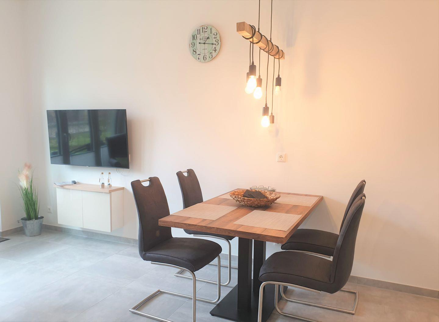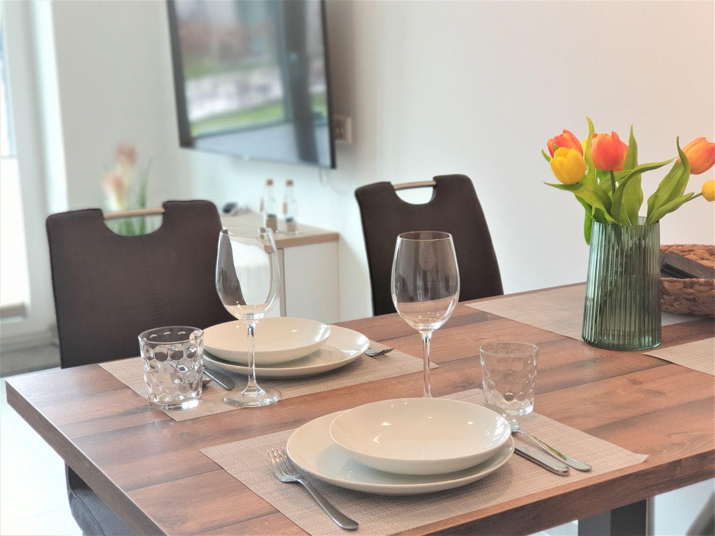 Das Apartment verfügt über ein gemütliches Schlafzimmer, ein stilvolles Badezimmer mit einer bodengleichen Dusche und ein offenes Wohn- und Esszimmer, das für gesellige Abende einlädt. Die offene Küche ist komplett ausgestattet mit modernen Geräten wie einem Cerankochfeld, einem Kühlschrank mit Gefrierfach, einem Spülmaschine, einem Backofen sowie nützlichen Küchenutensilien. Egal, ob Sie sich ein schnelles Frühstück oder ein festliches Dinner zubereiten möchten, hier finden Sie alles, was Sie brauchen. Der angrenzende Essbereich ist der perfekte Ort, um gemeinsam zu schlemmen und die Erlebnisse des Tages Revue passieren zu lassen.