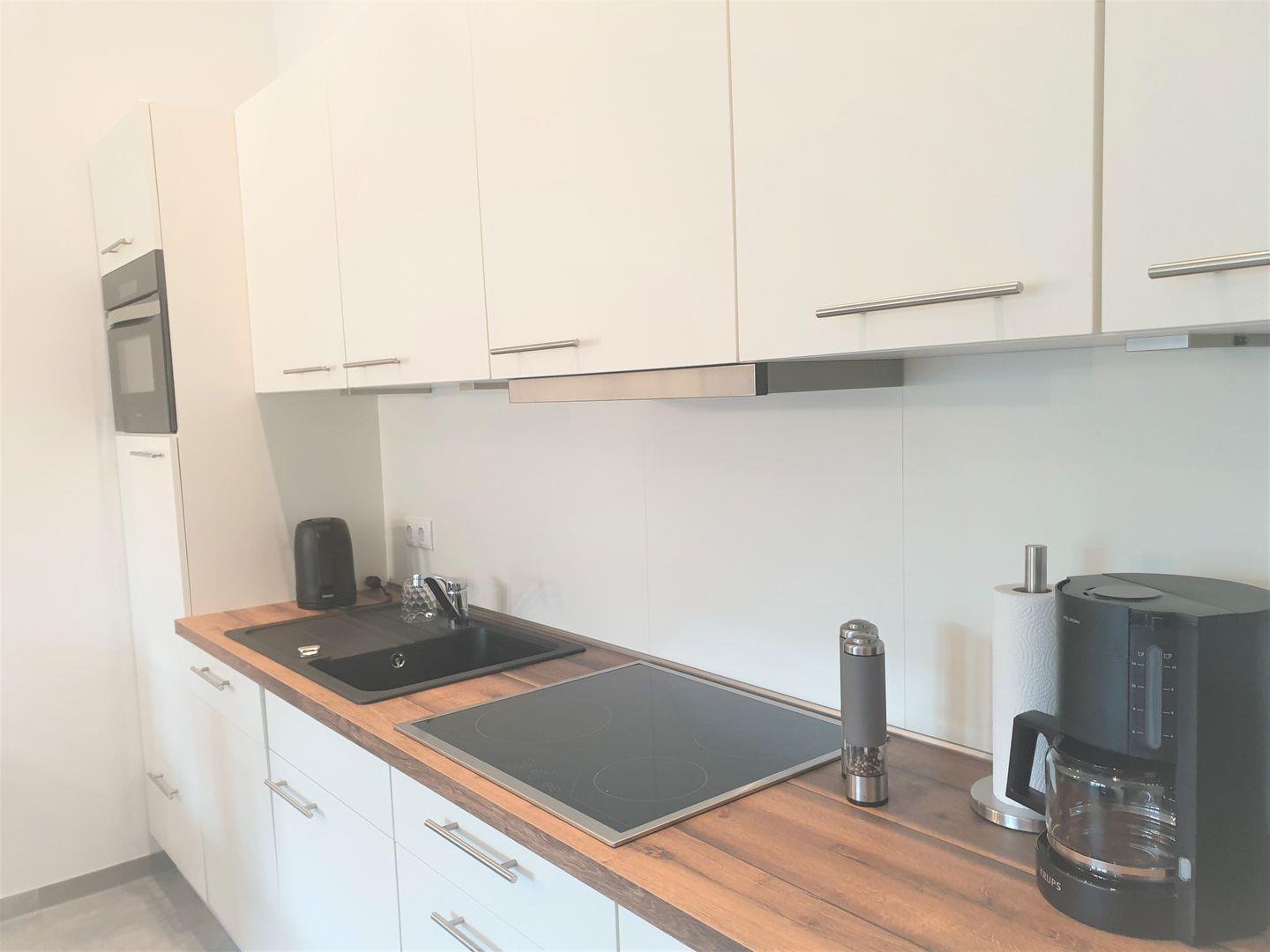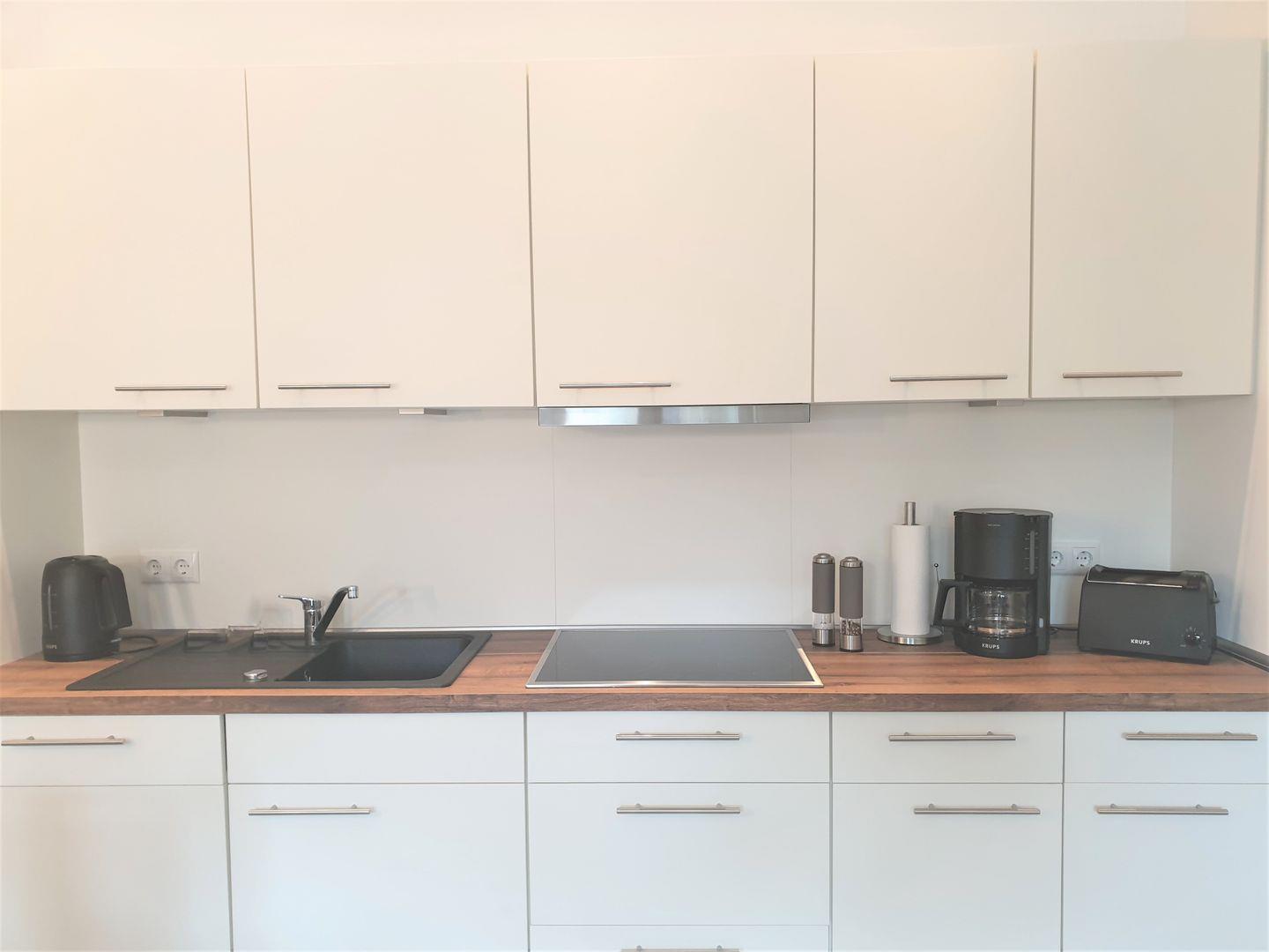 Küche und Haushalt: Einbauküche, Kühlschrank mit Gefrierfach, 4-Zonen Cerankochfeld, Backofen, Dunstabzugshaube, Geschirrspüler, Kaffeefiltermaschine, Toaster, Wasserkocher, hochwertiges Geschirr und Besteck