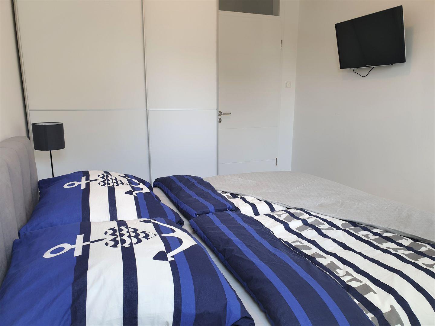 Schlafzimmer: Doppelbett (Maße: 180 x 200 cm) mit 2 Einzelmatratzen, Leselampen, Kleiderschrank, Fernseher