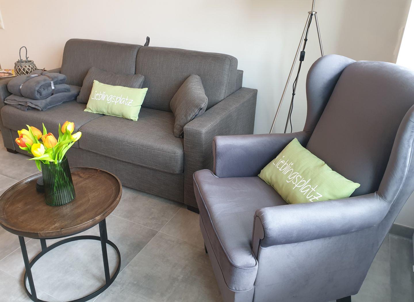 Wohnzimmer: gemütliche Couch mit Ausziehfunktion, Sessel, Flachbildfernseher, Empfang deutschsprachiger TV-Programme (SAT-Anlage)