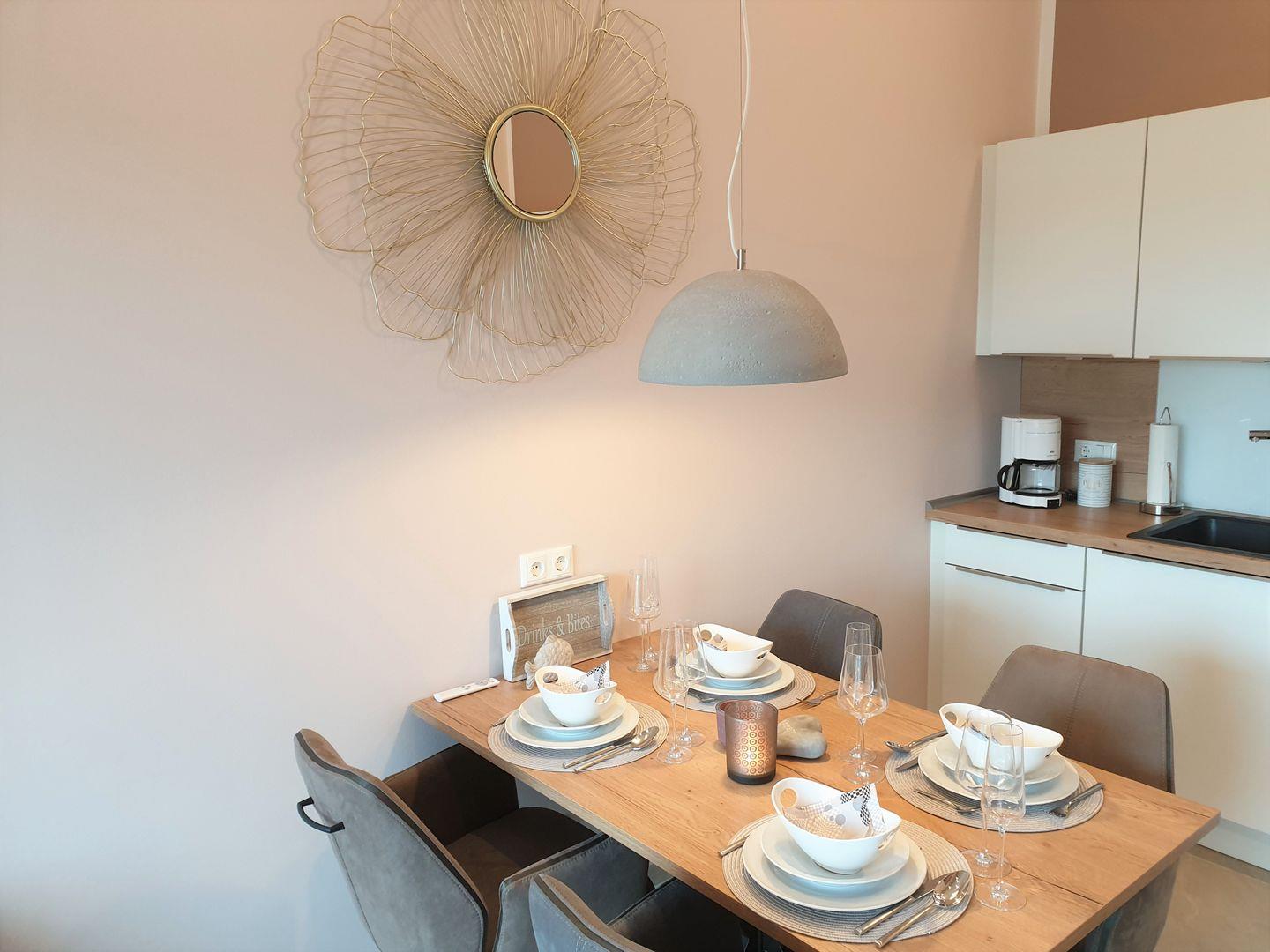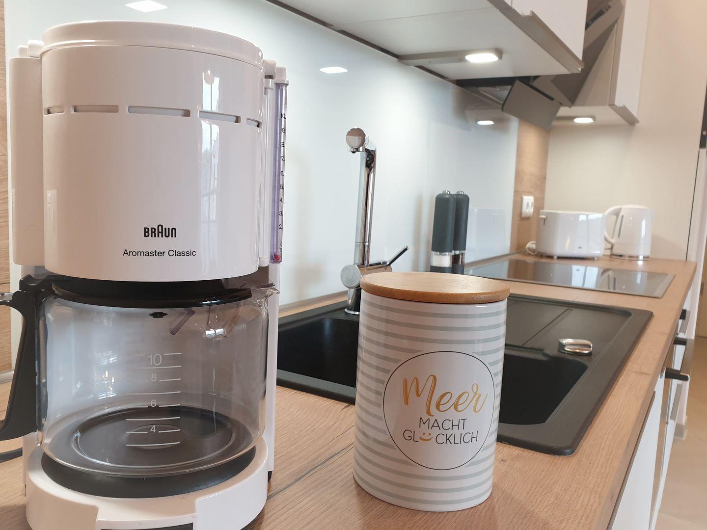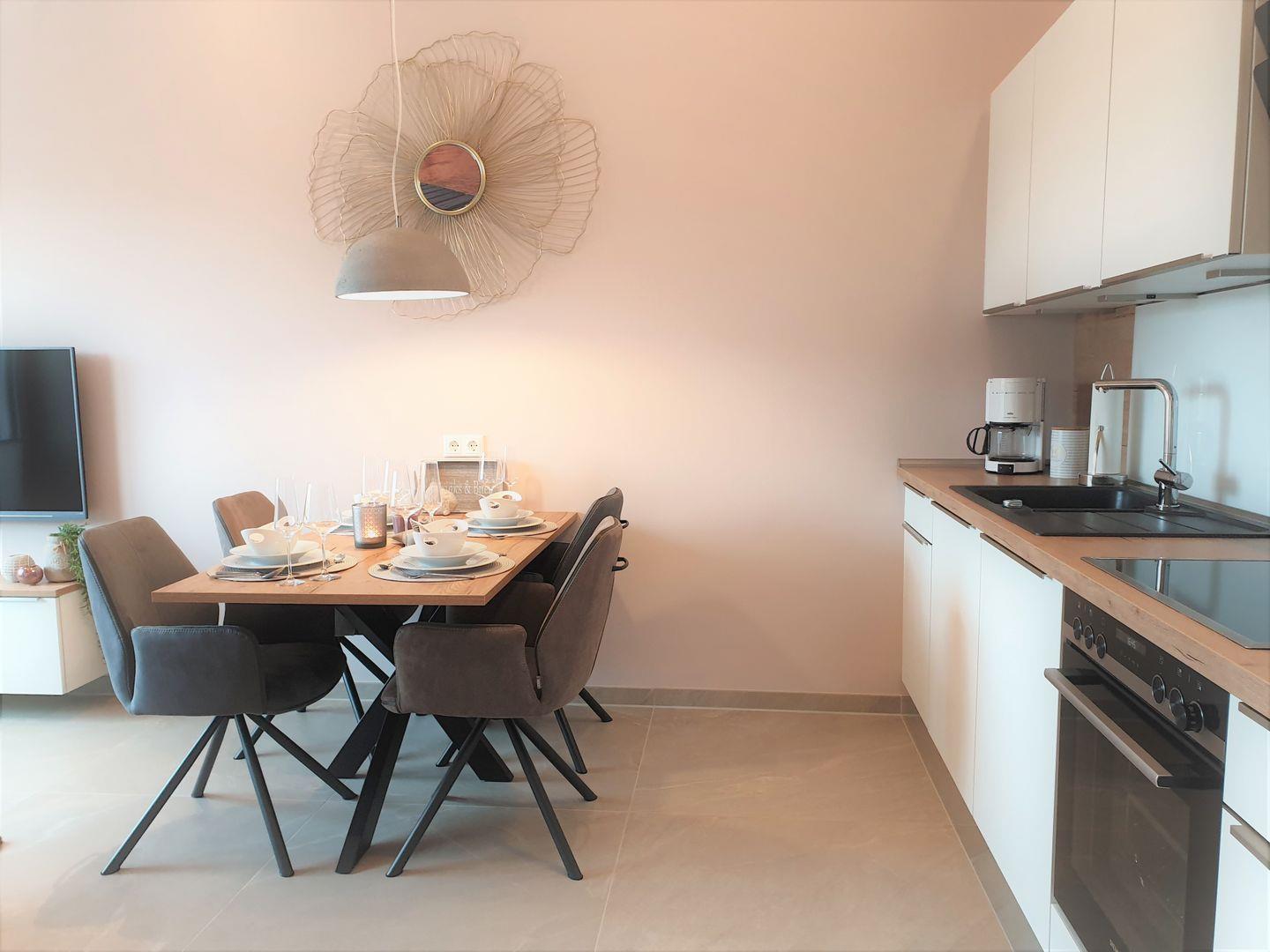 Küche und Haushalt: Einbauküche, Kühlschrank mit Gefrierfach, 4-Zonen Cerankochfeld, Backofen, Einbaumikrowelle, Dunstabzugshaube, Geschirrspüler, Kaffeefiltermaschine, Nespresso-Kapselmaschine, Toaster, Eierkocher, Mixer, Wasserkocher, Pürierstab, hochwertiges Geschirr und Besteck