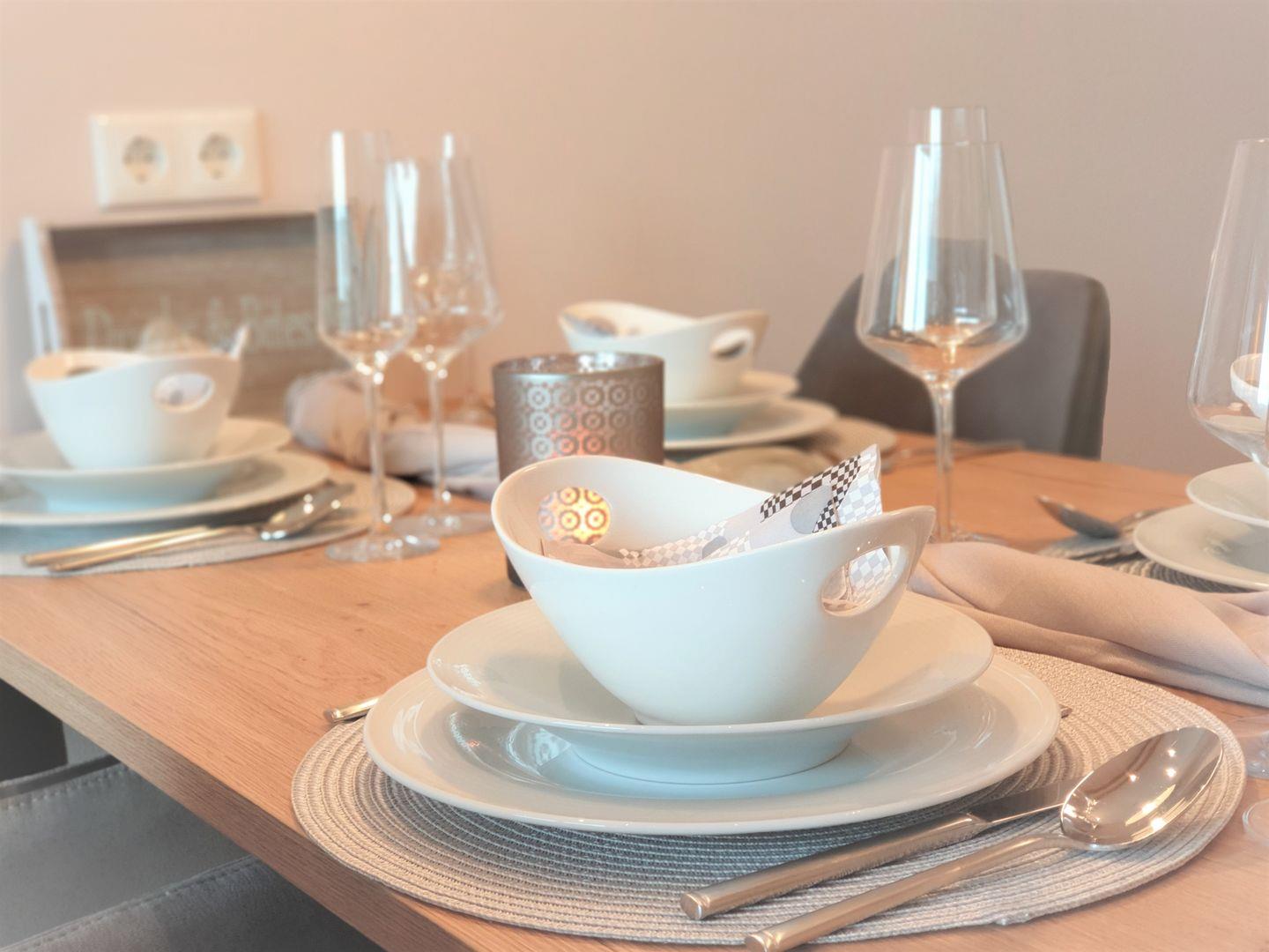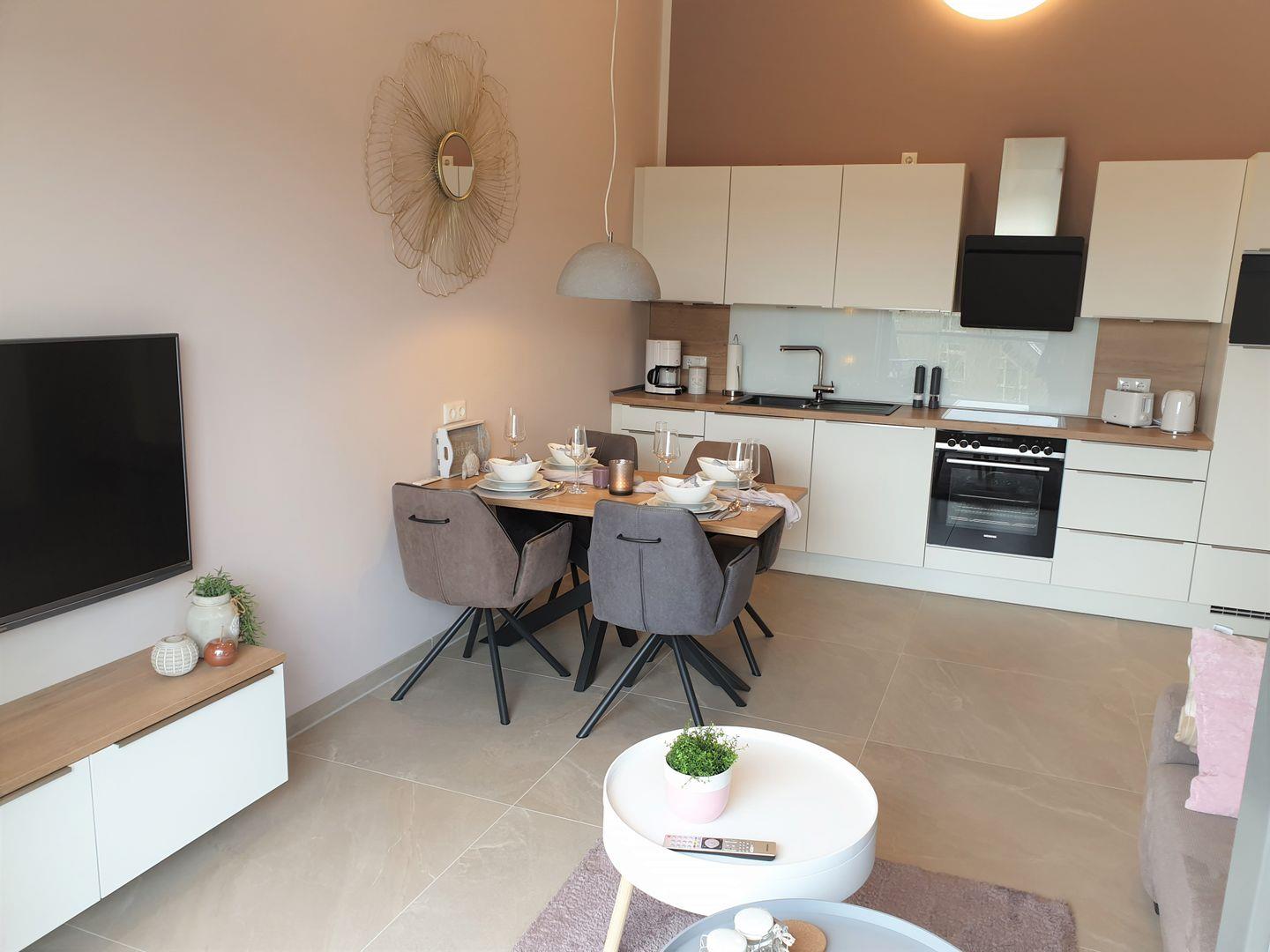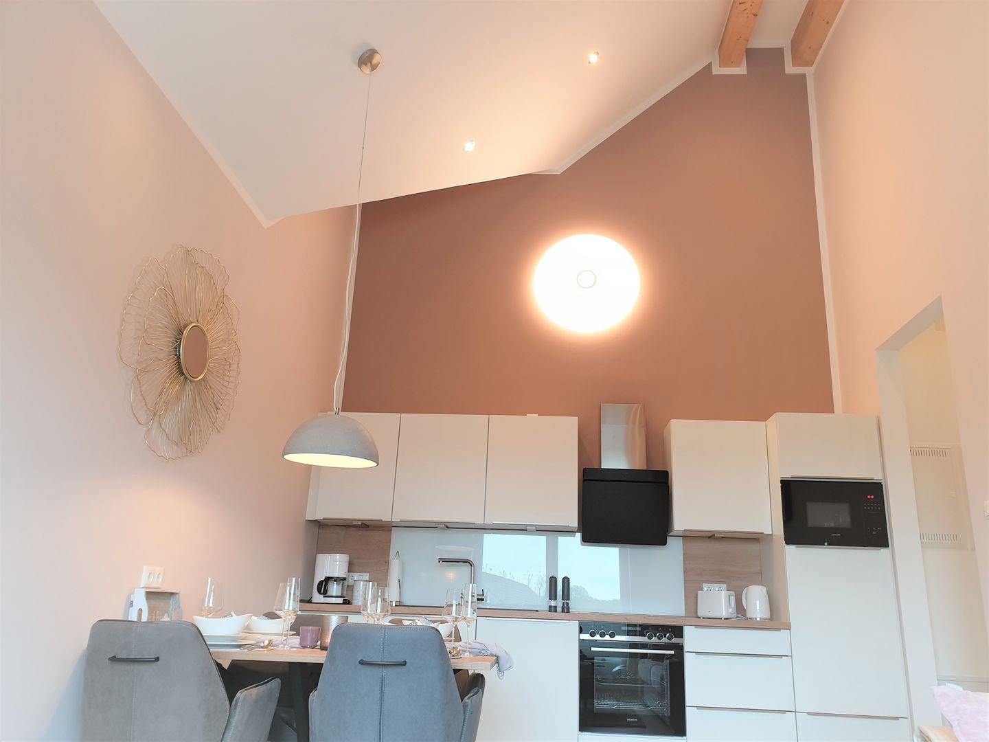 Küche und Haushalt: Einbauküche, Kühlschrank mit Gefrierfach, 4-Zonen Cerankochfeld, Backofen, Einbaumikrowelle, Dunstabzugshaube, Geschirrspüler, Kaffeefiltermaschine, Nespresso-Kapselmaschine, Toaster, Eierkocher, Mixer, Wasserkocher, Pürierstab, hochwertiges Geschirr und Besteck