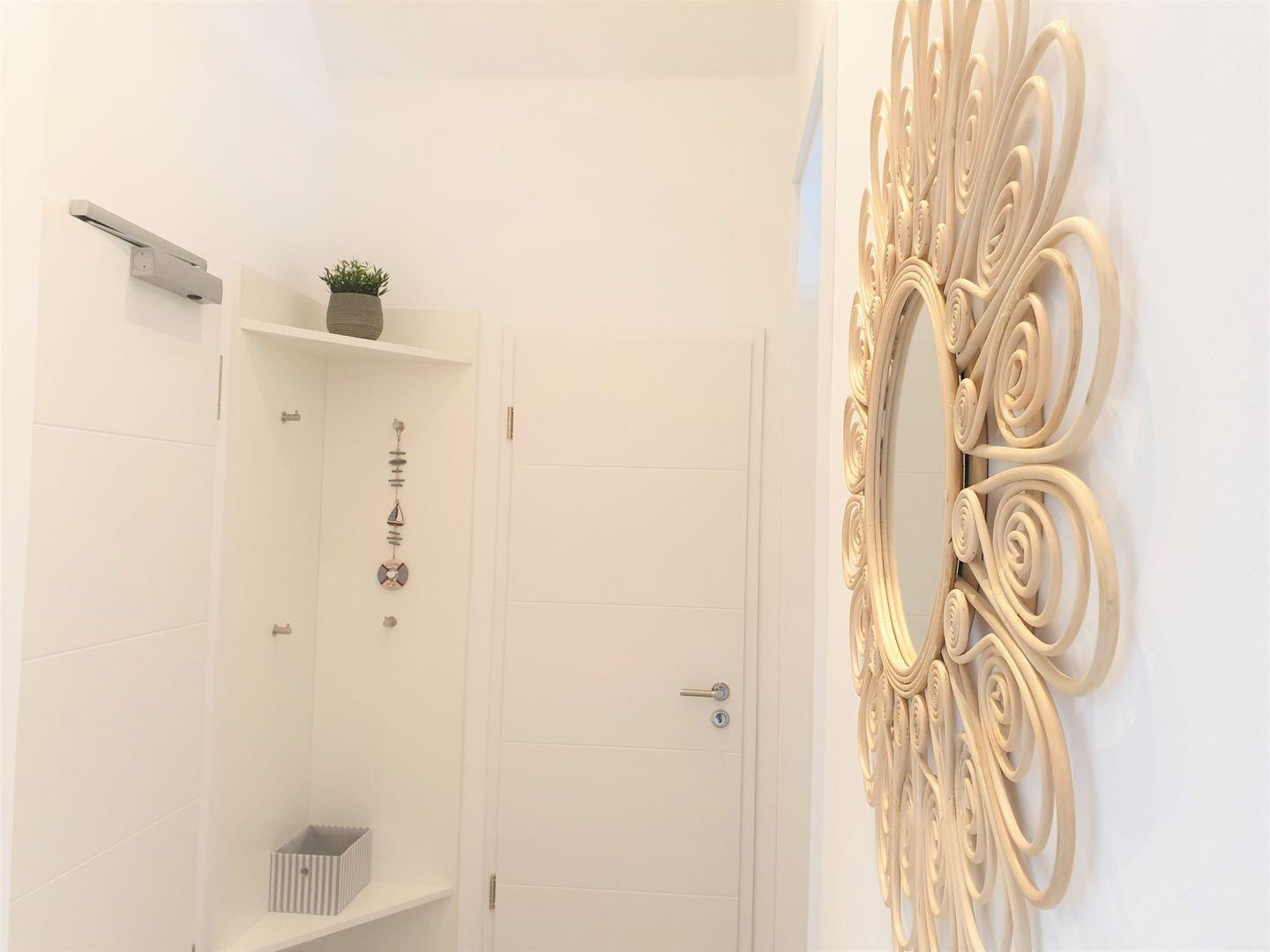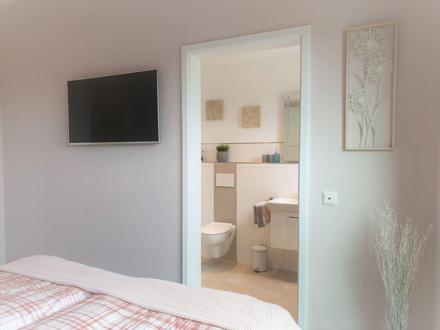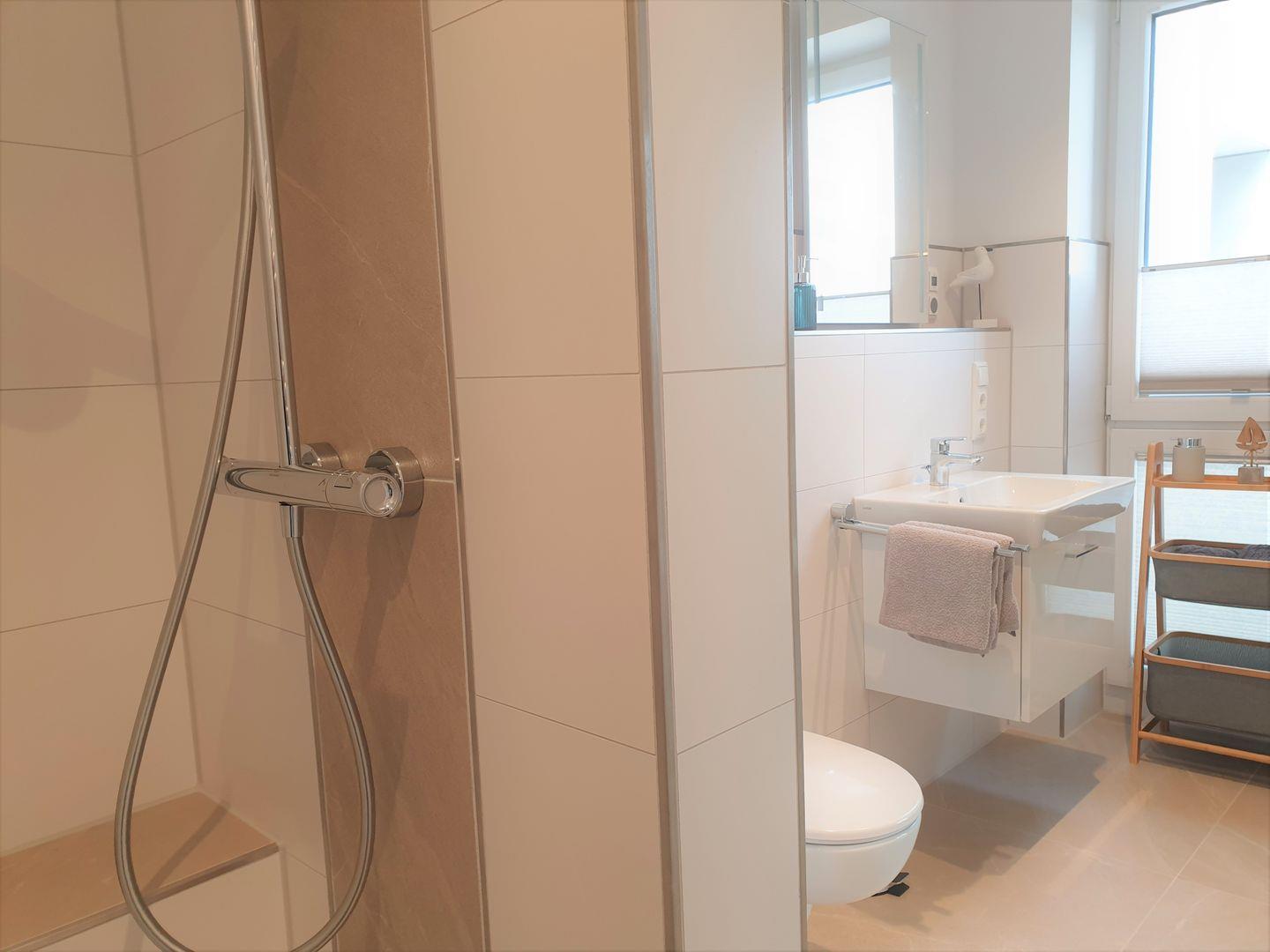 Bad und Sanitär: bodentiefe, barrierefreie Regenwalddusche, Waschtischanlage mit Spiegel, WC, Handtuchheizung, Einbauradio, Handtücher (1 Duschtuch + 2 Handtücher) und Bettwäsche auf Anfrage