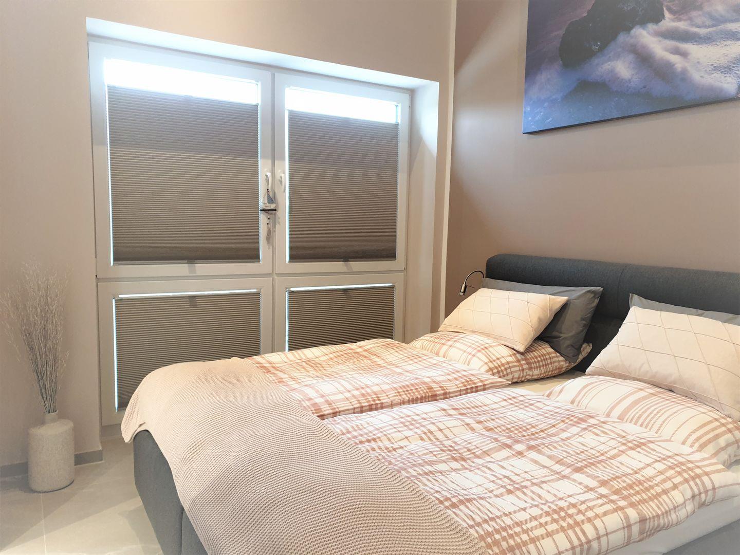 Schlafzimmer: Doppelbett (Maße: 180 x 200 cm), Kleiderschrank, Fernseher