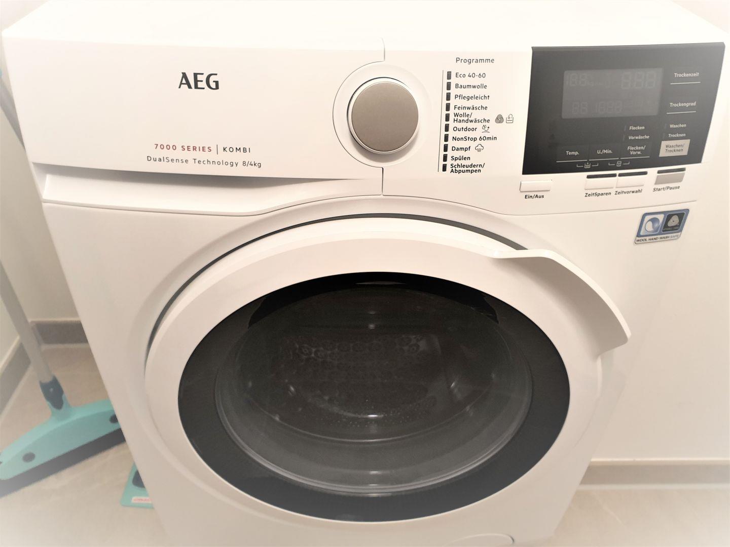 Abstellraum: Balkonhängetrockner, Staubsauger, Waschmaschine mit integrierter Trocknerfunktion, diverse Putzutensilien