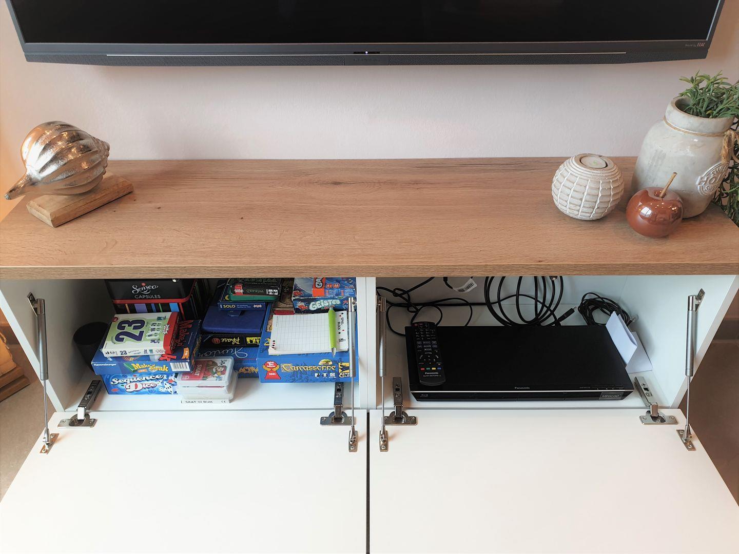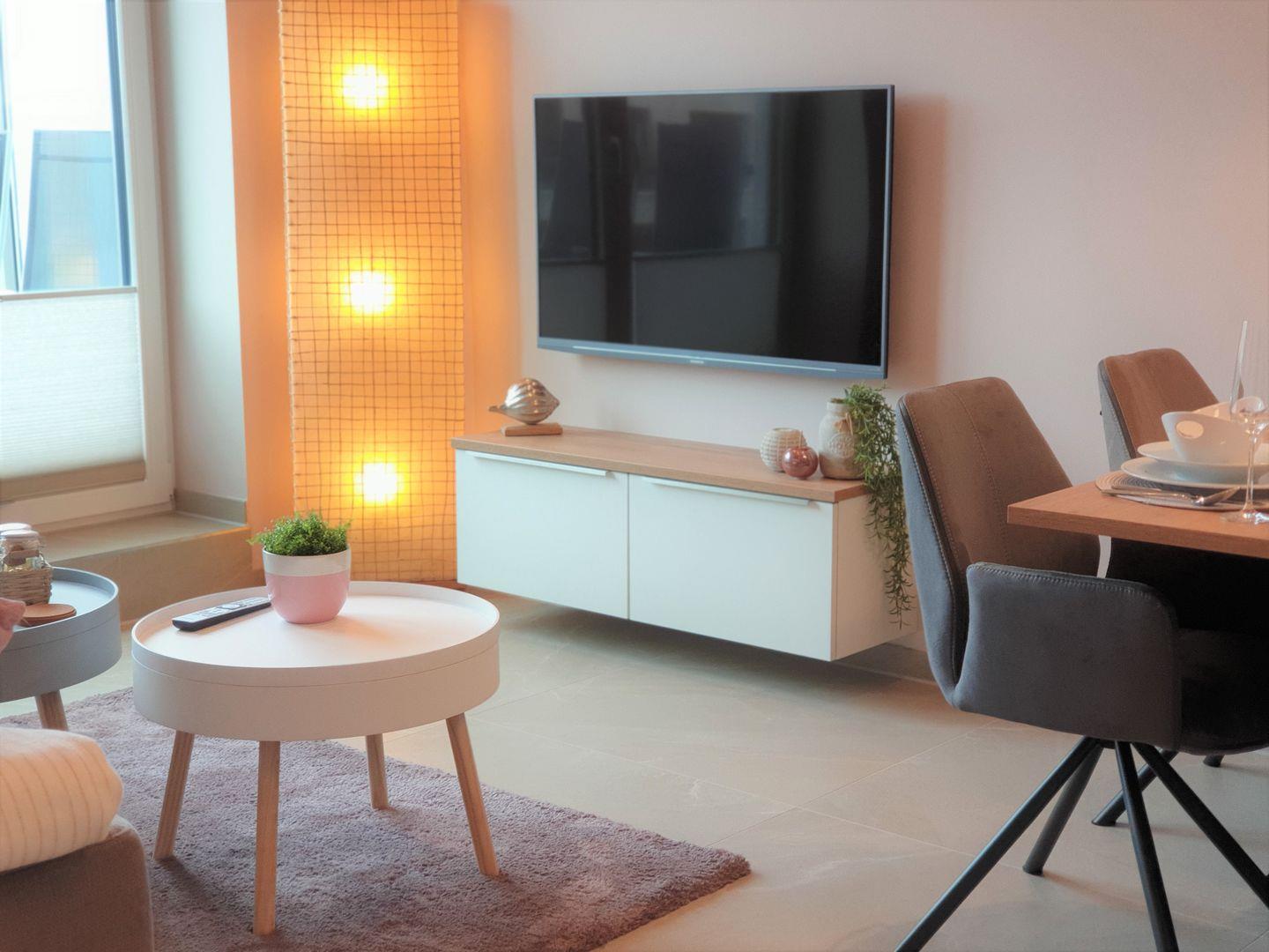 Wohnzimmer: Schlafsofa (Maße: 180 x200 cm), Flachbildfernseher, Empfang deutschsprachiger TV-Programme (SAT-Anlage), DVD-Player, großzügige Spielesammlung