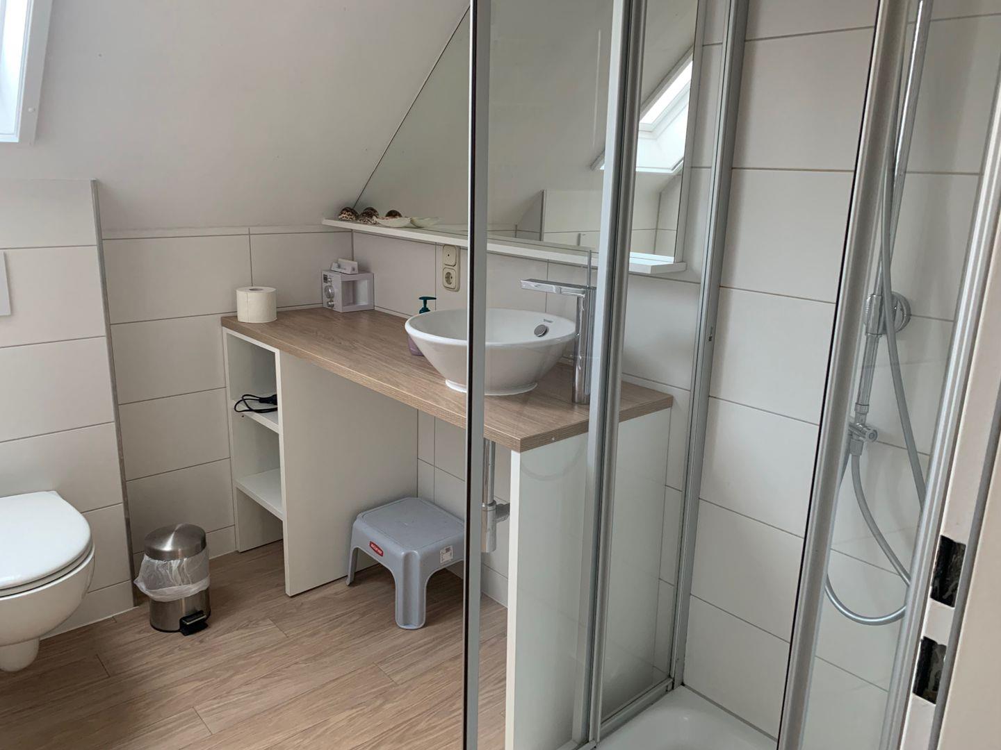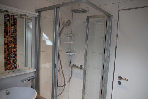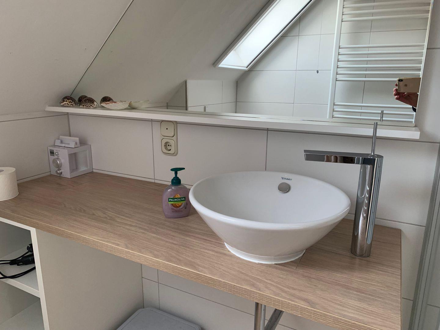 Eine geschwungene Treppe führt in das Obergeschoss. Hier befindet sich das große Schlafzimmer mit (Flatscreen) und Einbauschränken. Besonderen Wert wird auf das Designer-Badezimmer mit Sommerregendusche der besonderen Fliesenkunst gelegt. Ein Fenster ist ebenfalls im Bad vorhanden. Es gibt ein Einzelzimmer mit Einzelbett. Von dort gelangen Sie über eine fest installierte Holztreppe in die ausgebaute Dachgalerie mit 2 Einzelbetten.