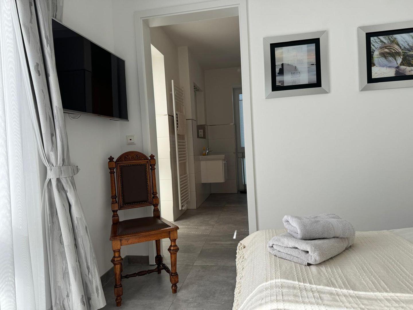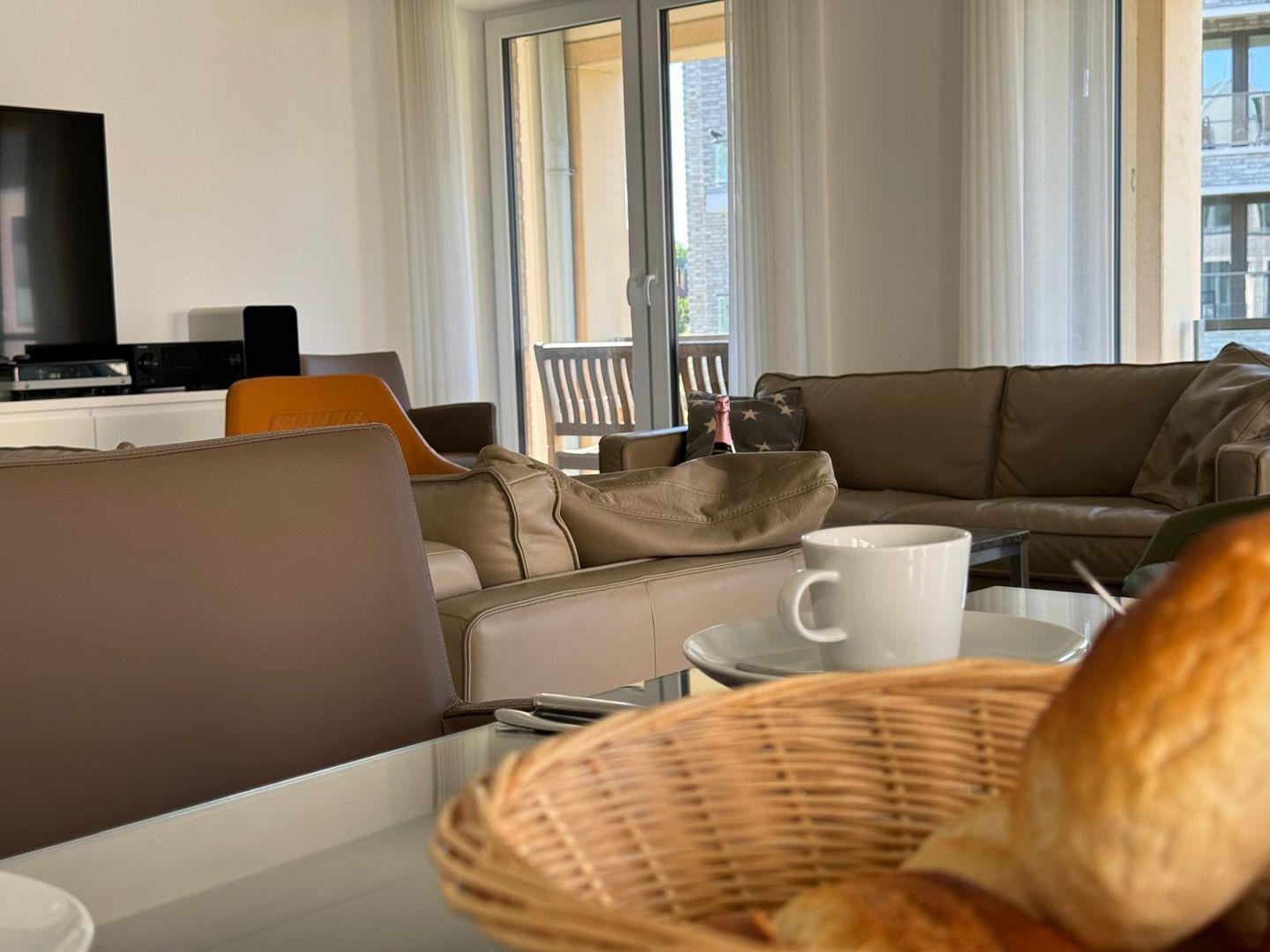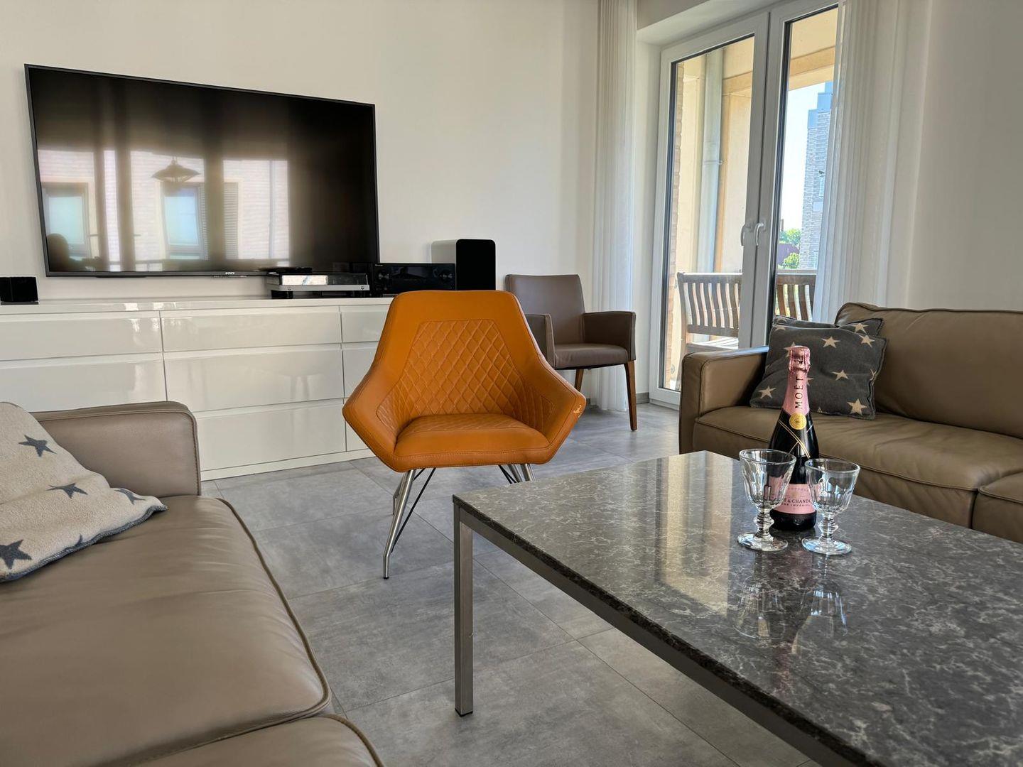 Zur weiteren Ausstattung gehören ein feines Wohnzimmer mit Sofa und TV, WLAN für digitale Entspannung sowie zahlreiche nützliche Utensilien wie Bügeleisen, Waschmaschine und Staubsauger.