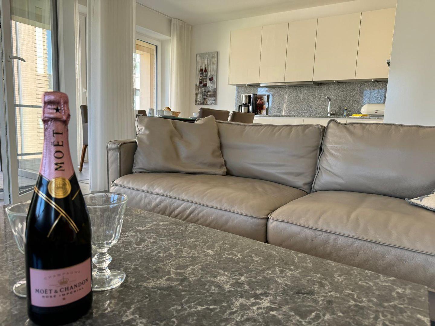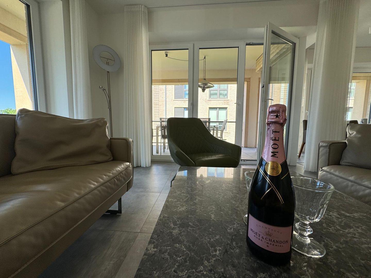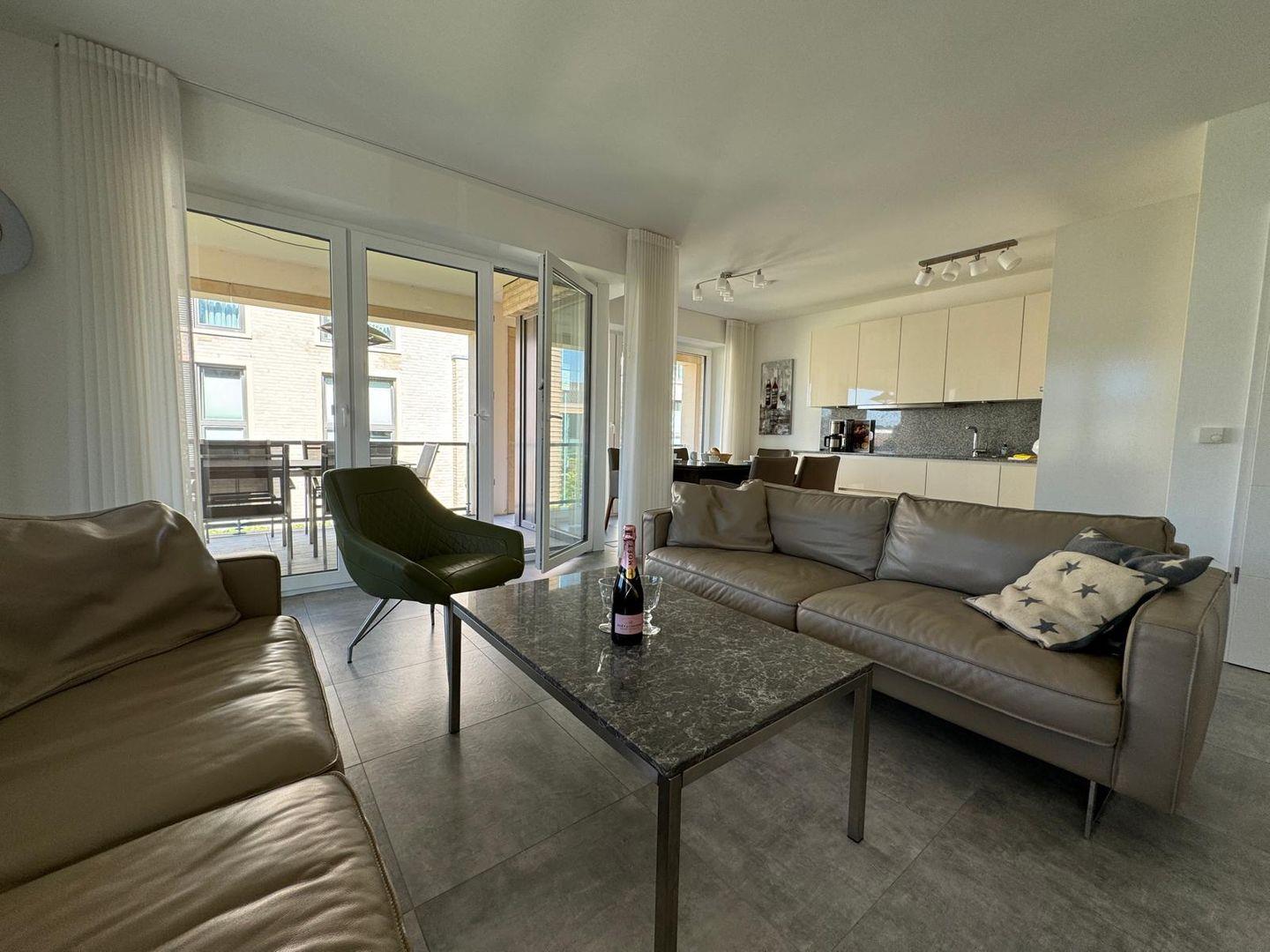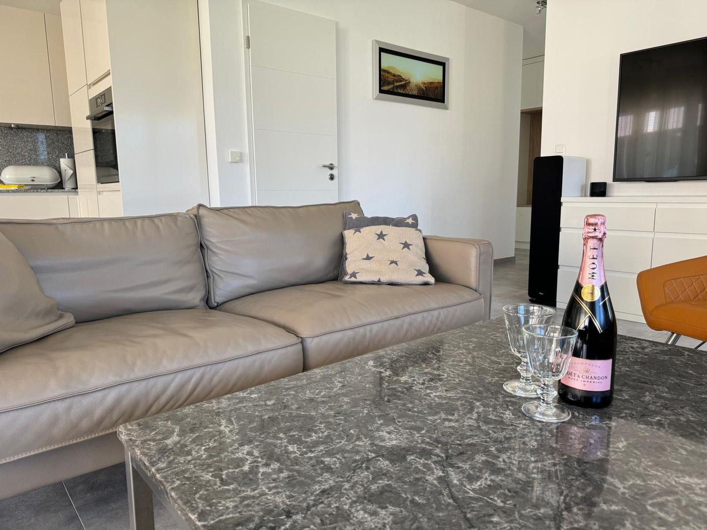 Zur weiteren Ausstattung gehören ein feines Wohnzimmer mit Sofa und TV, WLAN für digitale Entspannung sowie zahlreiche nützliche Utensilien wie Bügeleisen, Waschmaschine und Staubsauger.