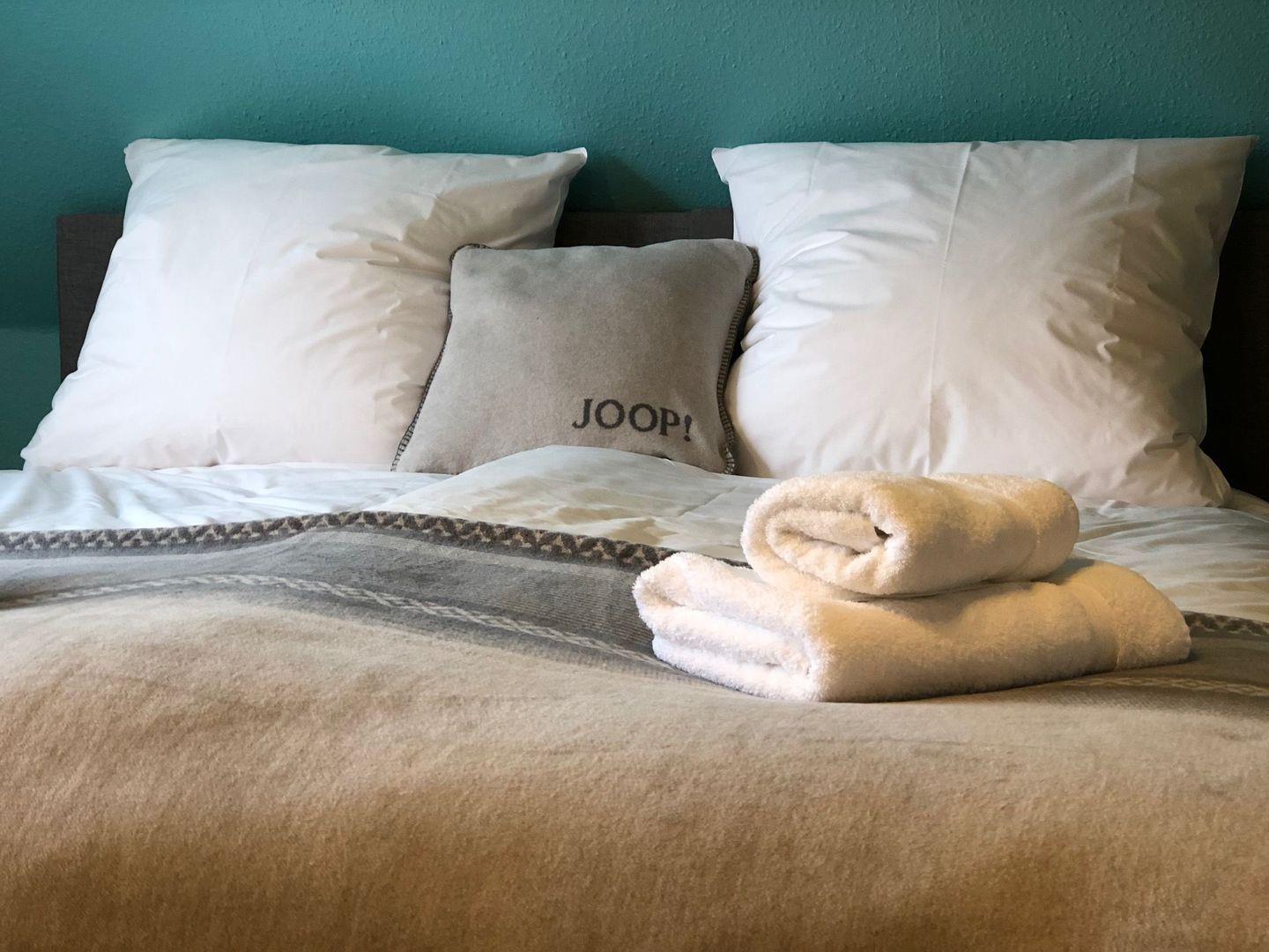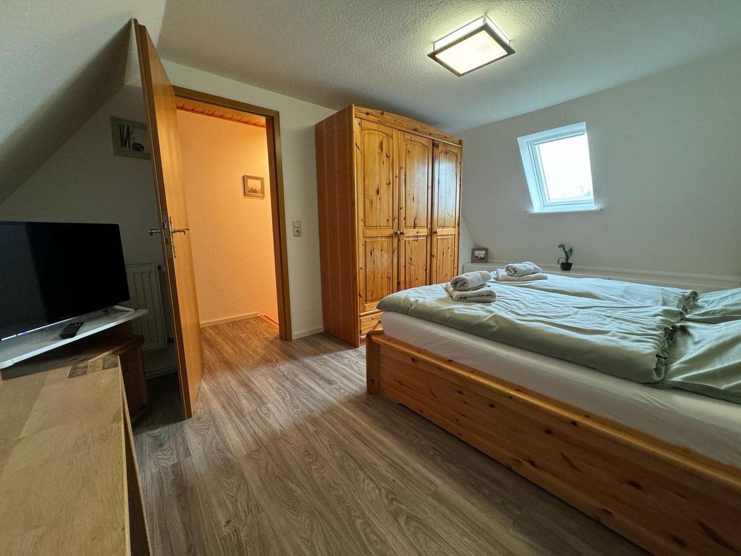 Gegenüber liegt die moderne neue und große Wohnküche. Hier ist Platz auf der Bank und am großen Tisch für die ganze Familie. Eine massive Treppe führt in das Obergeschoss. Hier befindet sich das große Schlafzimmer mit Bockspringbett ( elektrisch verstellbar) einer hübschen Sitzecke und dem Kleiderschrank.