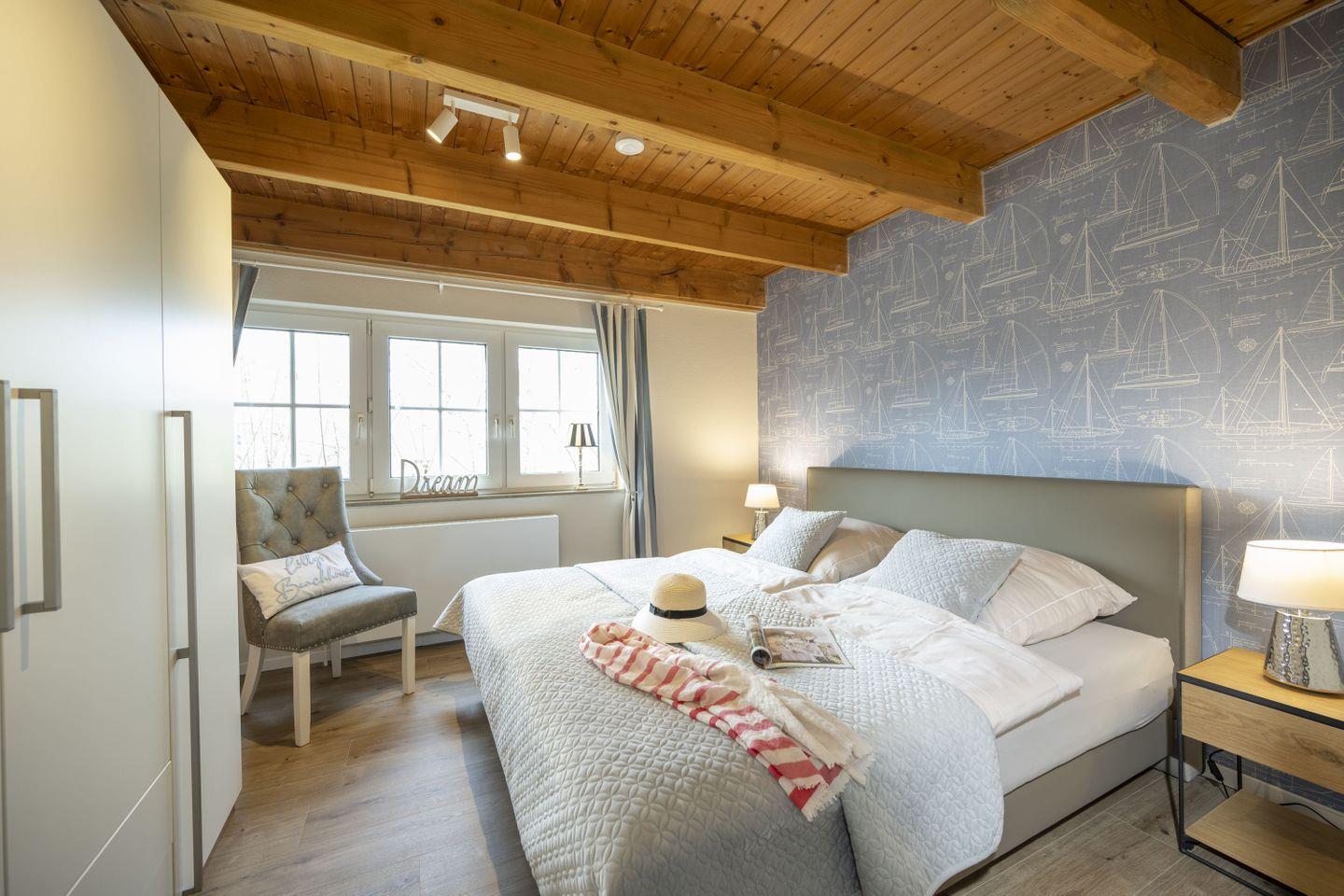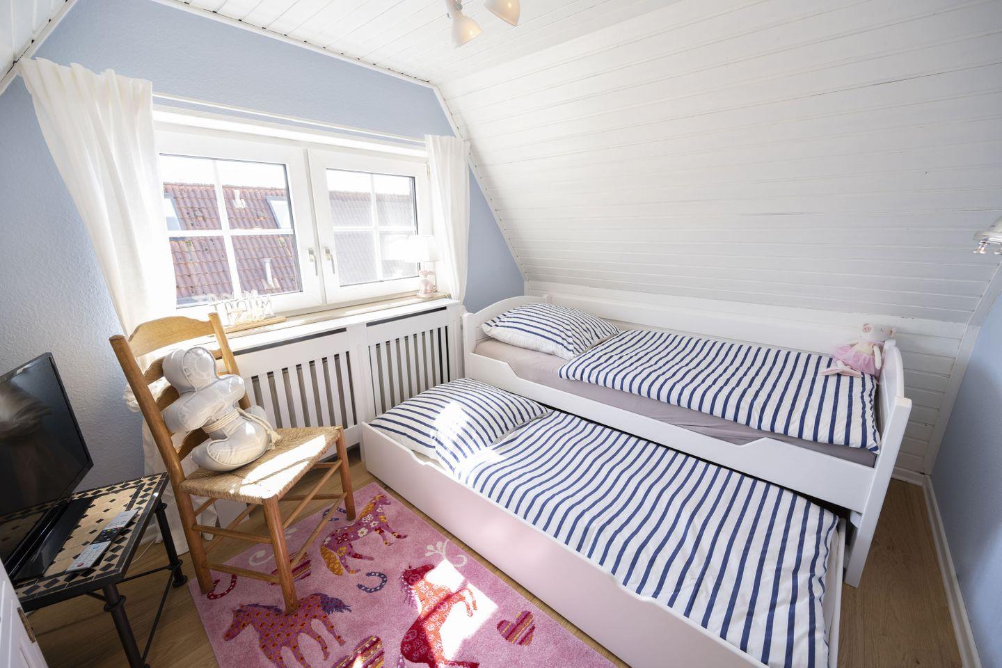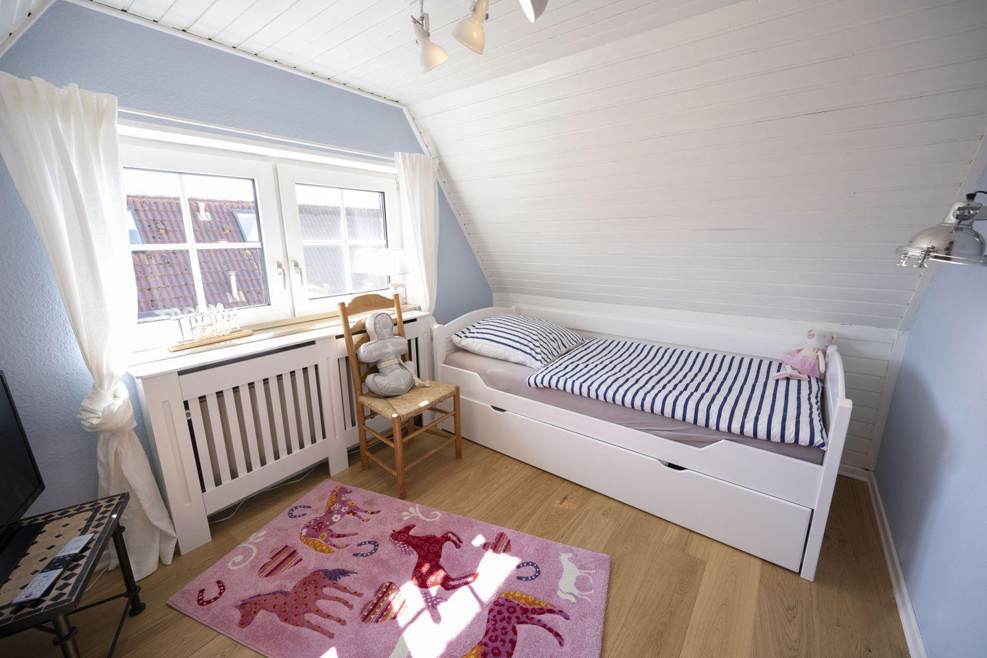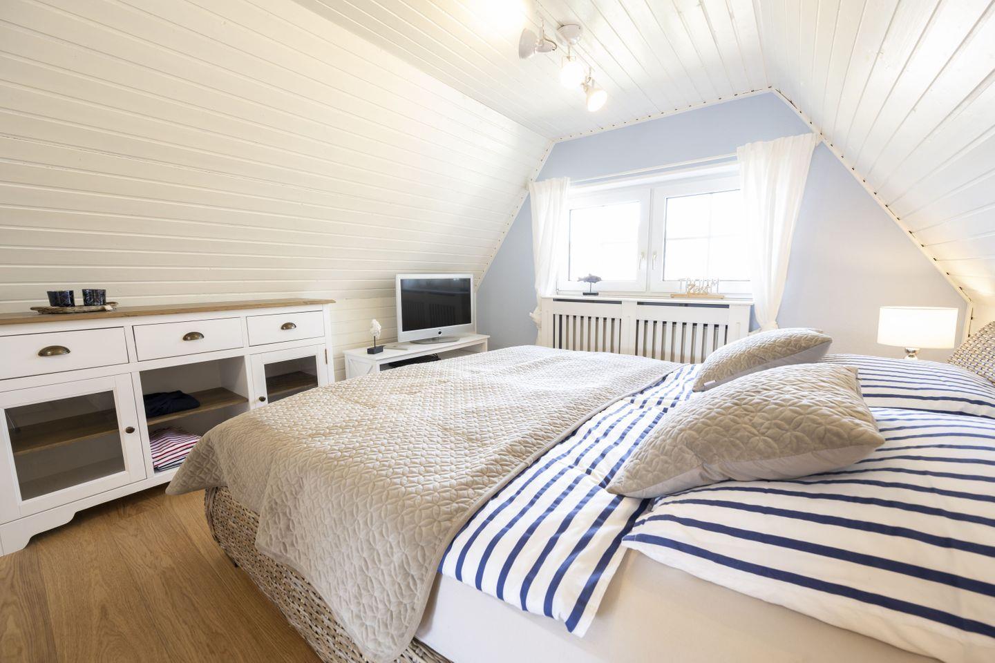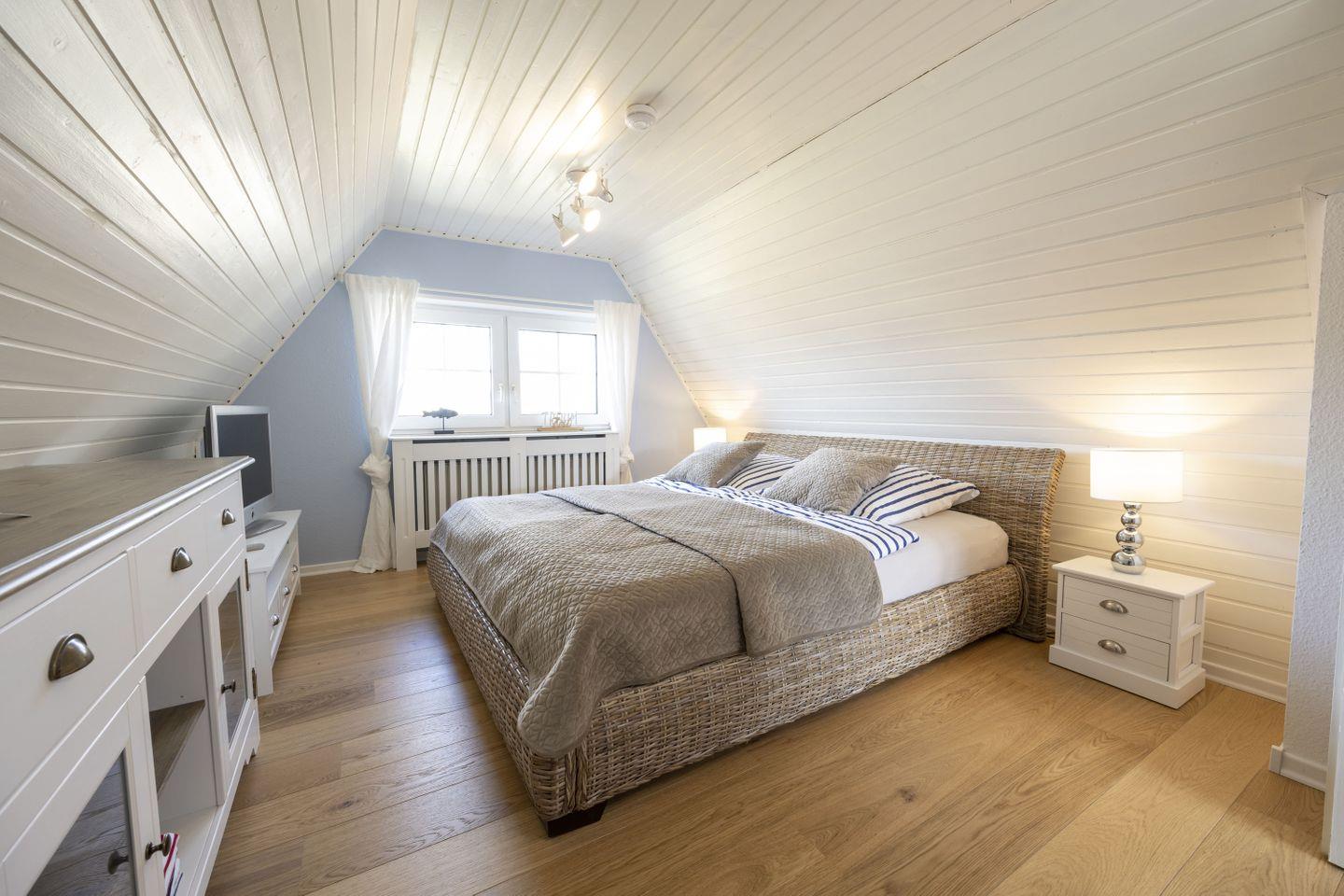 Im Dachgeschoß befindet sich ein weiteres stylisches Schlafzimmer mit einem Rattan Bett (1,80 x 2,00 m) Fernseher und Parkettfußboden und noch ein weiteres, hochwertig eingerichtetes Zimmer mit Funktionsbett (Liegefläche 0,90 x 2,00 m), 2. Liegeplatz im ausziehbaren Bettkasten (Liegefläche 0,90 x 1,90 m) Fernseher und ebenfalls ein Parkettboden.