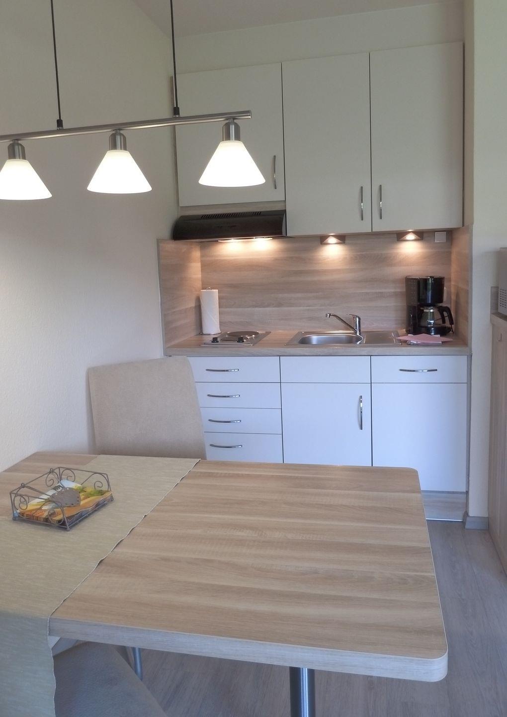 Die Wohnung ist natürlich voll ausgestattet. Die Küche enthält Geschirrspüler, 2-Platten Kochfeld, Kühlschrank, Kombimikrowelle, Wasserkocher, Kaffeemaschine, Toaster sowie ausreichend Geschirr und Besteck.